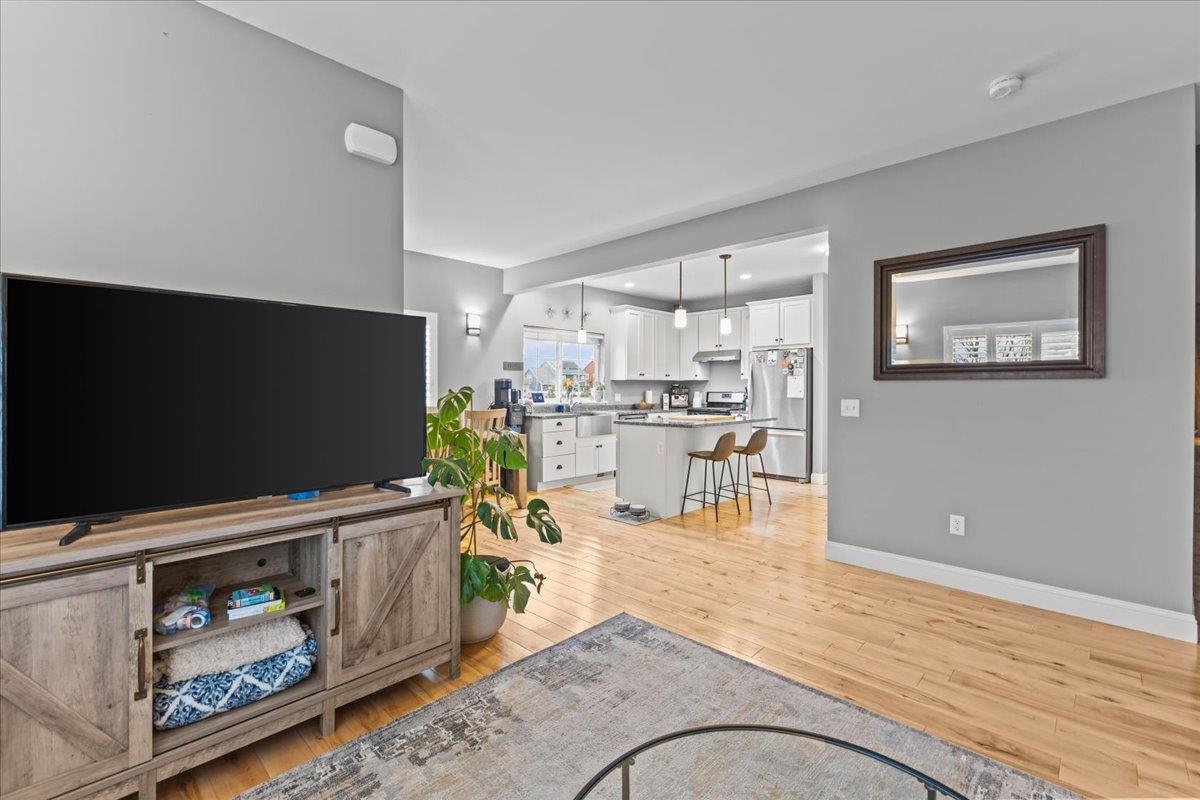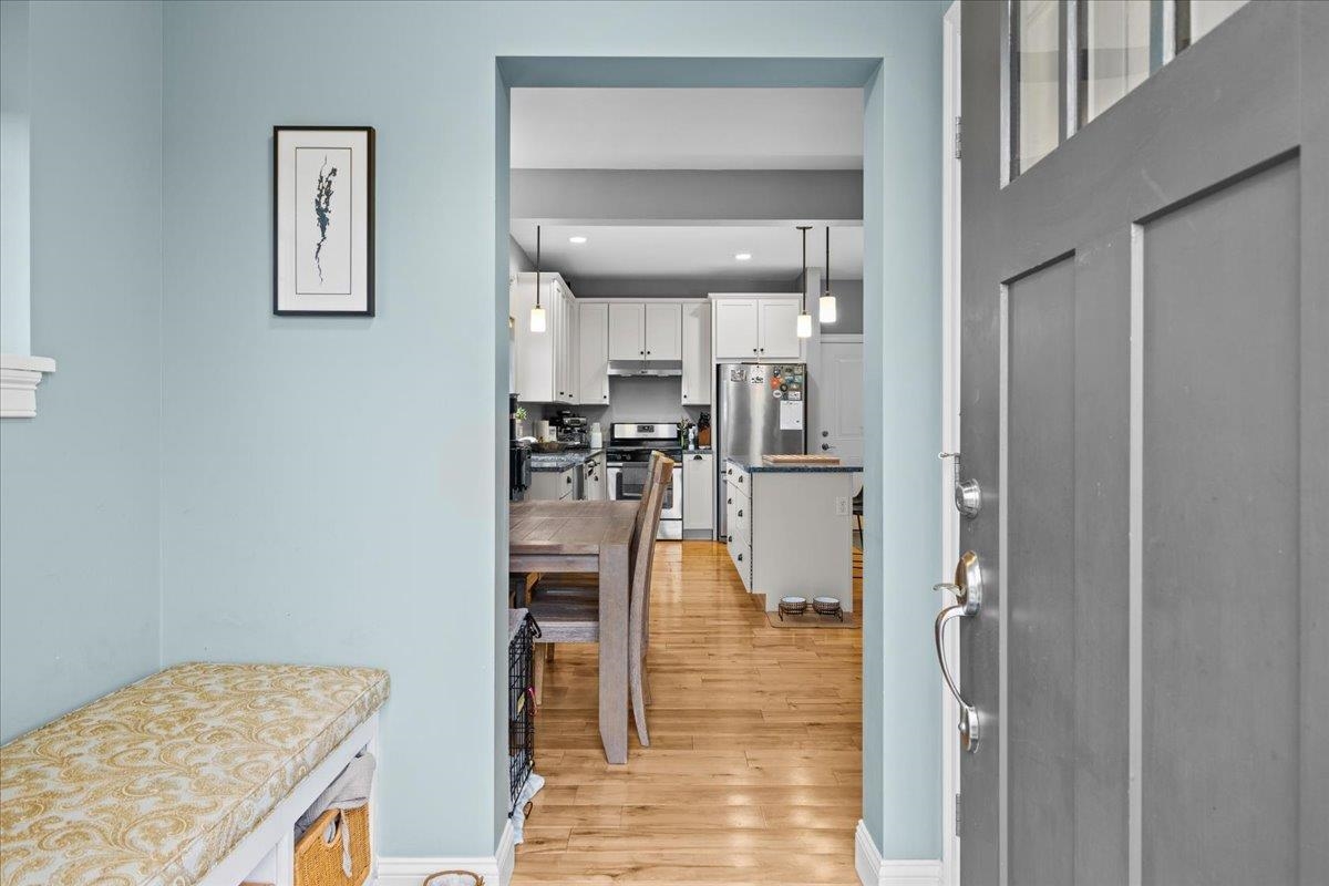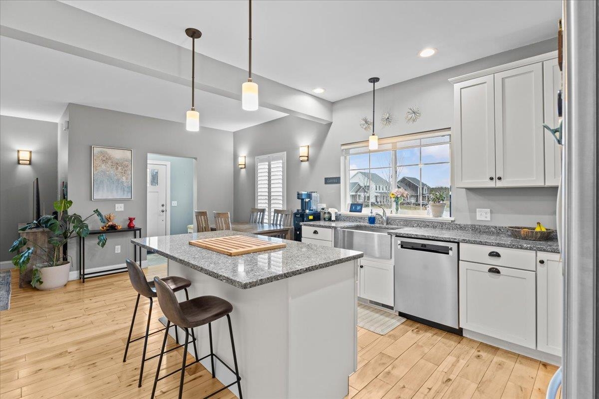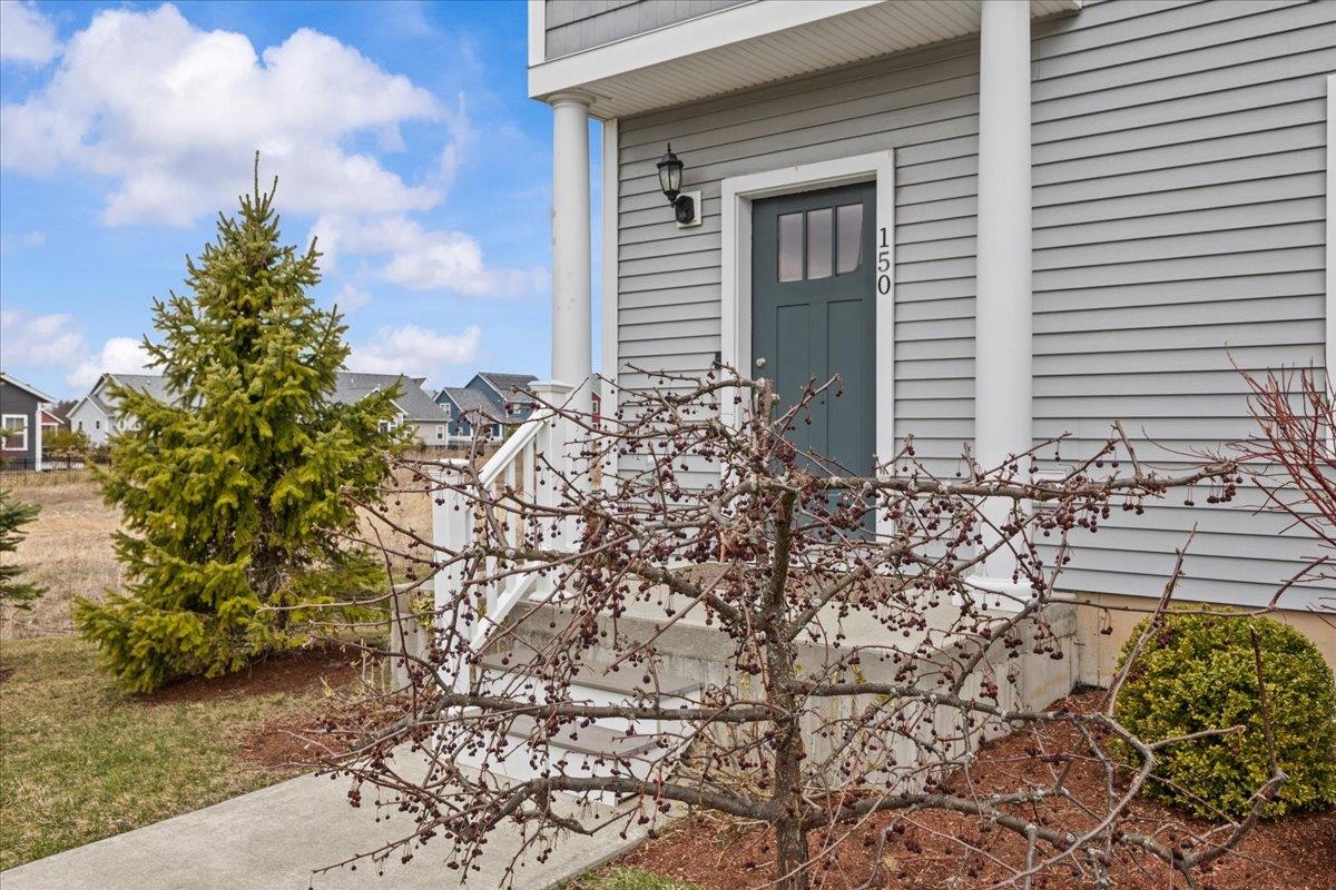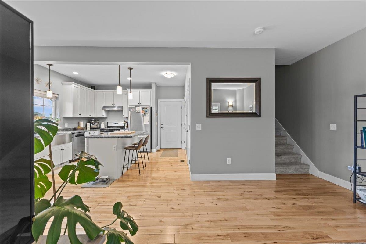 This inviting and well maintained end-unit home offers comfort, privacy, and thoughtful upgrades throughout. The main level features a bright, open concept layout with a spacious kitchen, hardwood floors, living, and dining area, perfect for everyday living and entertaining. The kitchen is beautifully appointed with upgraded cabinetry, granite countertops, a vented hood, pot drawers, a spice cabinet, and breakfast island. All 3 bedrooms are tucked away on the second floor for added privacy. The finished basement expands your living space with a cozy living room, workout area, laundry room, and abundant storage, complete with durable waterproof luxury vinyl plank flooring. Enjoy peaceful views from the kitchen overlooking the neighborhood walking path and playground. Located in the desirable Rye Meadow community, this end unit home sits in a quiet setting of single-family homes and townhomes, offering exceptional privacy. Outdoor enthusiasts will love easy access to hiking and biking paths. Close to Burlington, schools, shopping and restaurants this location cannot be beat!