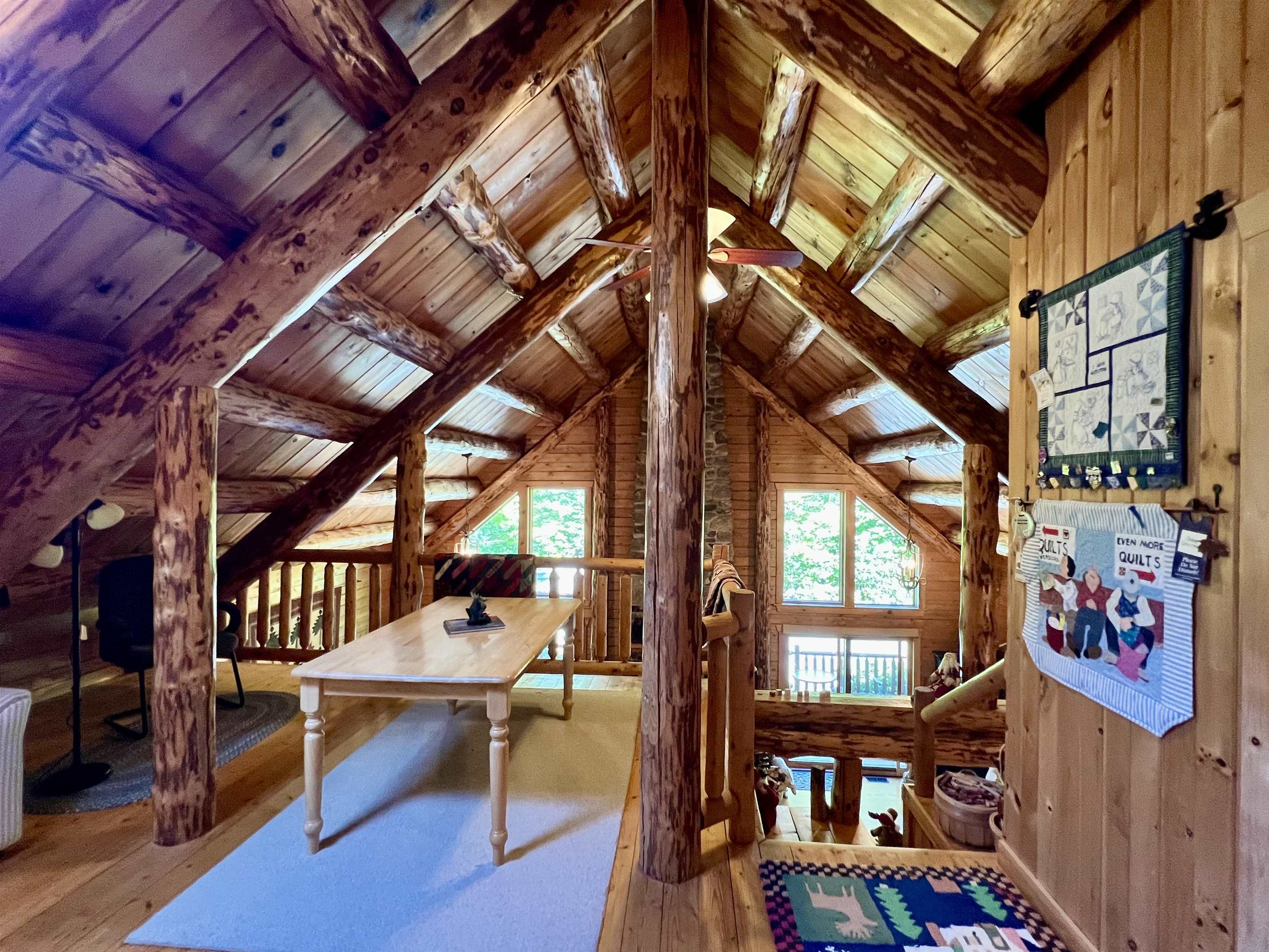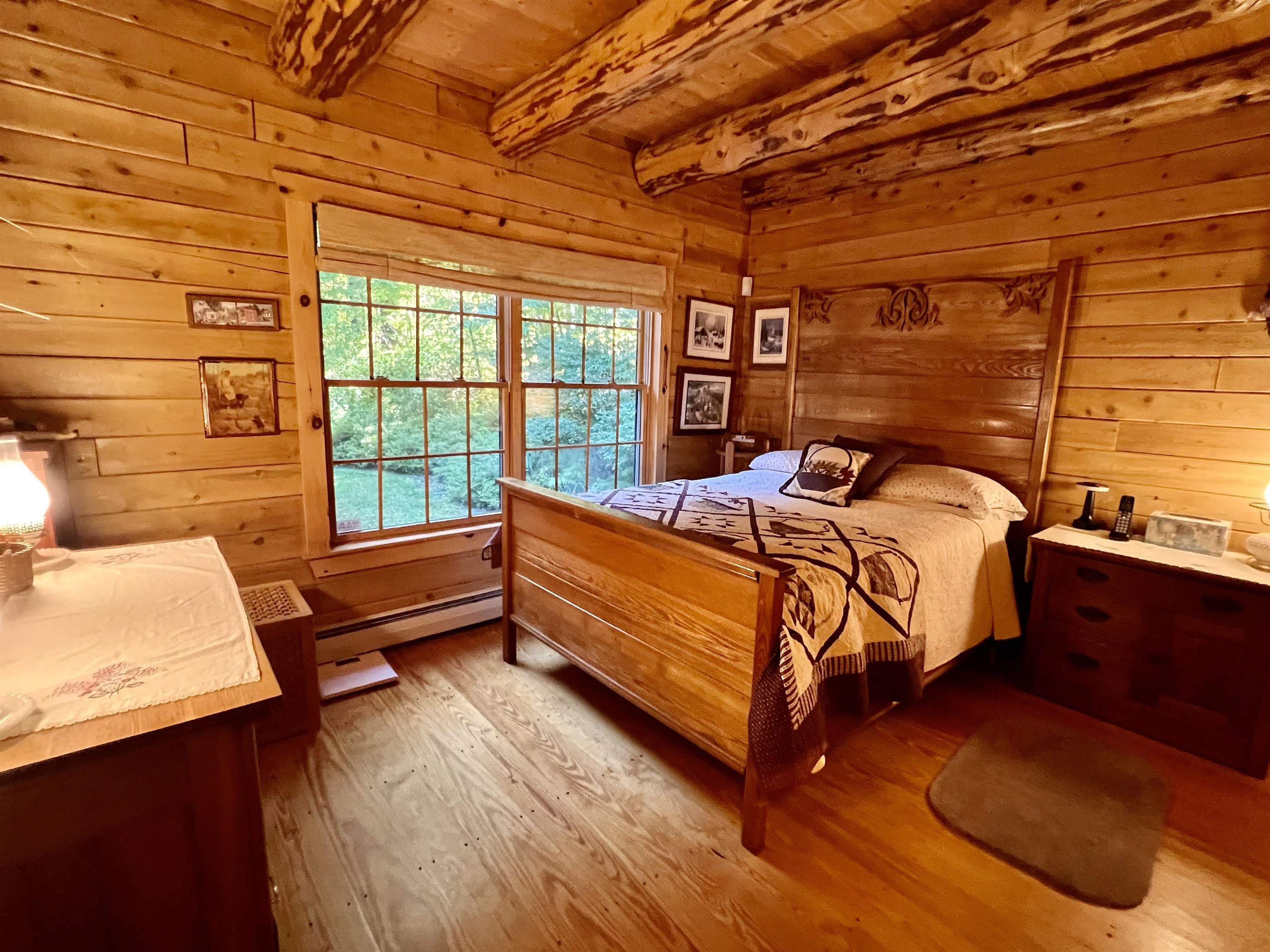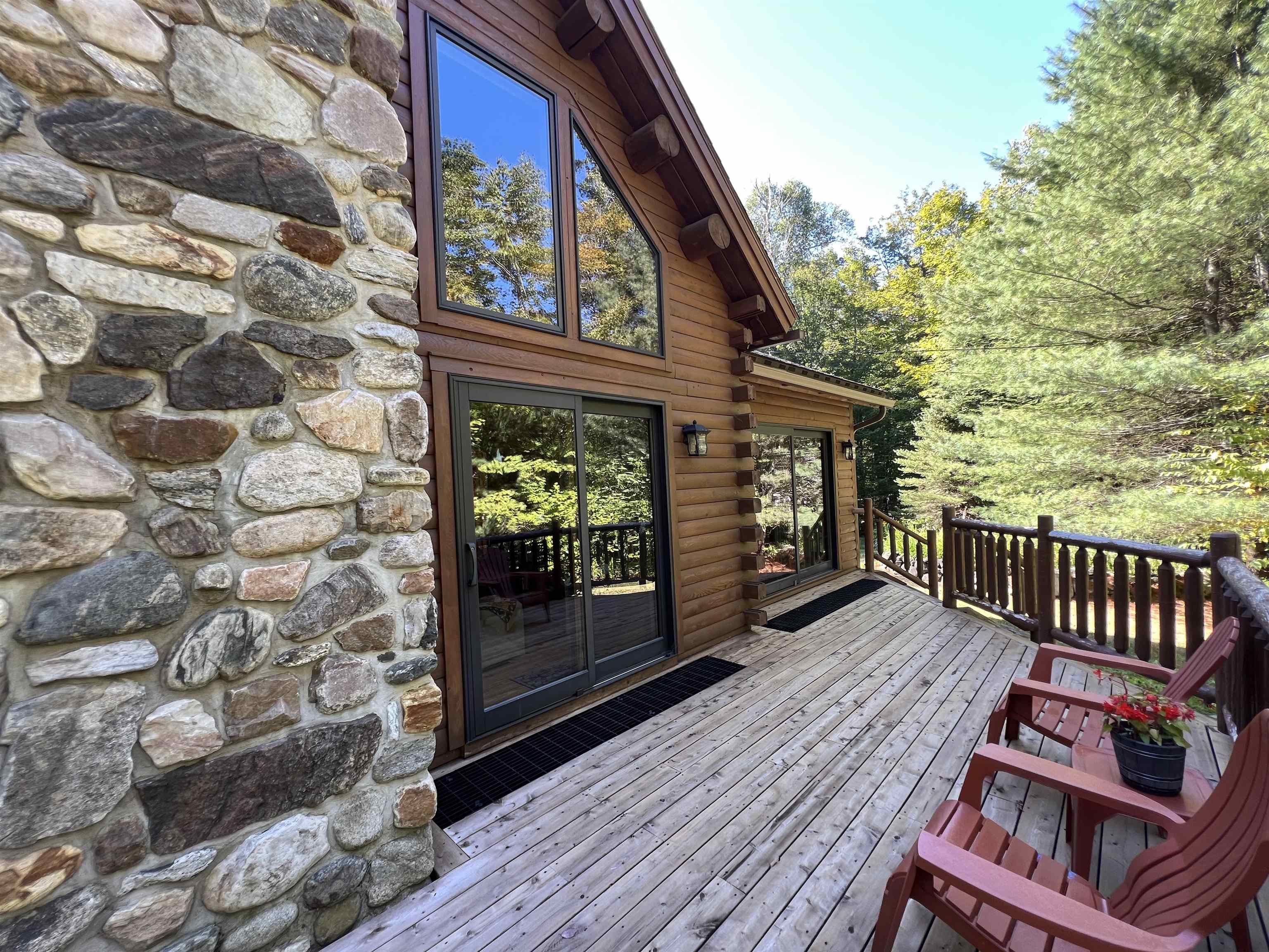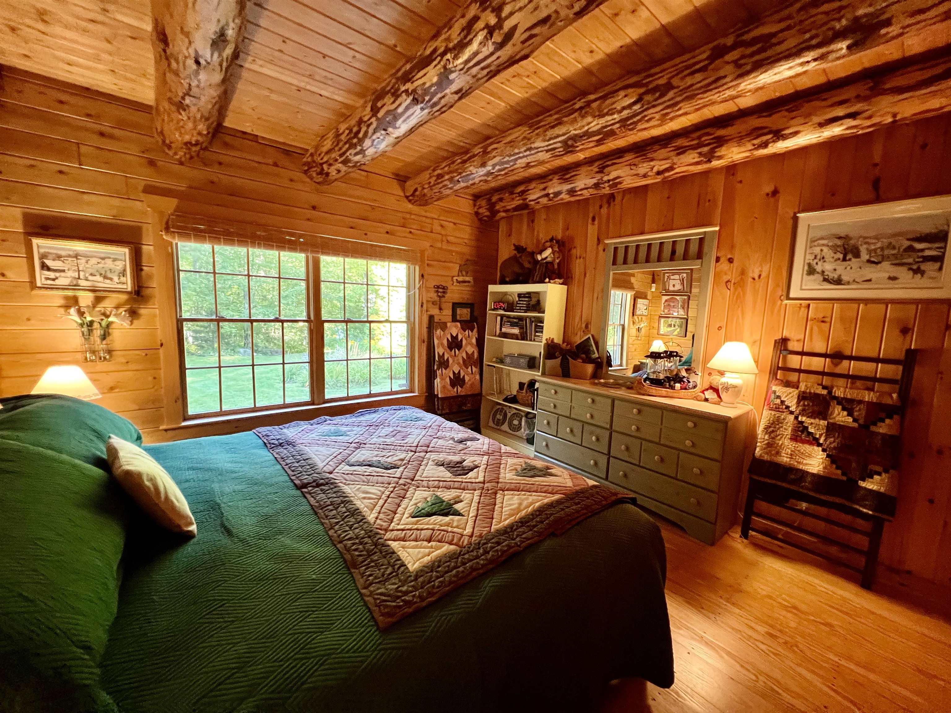 Nestled in the heart of Vermont’s Green Mountains, check out this stunning Moosehead log home. With private, shared access to Lake Raponda just a short walk away, this inviting single-family home seamlessly blends rustic charm, modern comfort, and a serene natural setting. With 2, 170 sq. ft. of living space, this 3-bedroom, 2-bath home welcomes you with warmth and tranquility from the moment you arrive. Park your car in the attached garage and step inside to find a country kitchen with lots of cabinets that opens into a comfortable great room with a dramatic, wood burning, stone fireplace. The spacious great room features a dramatic cathedral ceiling and leads directly to a glassed-in porch / dining area—an ideal spot to enjoy morning coffee or simply unwind while taking in the view of the landscaped yard and surrounding trees. There are 2 bedrooms conveniently located on the main level, with the primary, ensuite bedroom on the upper level next to a sleeping loft. Large windows throughout ensure that every corner of this home feels bright and inviting, enhanced by tasteful log interior finishes that echo the natural beauty outside. One of the home’s most enticing features is its move-in readiness—the sellers are leaving most of the furnishings , a fully outfitted kitchen, and a couple of kayaks for the lake so you can settle right in and begin enjoying the Vermont lifestyle in front of the fireplace, on the deck, on the stone patio, or on the lake!