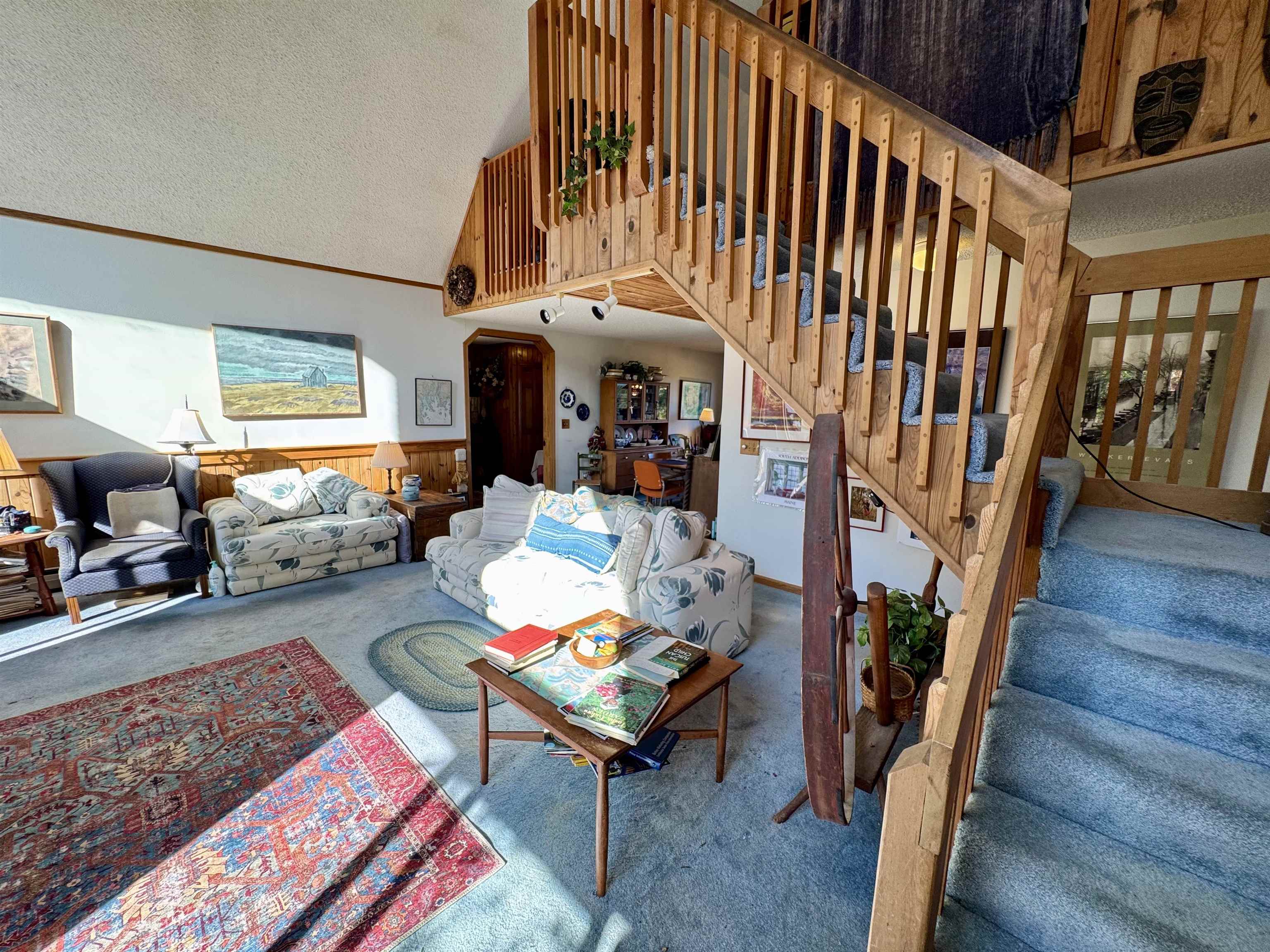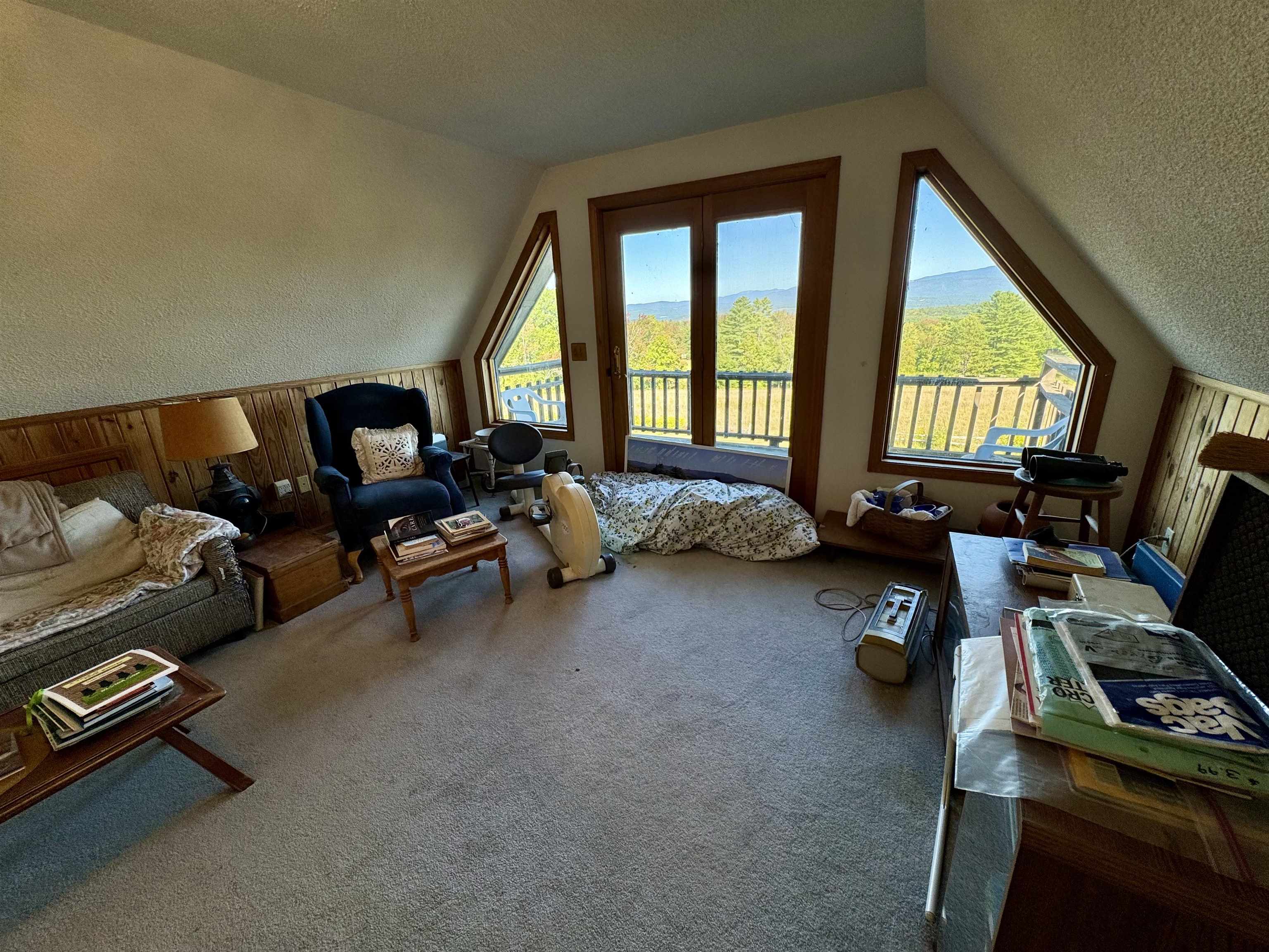 Looking east across the River Valley, this Contemporary home was designed to capture the natural beauty and long-range views. Set on 13.4 acres, the property includes a large open field, a peaceful swimming pond, and an outbuilding for storage, hobbies, or recreation. The home offers two expansive decks - one facing east with panoramic views, the other positioned for late day sun. Inside, a spacious entryway leads to an open living area with cathedral ceilings and a striking stone fireplace. The kitchen flows into a dining area with walkout access to the front deck, perfect for entertaining or quiet mornings. The primary suite features a full ensuite bath and walk-in closet. The home provides three bedrooms plus an office, offering flexibility for family, guests, or remote work. For horse lovers, there’s a large field, a paddock, and multiple stalls, ideal for riding and training. These areas can also be adapted for other animals. Additional highlights include a full basement with extra rooms and a four-stall barn ready for use as storage, workshop space, or animal care. The location provides easy access to Bradford's shops and restaurants while offering the privacy and space of a country retreat.