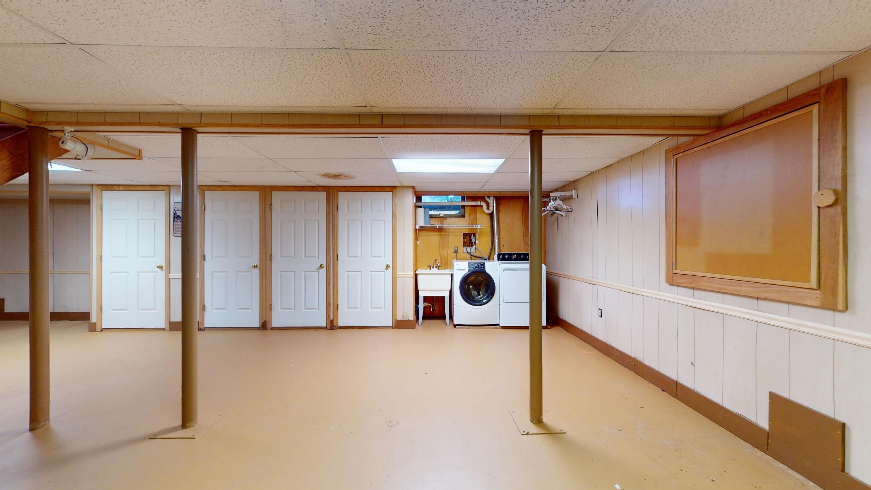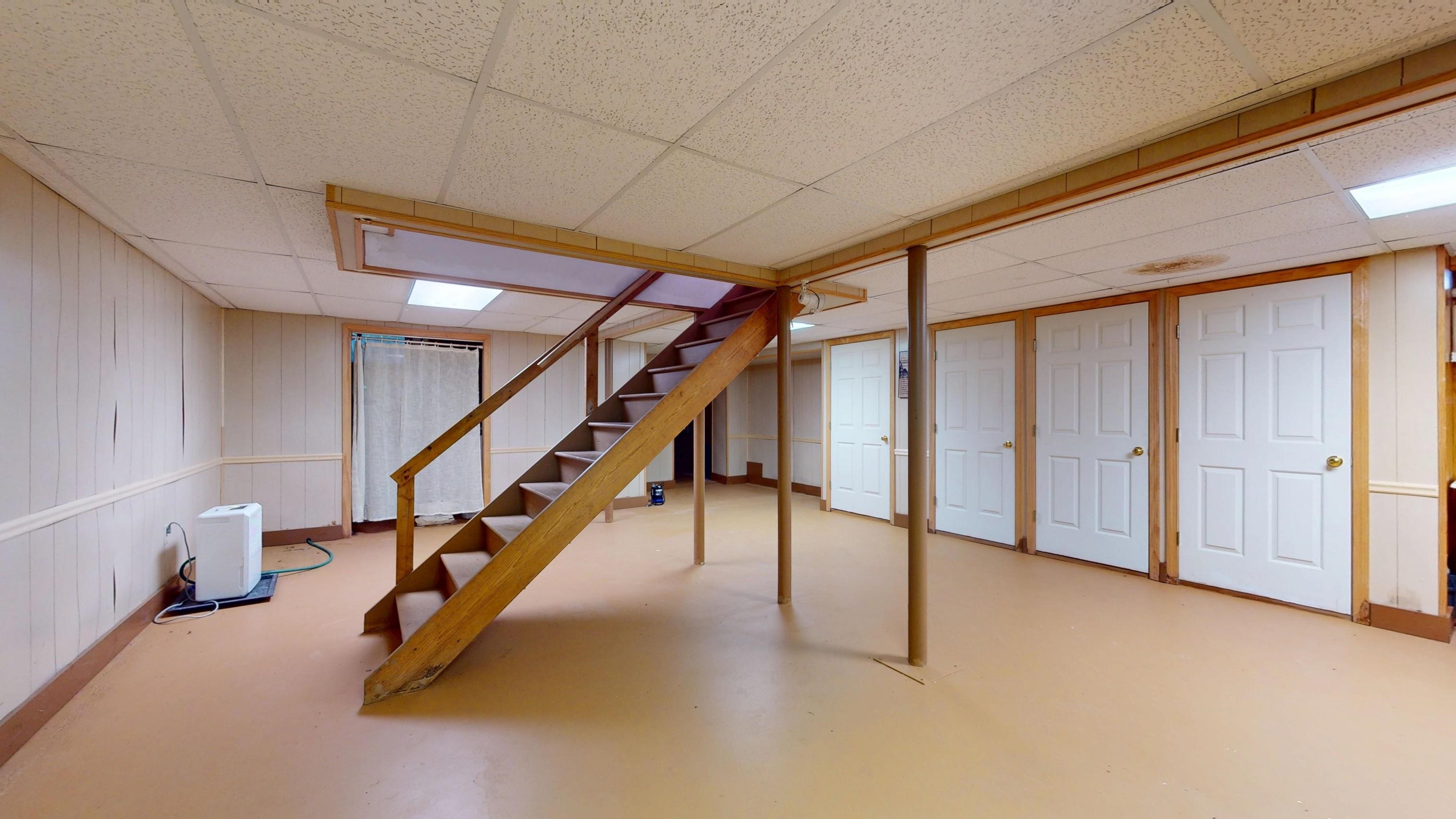 - Bulkhead, Concrete, Concrete Floor, Crawl Space, Full, Interior Stairs, Storage Space, Sump Pump, Unfinished, Interior Access, Exterior Access, Basement Stairs