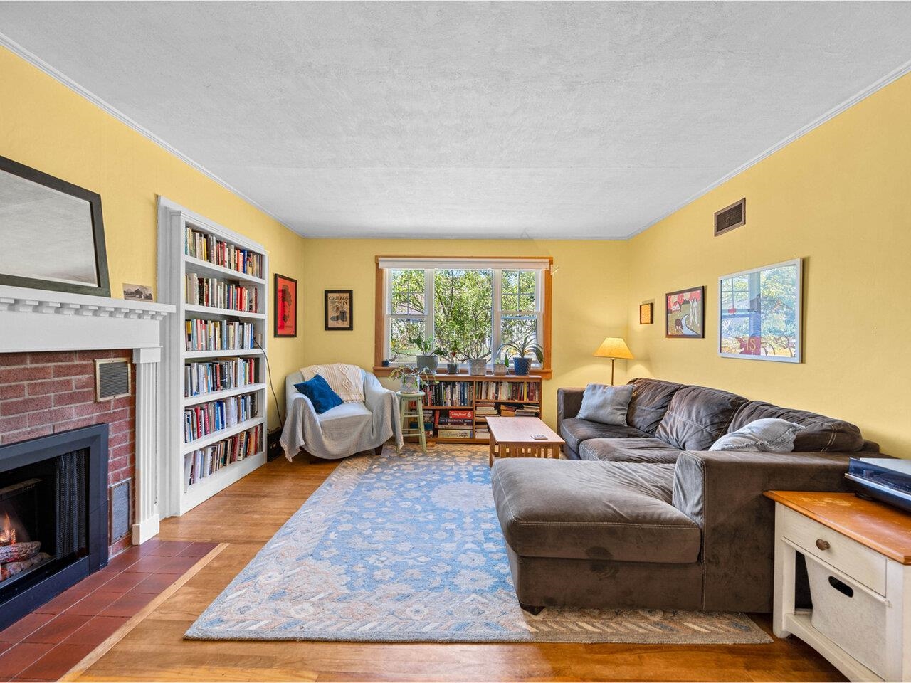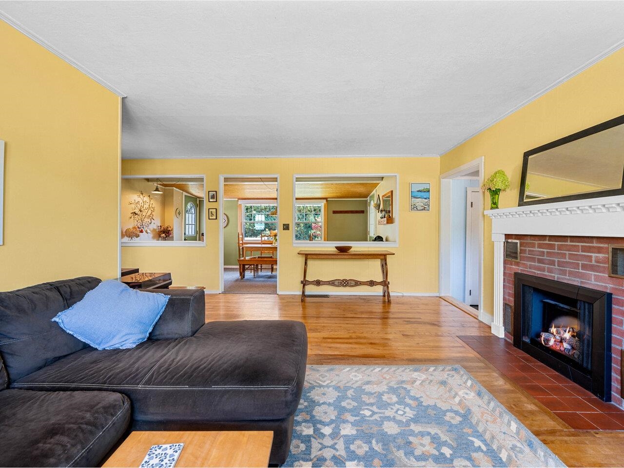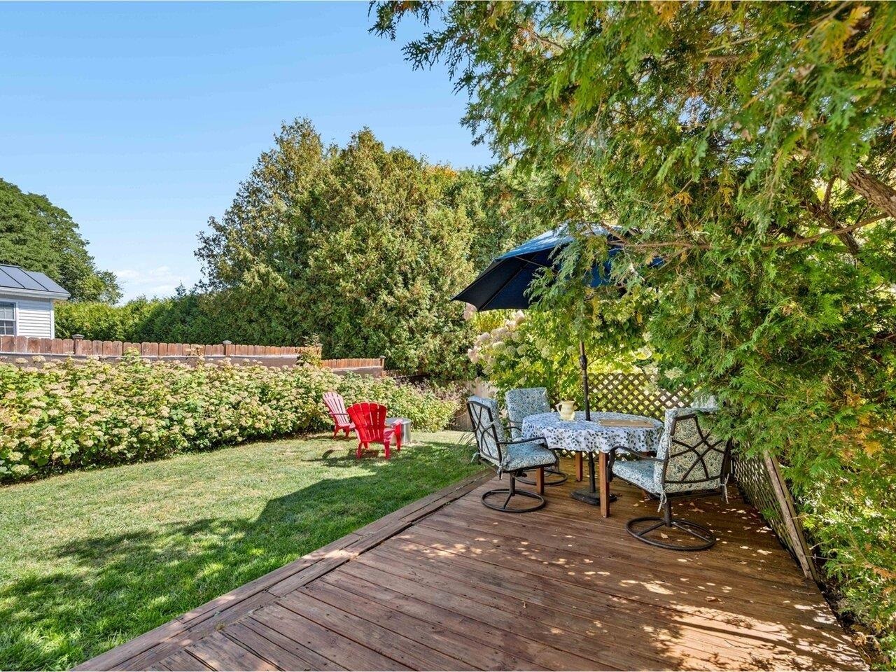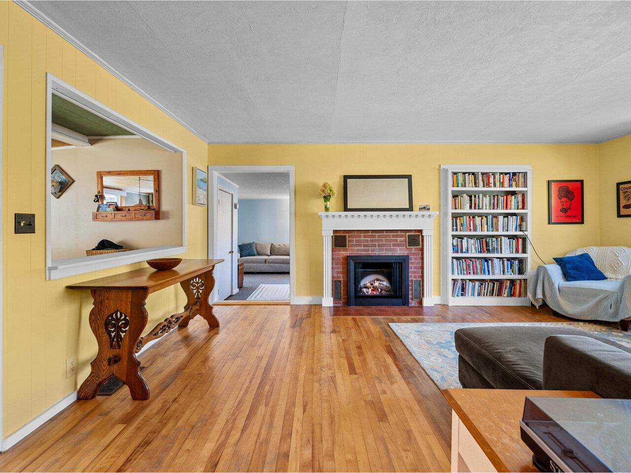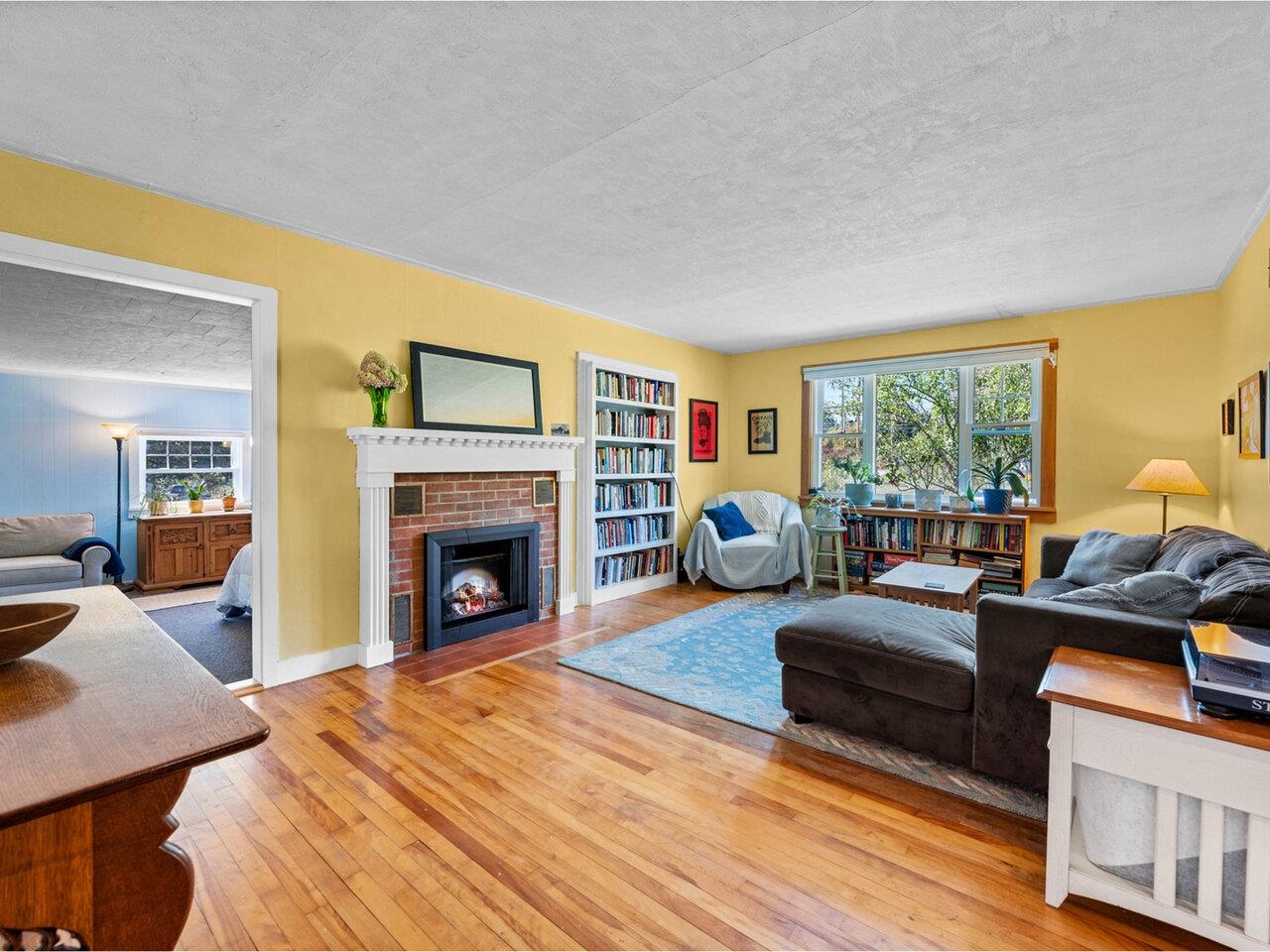 Charming, two-bedroom, one-bath ranch-style home brimming with character inside and out! Step inside off the spacious covered porch to the open-concept living/dining area filled with natural light. A brick fireplace, built-in bookshelves, and hardwood floors add to the inviting ambiance in the living room. The kitchen boasts maple butcher block counters, a large stainless sink, and updated dishwasher and refrigerator. Two sunny bedrooms and a full bath complete the layout, offering peaceful retreats with plenty of charm. The clean, dry basement features laundry and plenty of room for storage, working out, a craft space, or workshop. The fenced-in backyard is highlighted by a large deck and offers lots of space to play, garden, and enjoy the tranquility your own property. Shed for extra storage. Take advantage of the abundant nature trails abutting the nearby National Life property. Located in a great neighborhood with easy access to shops, restaurants, schools, I-89, and so much more!