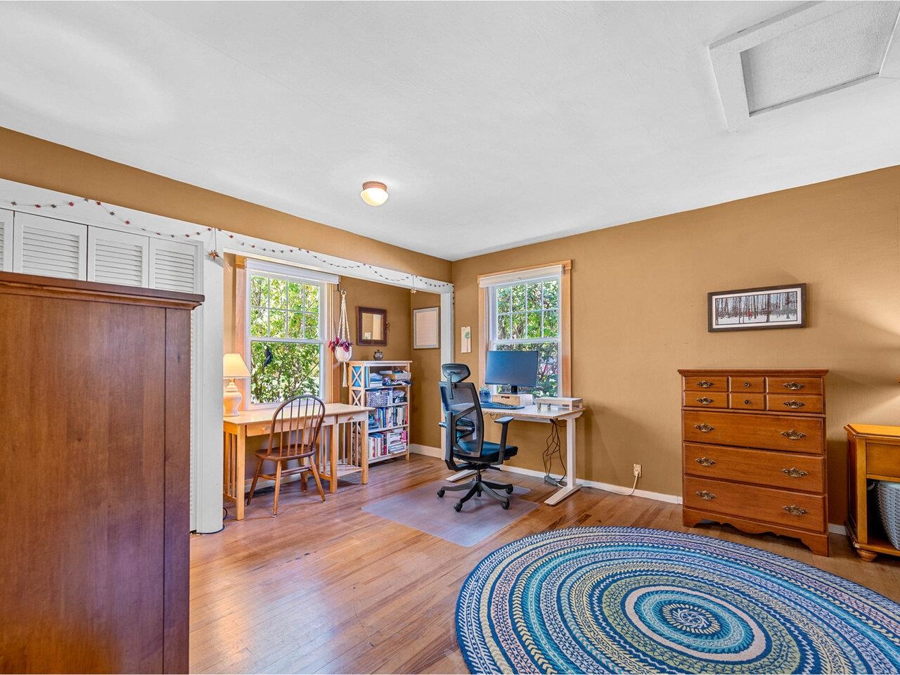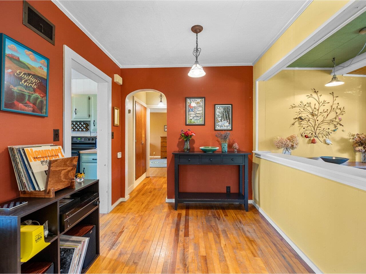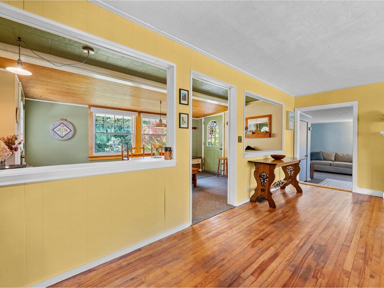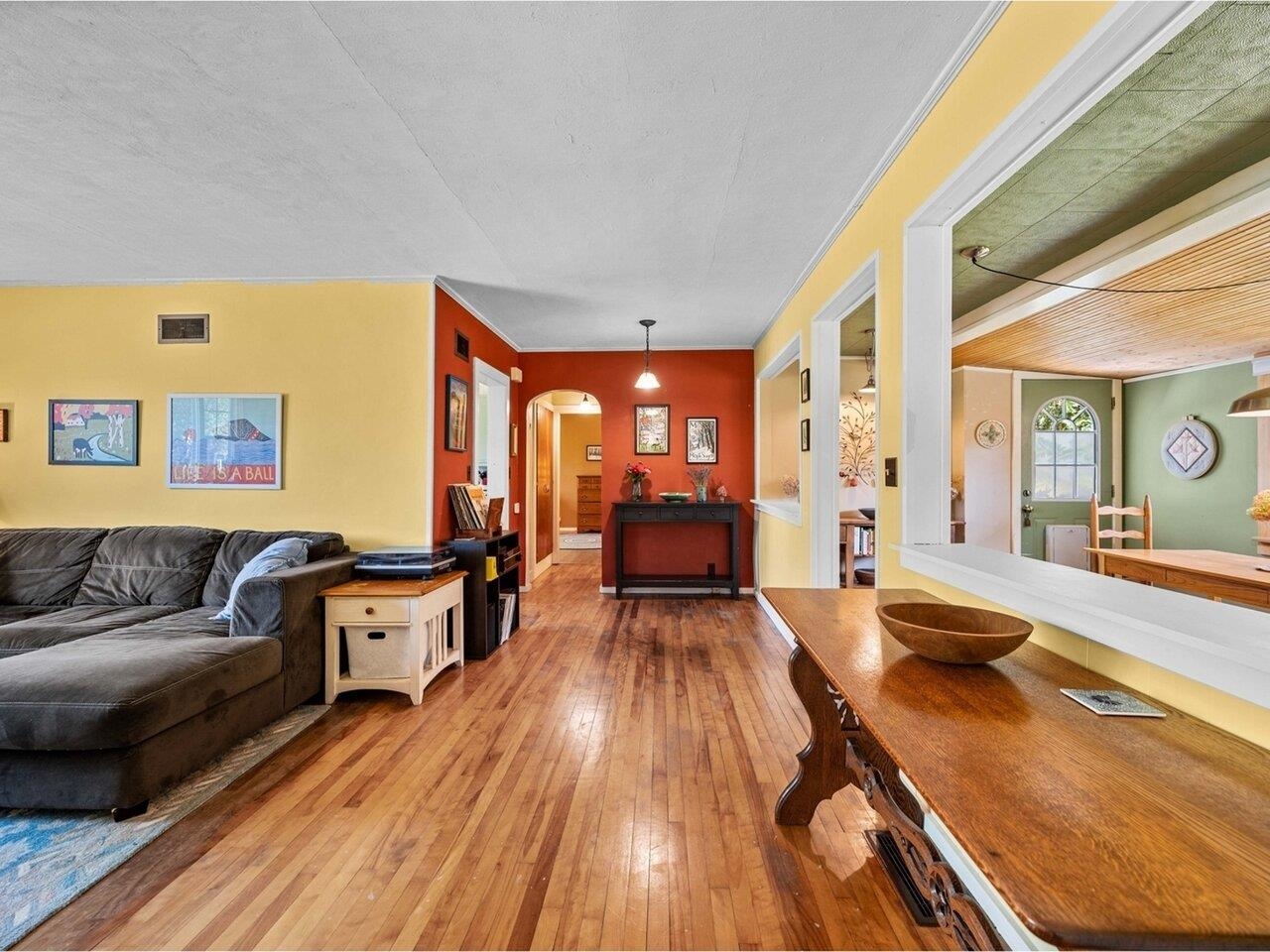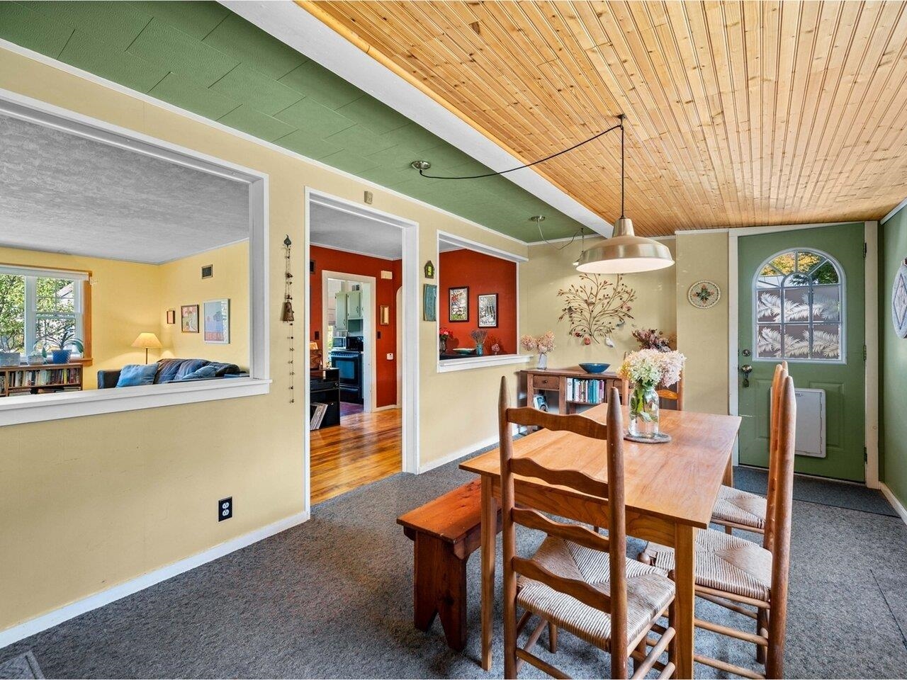 Charming, two-bedroom, one-bath ranch-style home brimming with character inside and out! Step inside off the spacious covered porch to the open-concept living/dining area filled with natural light. A brick fireplace, built-in bookshelves, and hardwood floors add to the inviting ambiance in the living room. The kitchen boasts maple butcher block counters, a large stainless sink, and updated dishwasher and refrigerator. Two sunny bedrooms and a full bath complete the layout, offering peaceful retreats with plenty of charm. The clean, dry basement features laundry and plenty of room for storage, working out, a craft space, or workshop. The fenced-in backyard is highlighted by a large deck and offers lots of space to play, garden, and enjoy the tranquility your own property. Shed for extra storage. Take advantage of the abundant nature trails abutting the nearby National Life property. Located in a great neighborhood with easy access to shops, restaurants, schools, I-89, and so much more!