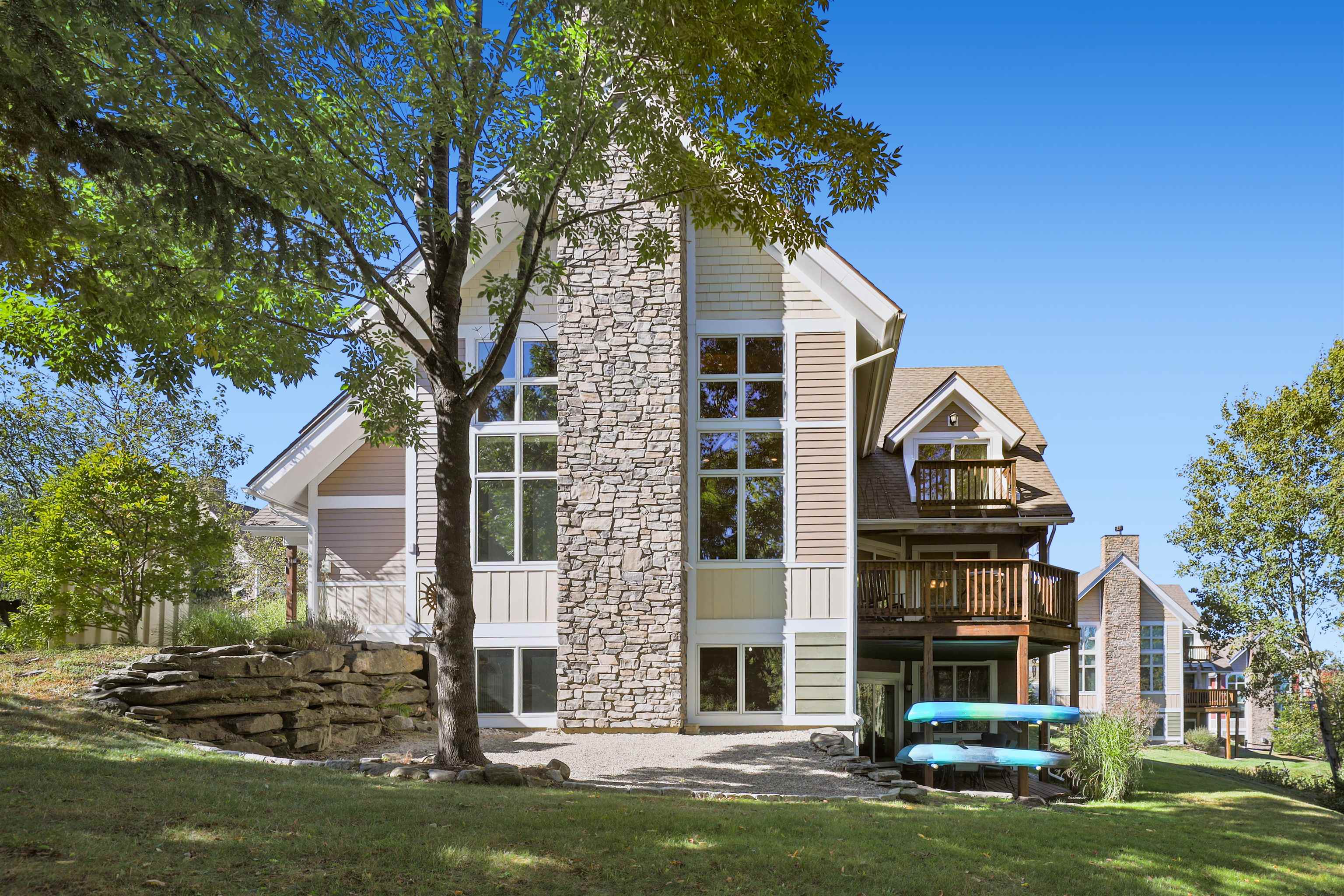This well-cared-for townhouse in Haystack Highlands offers a spacious layout with 3 bedrooms and 3 baths across two levels, plus untapped potential in the lower level. The main floor features a welcoming foyer, a mudroom currently used as an office, a bright living room with a striking fieldstone wood-burning fireplace, and an open kitchen/dining area. From the dining space, step out to the deck—perfect for grilling, entertaining, or simply enjoying the serene views overlooking the 12th Fairway of Haystack Golf Course. Also on the main level is a bedroom, full bath, laundry room, and convenient access throughout the home. Upstairs, the primary suite includes a full bath, walk-in closet, and private balcony. A guest bedroom and ¾ bath complete the second level. The unfinished lower level with drywall sheetrock walls expands the possibilities with plumbing hookups for an additional bath, a utility room, workshop area, and a walkout to the lower deck, backyard, and side patio. This property combines comfort, space, and a scenic setting, making it an excellent opportunity for your next home. Enjoy nearby recreational activities with downtown Wilmington close by, and both Mount Snow and the Hermitage Club just minutes away.