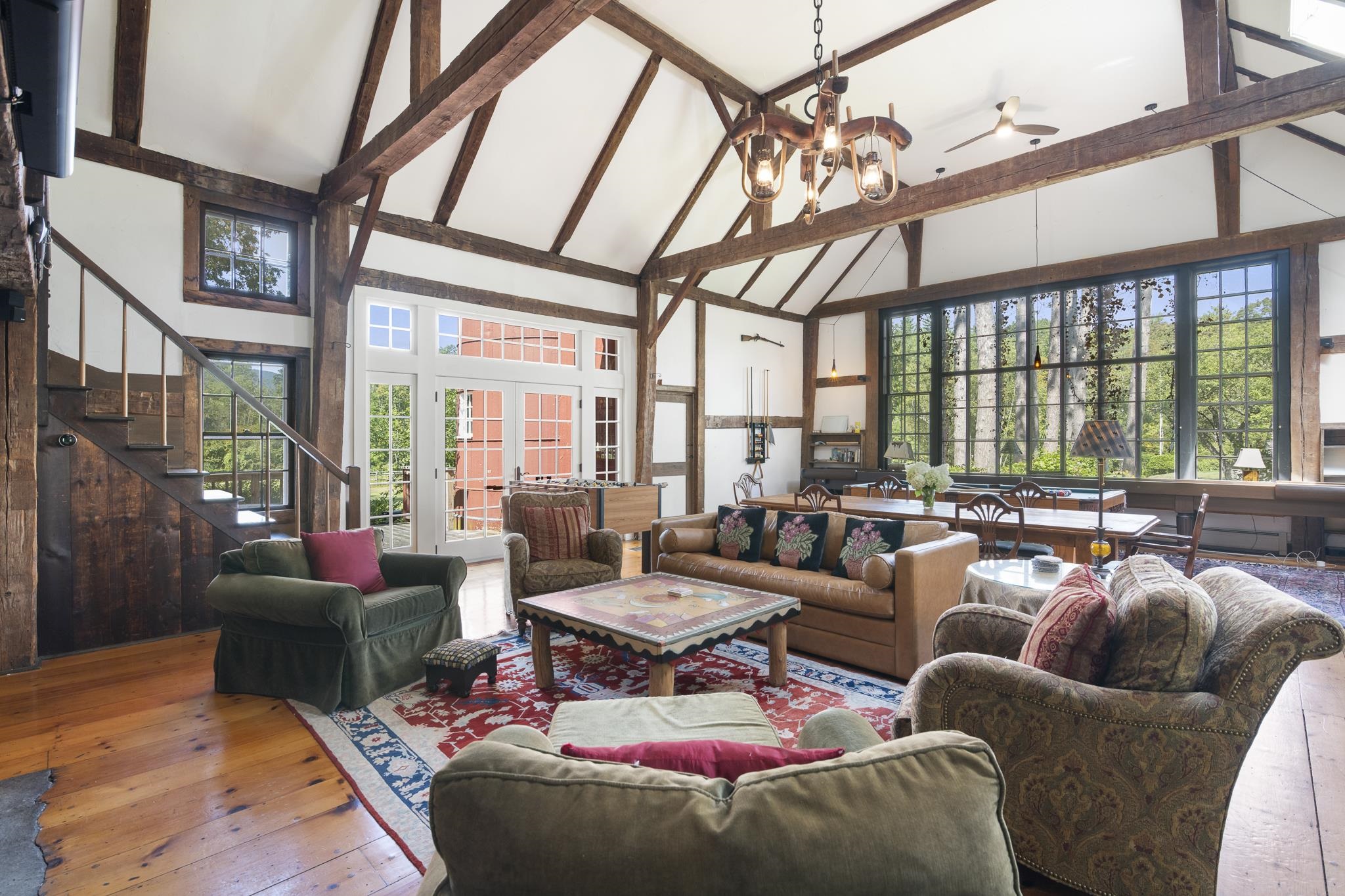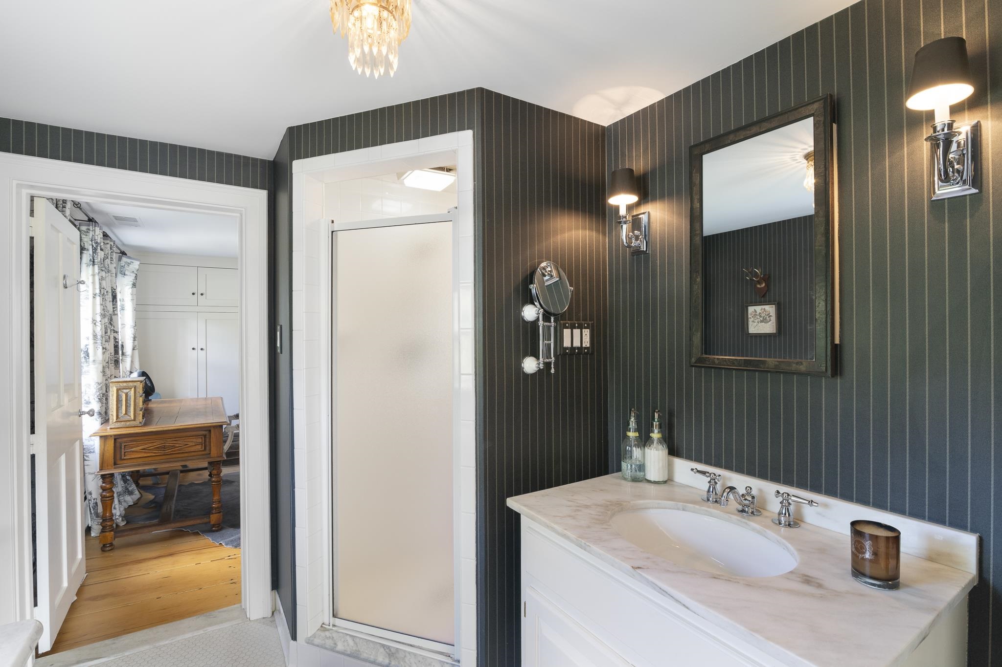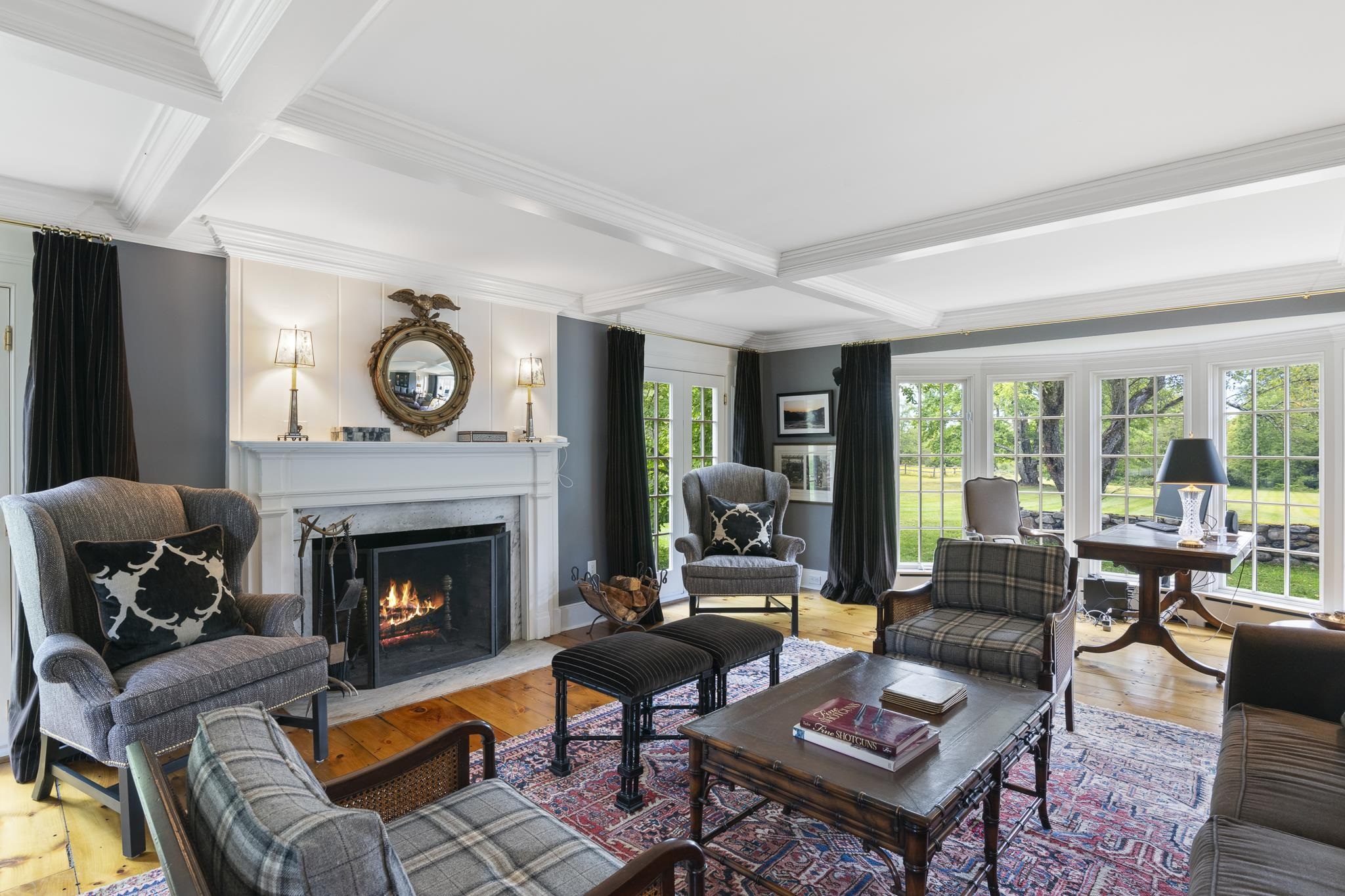 Peacock Hollow, a c.1790 completely private estate, is gracefully sited on 29.9 acres surrounded by sweeping mountain views, a running stream, and bordered by the forest. This rare offering combines historic character with refined updates, creating a legacy property designed for both intimate living and grand entertaining. The 5, 500 square foot main residence offers five beautifully appointed bedrooms, five fireplaces, original wood and marble floors, and handsome moldings throughout. The home has been thoughtfully expanded to include a sun-filled country kitchen with custom cabinetry, formal and informal dining rooms, a library, family room, and multiple living spaces that open to marble terraces and gardens. Enhancing the estate are extraordinary amenities, including a marble in-ground swimming pool with stone terrace, a tennis court, and a one-bedroom caretaker’s cottage with attached garage for on-site management or guest overflow. A 2, 400 square foot three-bedroom guest house, created from the original c.1796 post-and-beam barn, blends historic charm with modern comfort. A goat and chicken barn, equipment barn, and a separate 30’ x 60’ seven-bay toy and car barn provide abundant storage and the opportunity for a true Vermont farmstead lifestyle or a spectacular car collection. The grounds are equally captivating, featuring mature landscaping, open meadows, orchards, perennial gardens, and stone walls. Pergolas, walkways, and extensive marble terraces.