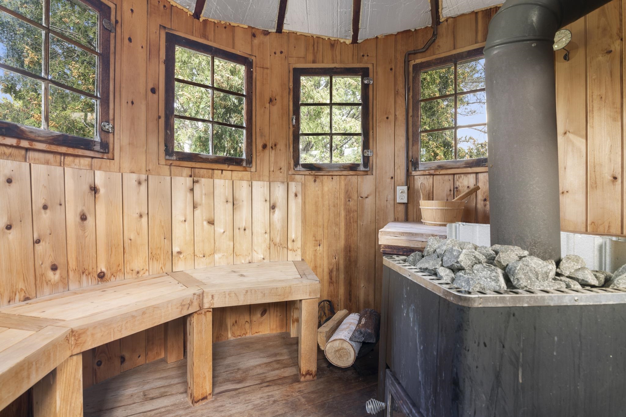 - Cathedral Ceiling, Cedar Closet, Ceiling Fan, Dining Area, Draperies, Fireplace Screens/Equip, Wood Fireplace, 3+ Fireplaces, Hearth, In-Law/Accessory Dwelling, In-Law Suite, Kitchen Island, Kitchen/Family, Primary BR w/ BA, Natural Light, Natural Woodwork, Sauna, Vaulted Ceiling, Walk-in Closet, Window Treatment, Programmable Thermostat, 2nd Floor Laundry, Smart Thermostat, Walkup Attic