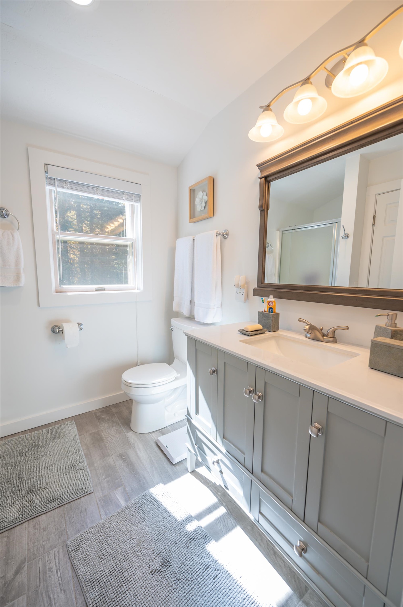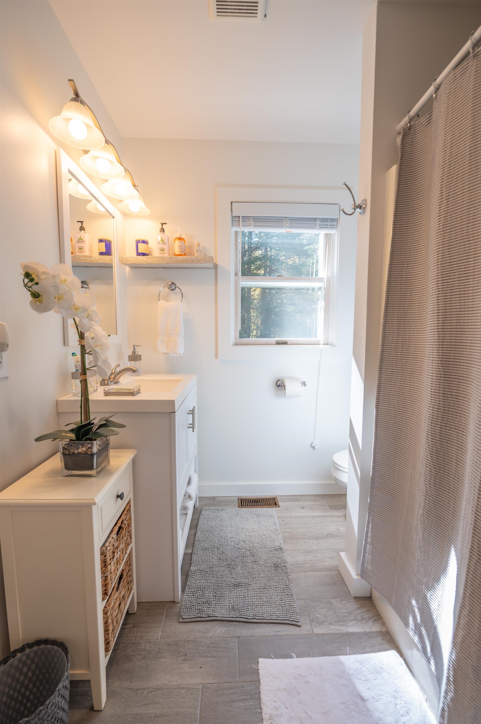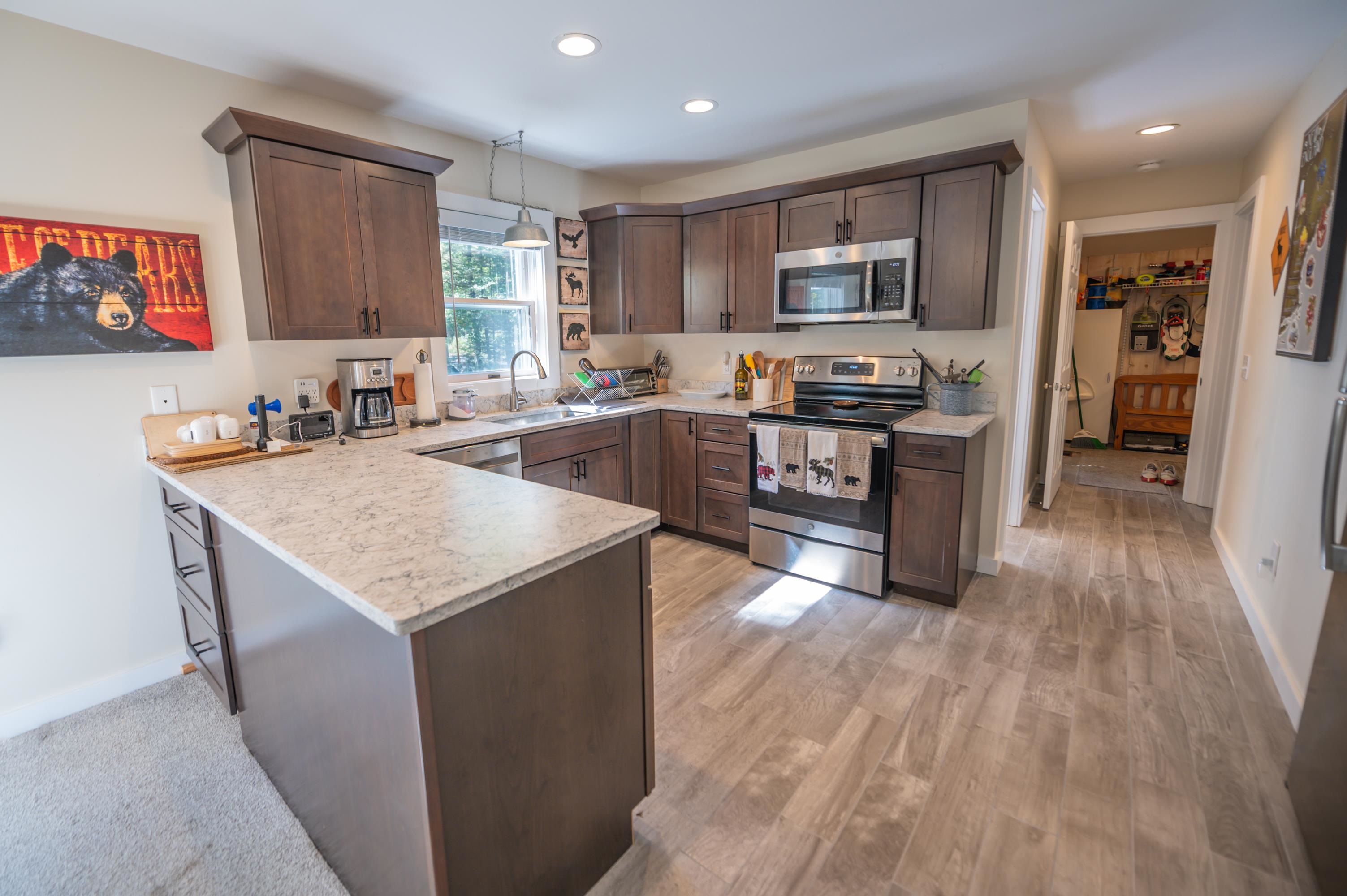This beautiful bright chalet is on a quiet corner lot in the lower section of the Chimney Hill community with easy access to trails, hiking, lakes, and nearby Mount Snow. Nice lawn space, a cul de sac driveway for ample parking, and shed, make this a unique year round parcel, affording nice privacy yet with all the conveniences of community living. The interior was gut renovated in 2019 and boasts an open concept living space with natural light and large windows, an updated kitchen with stainless appliances, custom cabinets, and quartz counters, a spacious dining area with slider to the large wraparound deck, a cozy living room with wood fireplace and brick hearth, a main floor bedroom and full bath, 2 upstairs bedrooms and a second fully updated bath, and a main floor mudroom and laundry area great for all your seasonal gear. Less obvious upgrades include a metal roof, poured concrete foundation and crawlspace with interior and exterior access, professional vinyl siding, and convenient garden shed and bear proof trash bin. This comes with all the great Chimney Hill amenities including road maintenance, community water, clubhouse with indoor and outdoor pools, hot tub, game room, theater, playground, tennis courts, basketball, gym, and more. There are also a la carte services including plowing, sanding, and trash pickup. A lovely spot that affords Vermont charm and serenity, with easy management.