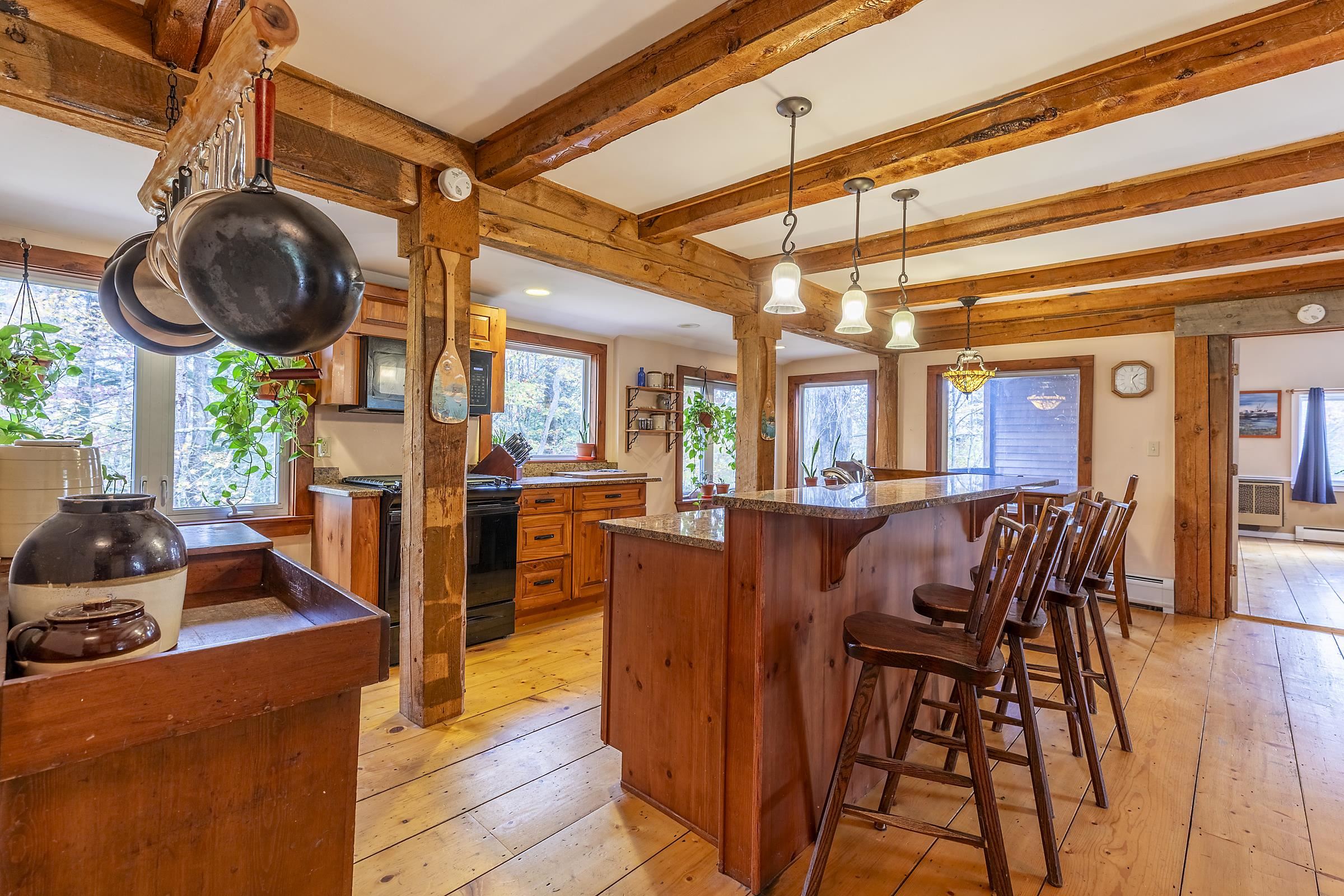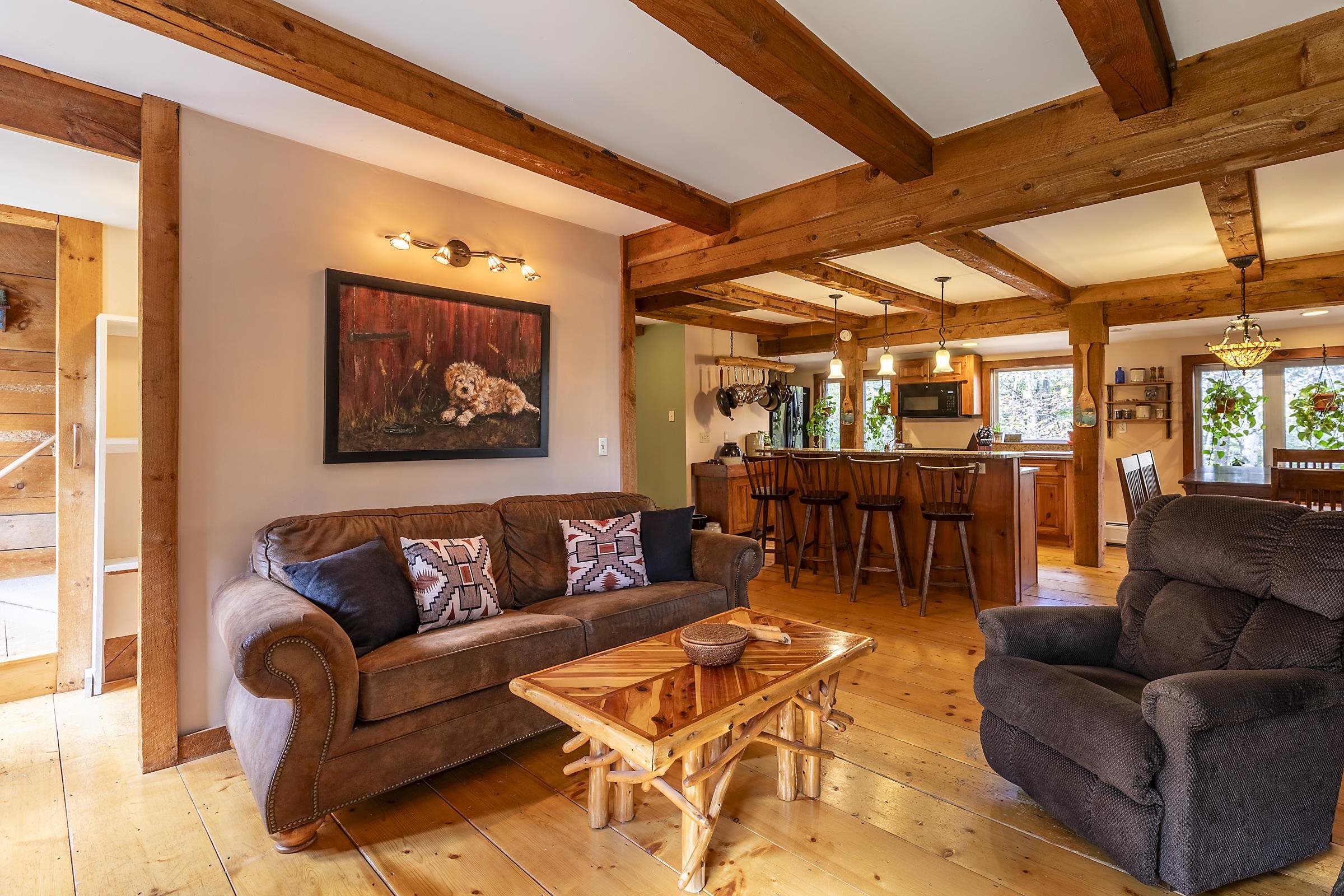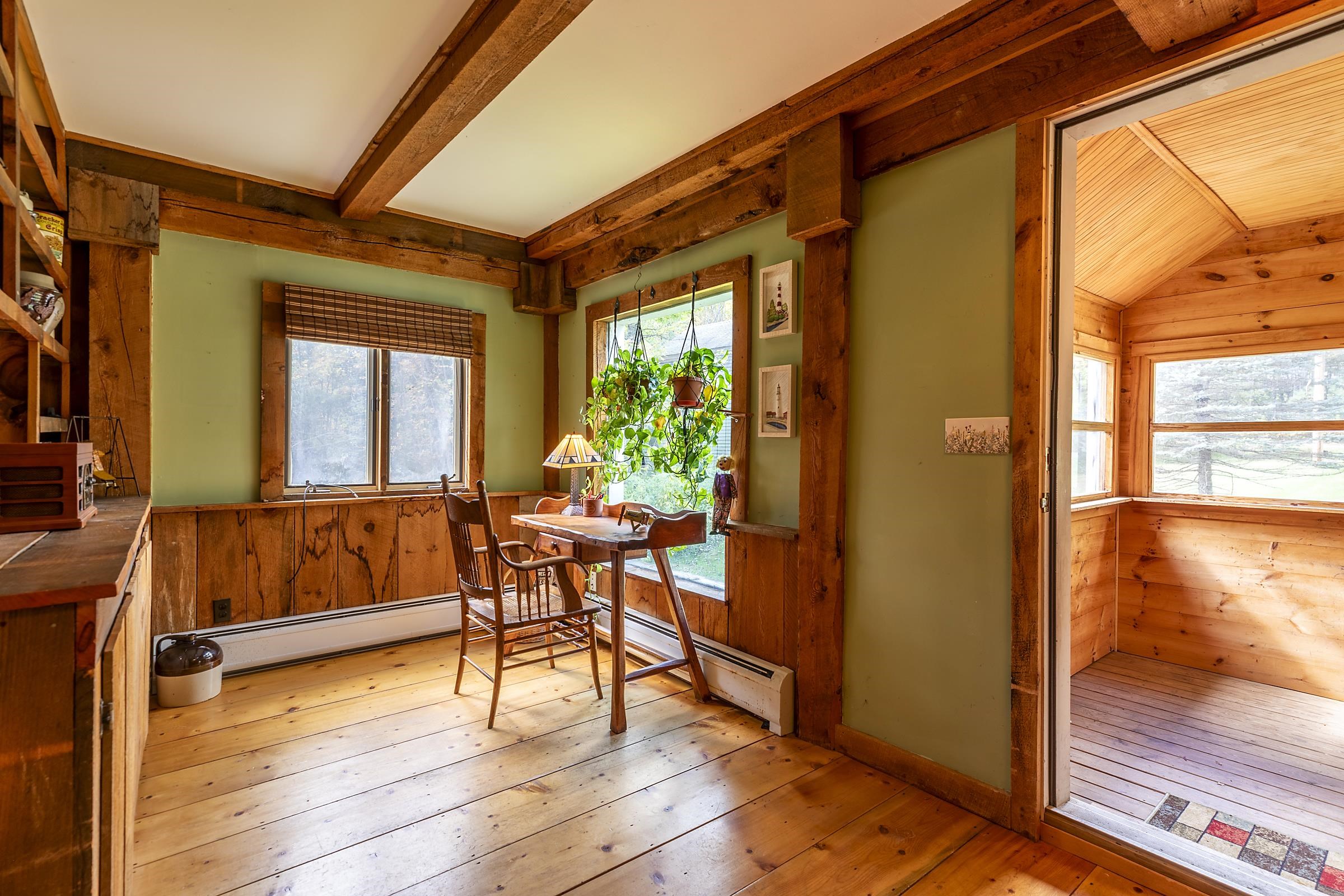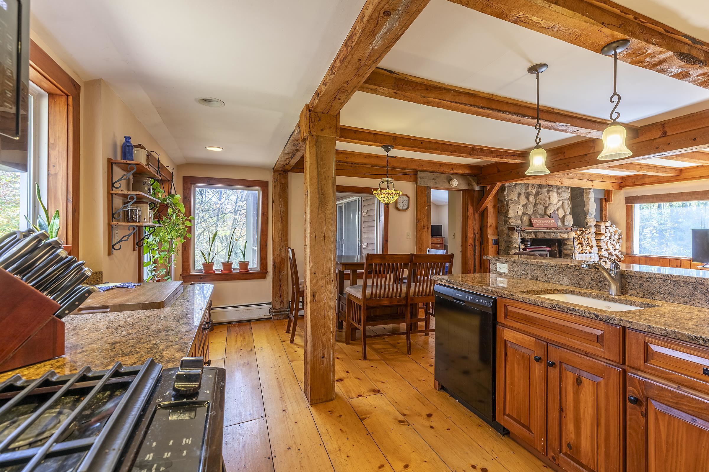 Sitting above Londonderry Village, this 3-bedroom, 2-bathroom home offers the perfect blend of rustic character, privacy, and easy access to local amenities. Step inside through a spacious enclosed porch—ideal for a peaceful sitting area, storing firewood, or serving as a functional mudroom. The main level features exposed post-and-beam construction, wide-plank wood floors, and a stunning fieldstone fireplace that anchors the open-concept living, dining, and kitchen area. The kitchen is well-appointed with granite countertops and ample space for cooking. Also on the main floor is a full bathroom with laundry, a versatile office or den, and a generously sized primary bedroom with a walk-in closet, a bay window, and a private deck that gives a treehouse-like feel. Upstairs, you'll find two inviting bedrooms and a second bathroom with a standing shower. The larger bedroom is filled with natural light and features its own fireplace. The second bedroom is small and cozy. Both rooms are enhanced by oversized skylights—perfect for stargazing under Vermont’s brilliant night sky. Set on 1.49 acres, the property features a flat, landscaped lot peppered with perennial beds, a cozy firepit, and a one-bay barn/garage with expansive overhead storage. Enjoy easy access to outdoor recreation and local amenities: walk to Pingree Park and the village center, or a short drive to Flood Brook School, Magic Mountain, and Lowell Lake. Bromley and Stratton ski resorts are just 20 minutes away.