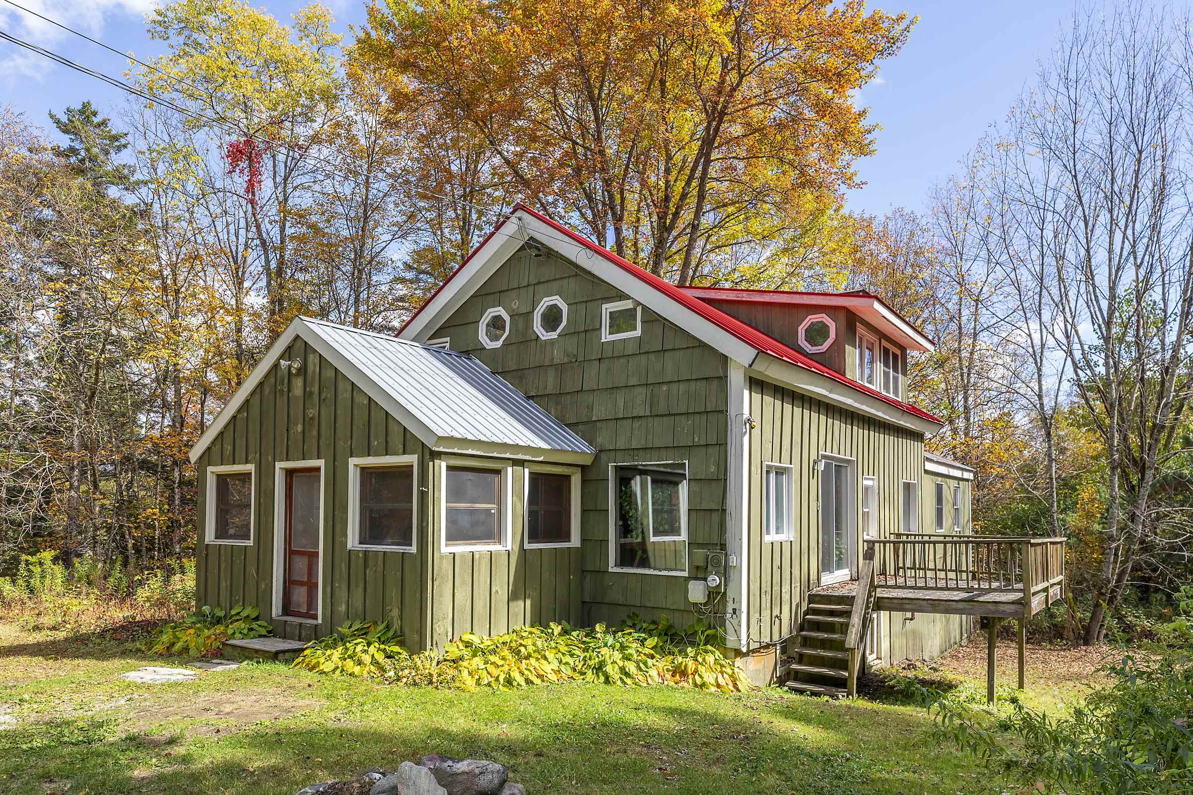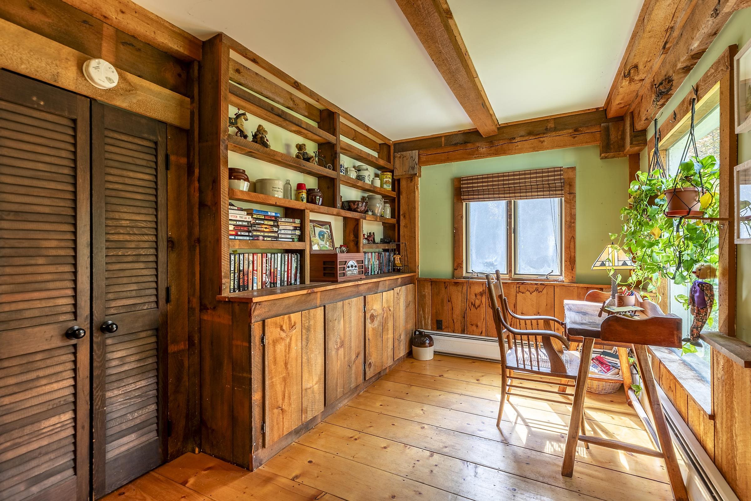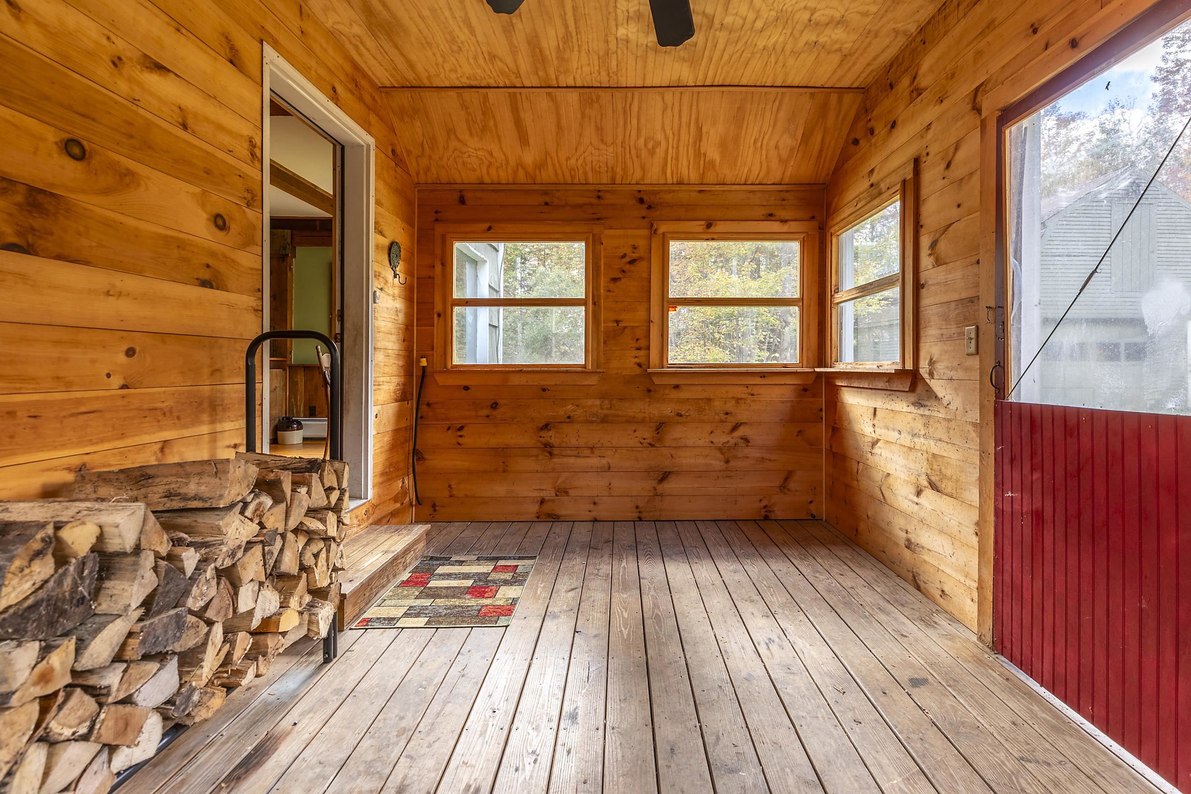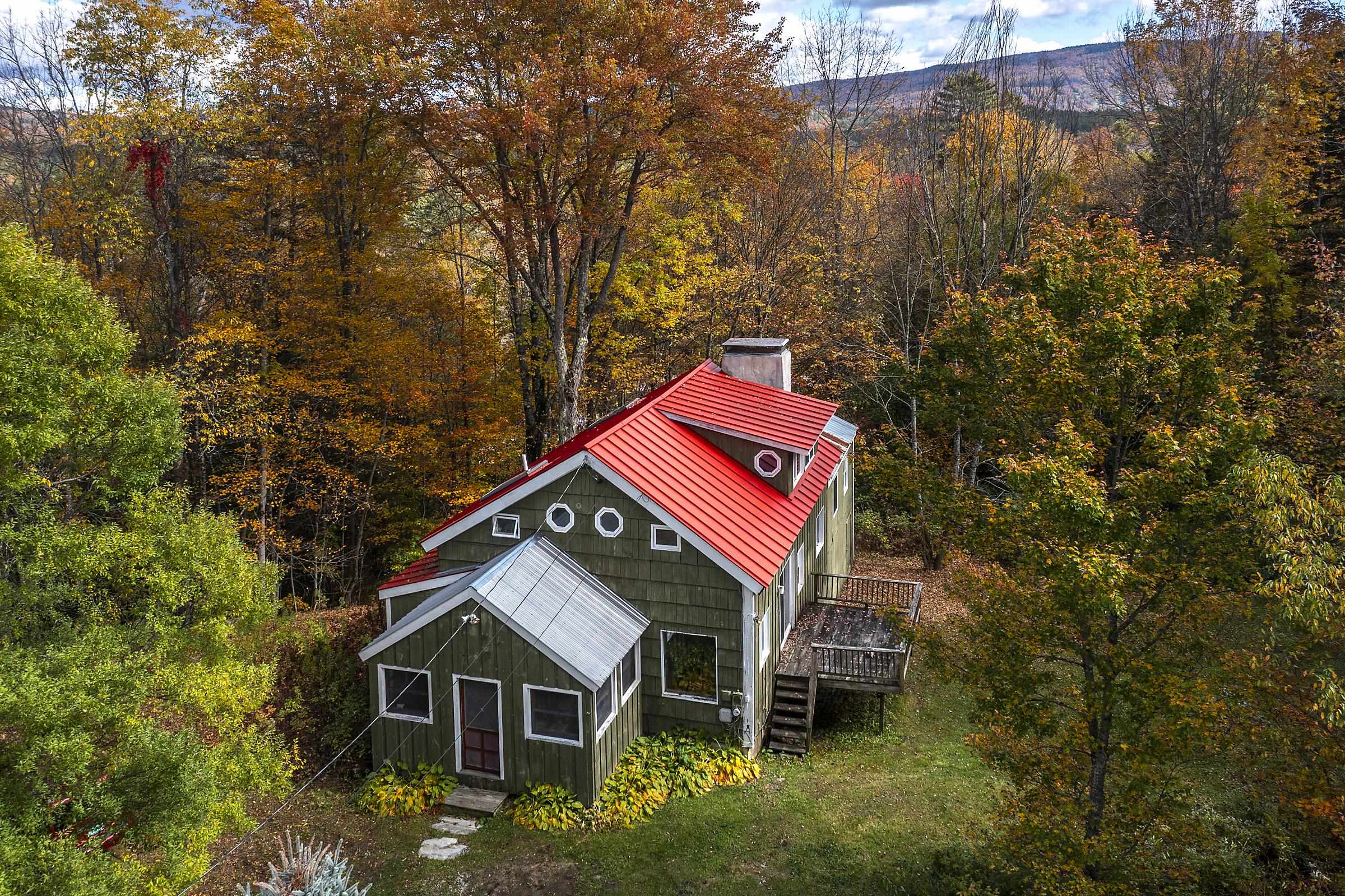 Sitting above Londonderry Village, this 3-bedroom, 2-bathroom home offers the perfect blend of rustic character, privacy, and easy access to local amenities. Step inside through a spacious enclosed porch—ideal for a peaceful sitting area, storing firewood, or serving as a functional mudroom. The main level features exposed post-and-beam construction, wide-plank wood floors, and a stunning fieldstone fireplace that anchors the open-concept living, dining, and kitchen area. The kitchen is well-appointed with granite countertops and ample space for cooking. Also on the main floor is a full bathroom with laundry, a versatile office or den, and a generously sized primary bedroom with a walk-in closet, a bay window, and a private deck that gives a treehouse-like feel. Upstairs, you'll find two inviting bedrooms and a second bathroom with a standing shower. The larger bedroom is filled with natural light and features its own fireplace. The second bedroom is small and cozy. Both rooms are enhanced by oversized skylights—perfect for stargazing under Vermont’s brilliant night sky. Set on 1.49 acres, the property features a flat, landscaped lot peppered with perennial beds, a cozy firepit, and a one-bay barn/garage with expansive overhead storage. Enjoy easy access to outdoor recreation and local amenities: walk to Pingree Park and the village center, or a short drive to Flood Brook School, Magic Mountain, and Lowell Lake. Bromley and Stratton ski resorts are just 20 minutes away.