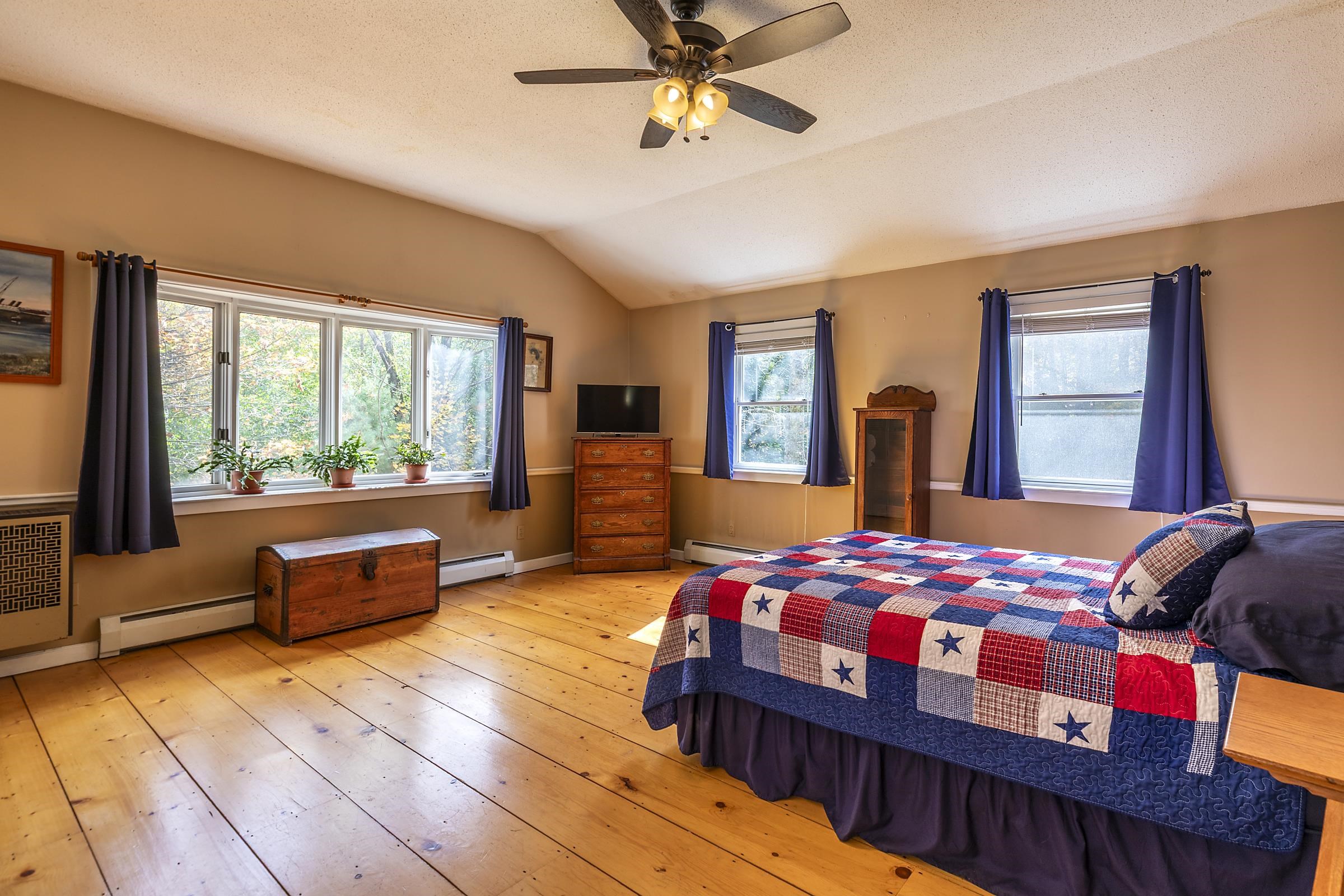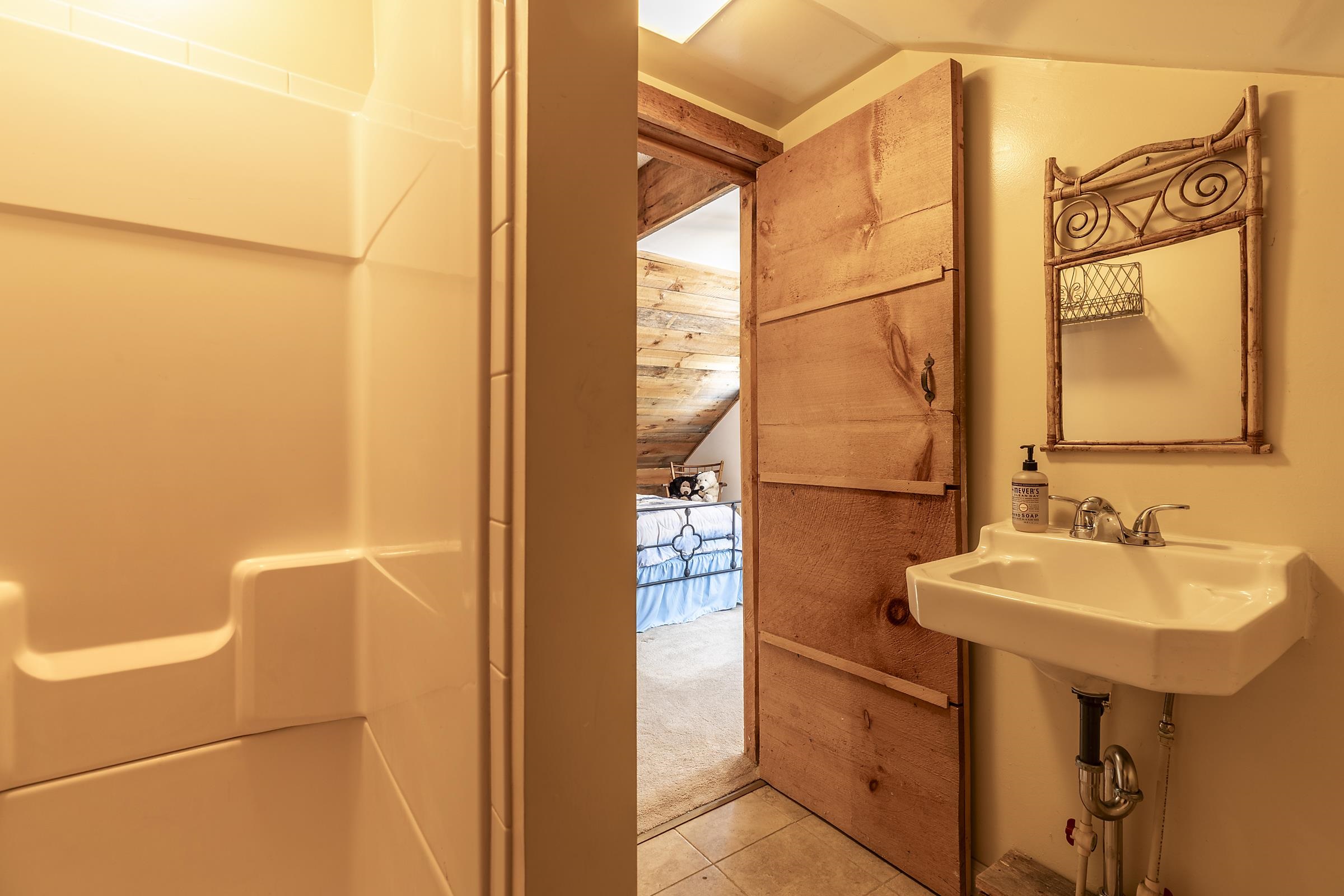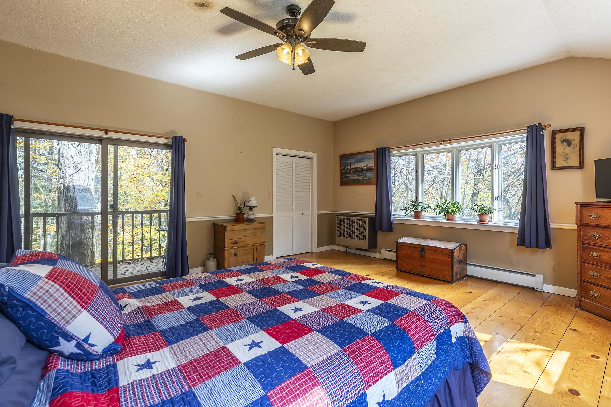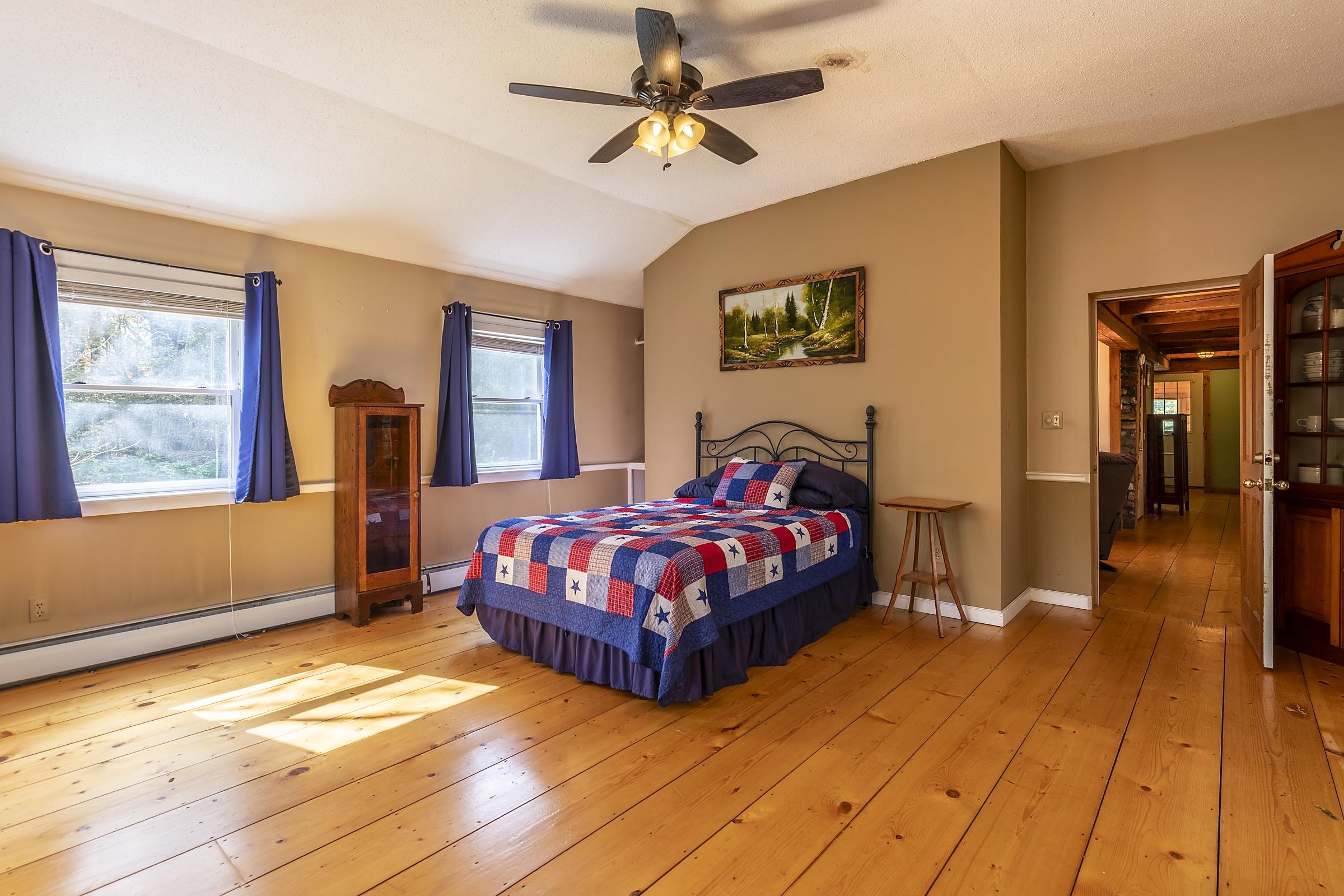 Sitting above Londonderry Village, this 3-bedroom, 2-bathroom home offers the perfect blend of rustic character, privacy, and easy access to local amenities. Step inside through a spacious enclosed porch—ideal for a peaceful sitting area, storing firewood, or serving as a functional mudroom. The main level features exposed post-and-beam construction, wide-plank wood floors, and a stunning fieldstone fireplace that anchors the open-concept living, dining, and kitchen area. The kitchen is well-appointed with granite countertops and ample space for cooking. Also on the main floor is a full bathroom with laundry, a versatile office or den, and a generously sized primary bedroom with a walk-in closet, a bay window, and a private deck that gives a treehouse-like feel. Upstairs, you'll find two inviting bedrooms and a second bathroom with a standing shower. The larger bedroom is filled with natural light and features its own fireplace. The second bedroom is small and cozy. Both rooms are enhanced by oversized skylights—perfect for stargazing under Vermont’s brilliant night sky. Set on 1.49 acres, the property features a flat, landscaped lot peppered with perennial beds, a cozy firepit, and a one-bay barn/garage with expansive overhead storage. Enjoy easy access to outdoor recreation and local amenities: walk to Pingree Park and the village center, or a short drive to Flood Brook School, Magic Mountain, and Lowell Lake. Bromley and Stratton ski resorts are just 20 minutes away.