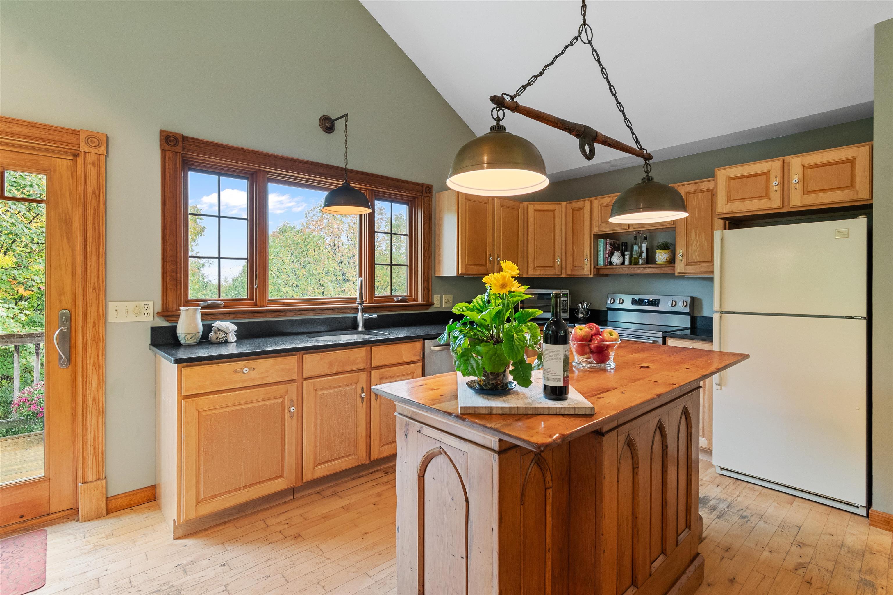 - Blinds, Ceiling Fan, Dining Area, Fireplace Screens/Equip, Wood Fireplace, 1 Fireplace, Hearth, Kitchen/Living, Primary BR w/ BA, Natural Light, Natural Woodwork, Soaking Tub, Indoor Storage, Vaulted Ceiling, Walk-in Closet, Wood Stove Insert, Basement Laundry