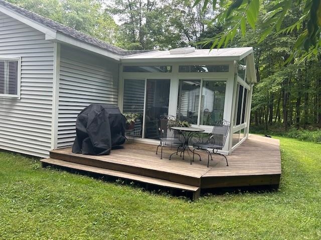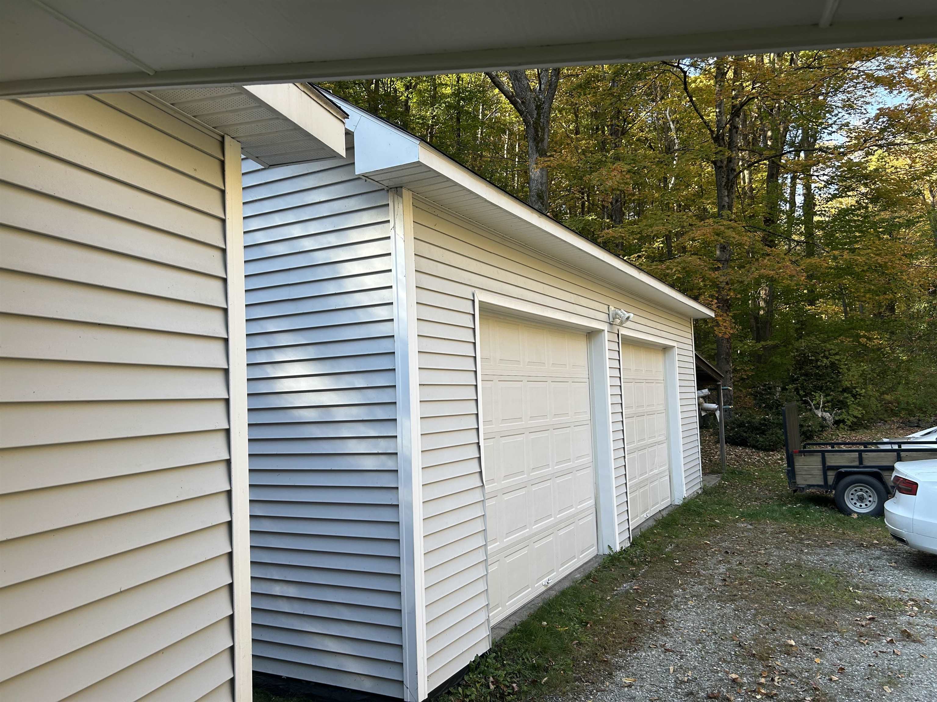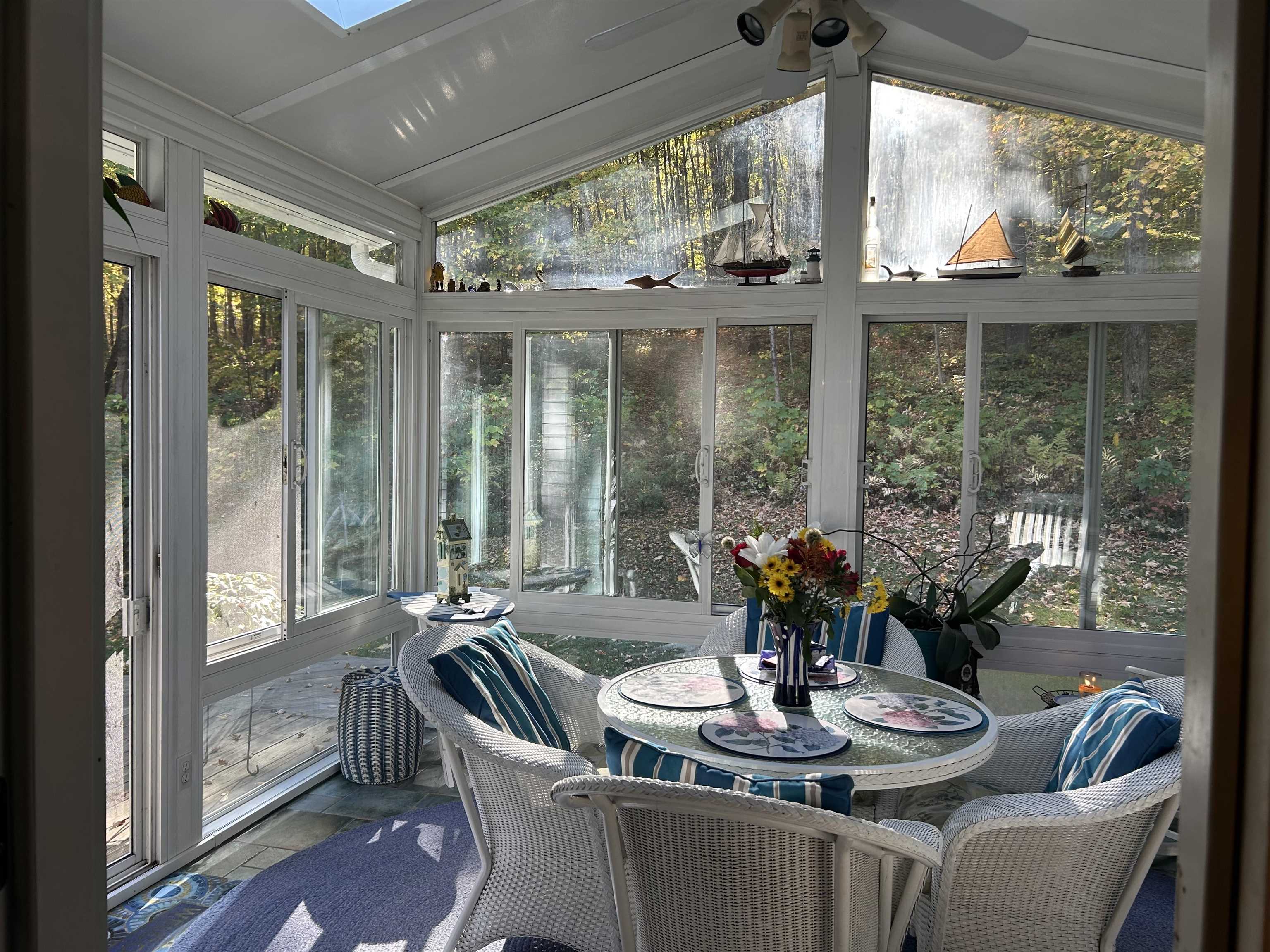 Conveniently located on a private 5-acre lot with Maple trees, lot near school, shopping and all conveniences. Versatile one level living this home has been used as a 3 bedroom, with first floor living room with fireplace, beautiful Sunroom overlooks private back yard, nice family room and 2 other rooms in basement. Eat in kitchen comes with appliances. Comfy covered front porch for relaxing...and enjoying the natural surroundings. Great yard space for kids or grownups to play, complete with a Basketball hoop and concreate pad. Meander on a walk or snowshoe on the trails in the woods. Enjoy watching for wildlife while relaxing in the back Sunroom. Finished 2 car garage with storage above. Showings delayed until 10/5/25. Open House Sunday, October 5th from 1PM-3PM. Come see this lovely home with 5 Acres of Privacy.
