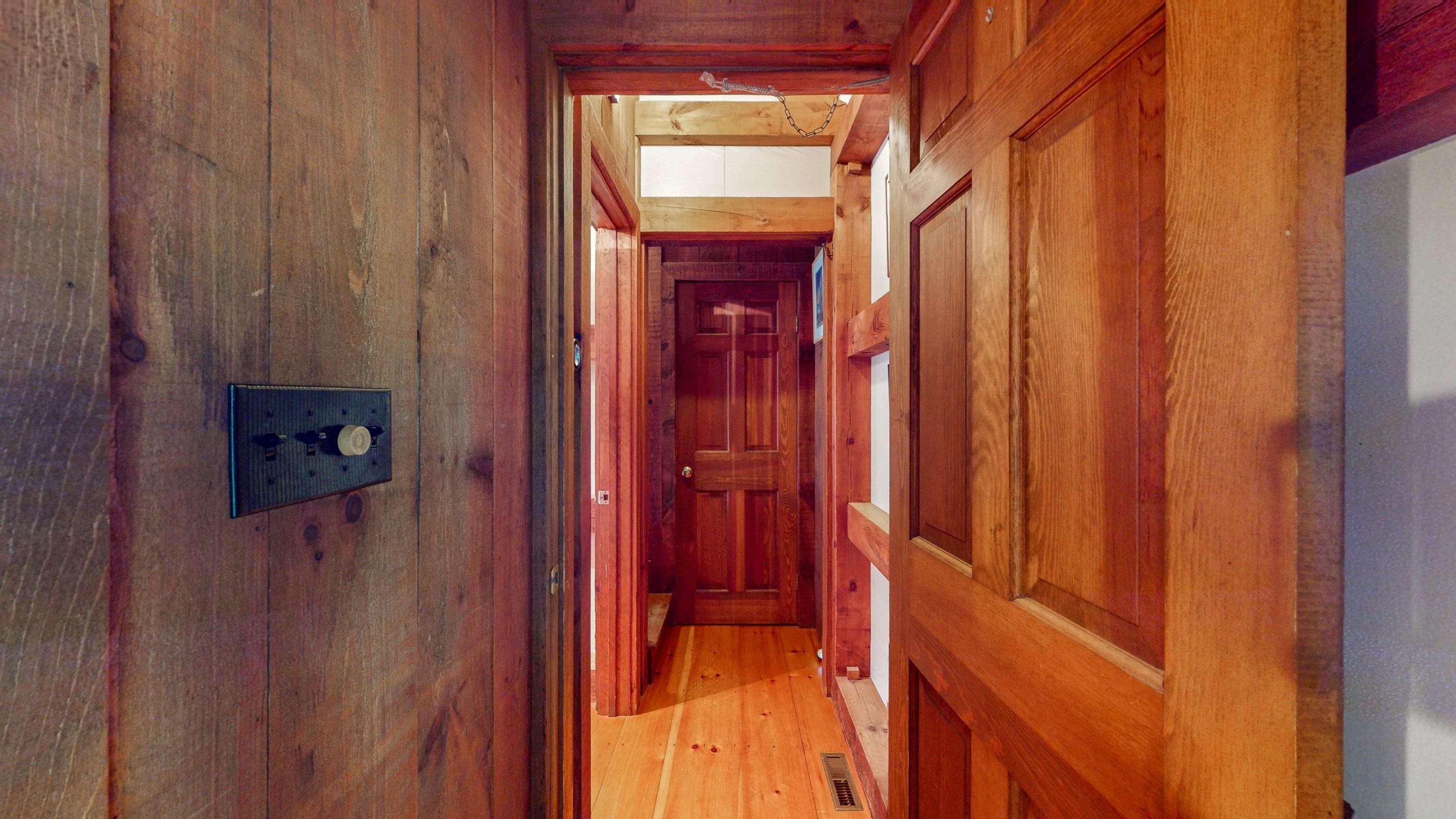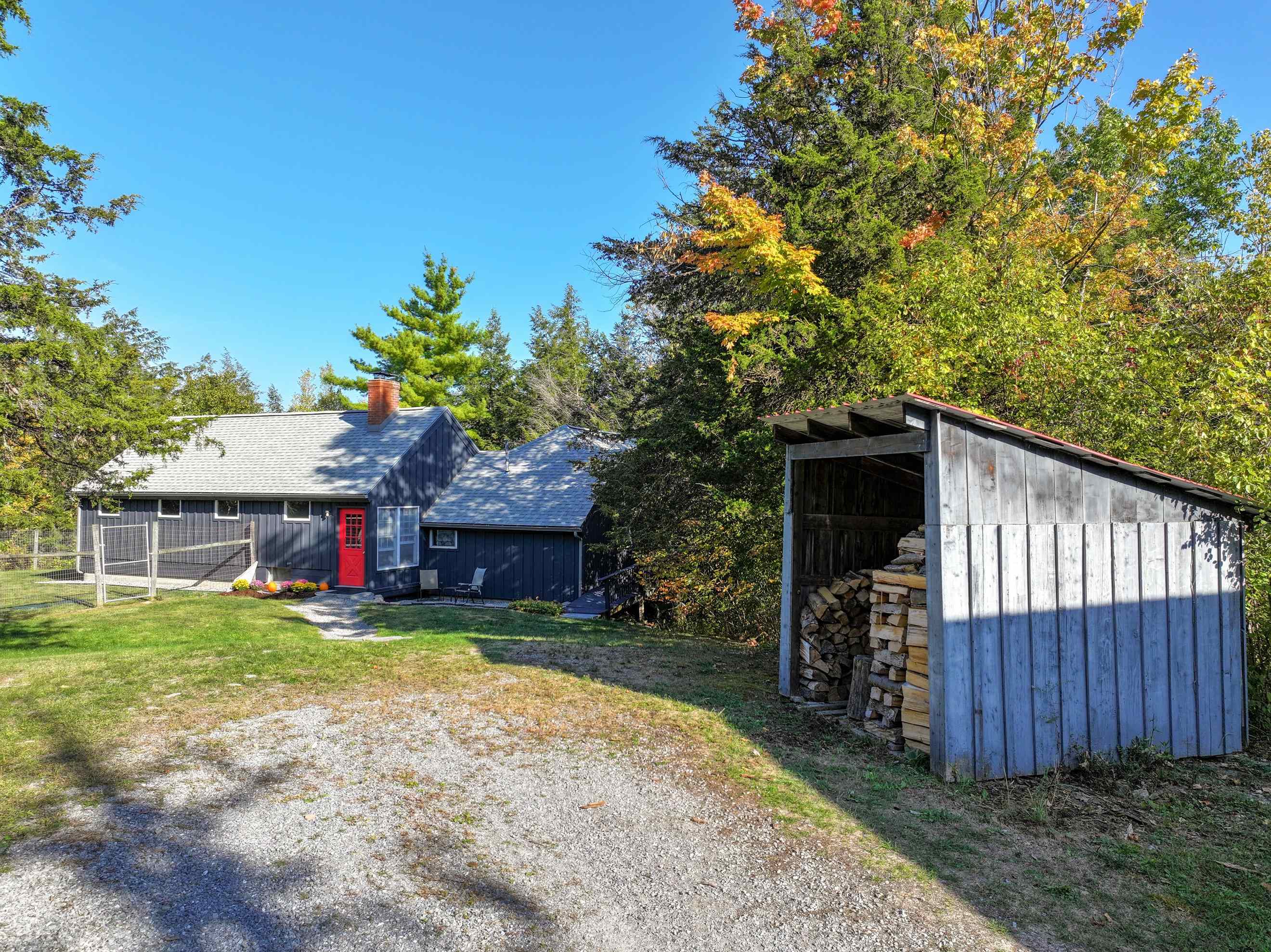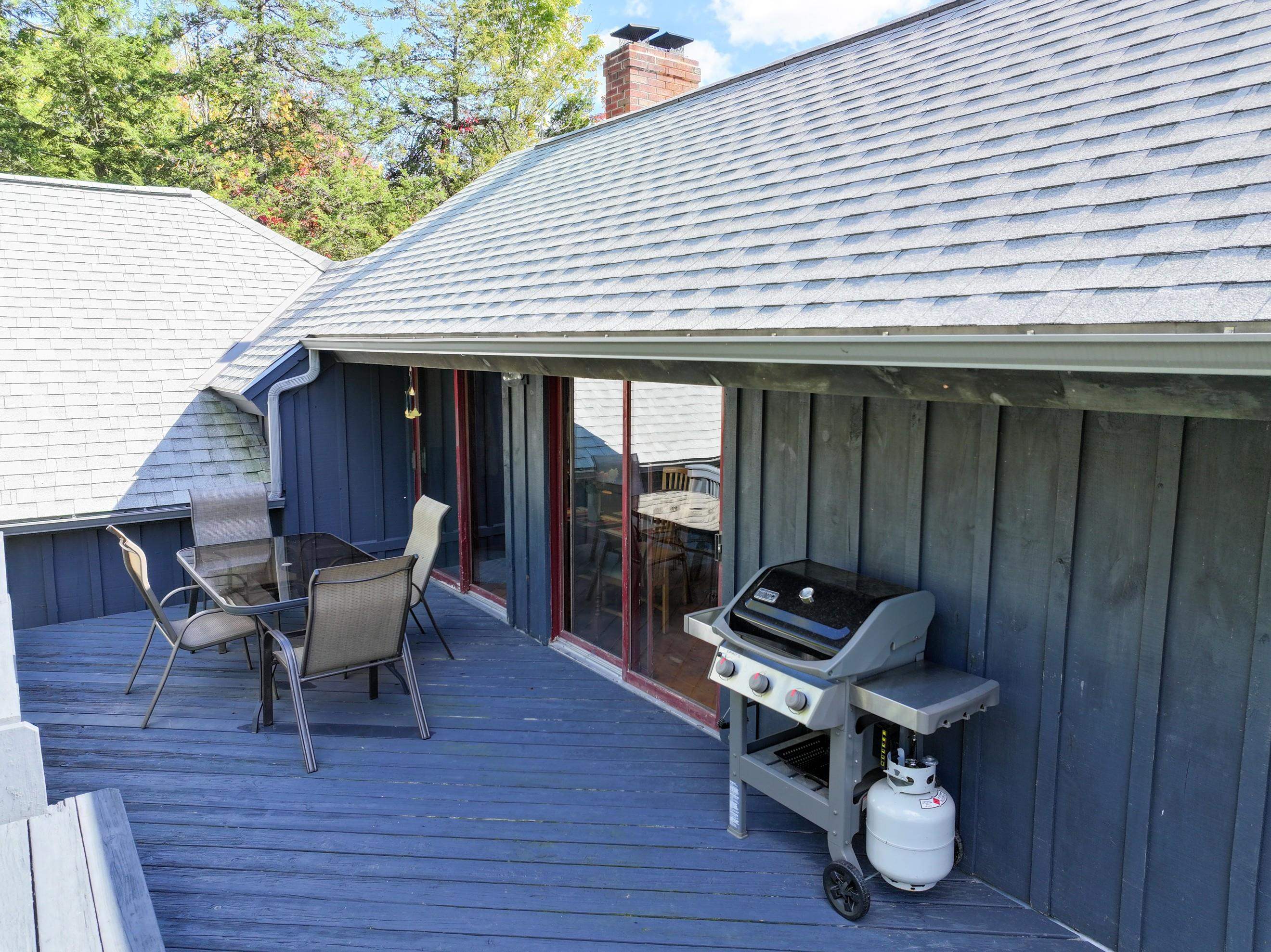 Tucked in at the end of a shared/private roadway is this chalet-style, post and beam house with lovely exposed beams, large and open spaces and a fabulous deck! Pine boards grace the floors of this home giving it a warm and inviting feeling along with a little bit of rustic charm. Constructed with stress skin panels, well-placed windows and a centrally located wood stove this 1977 house is comfortable and enjoyable to be in! Peak-a-boo views from the living/dining room and deck towards Snake Mountain offering stunning sunsets. Main floor living with a mudroom, living/dining, kitchen, bedroom, office/study and a full bath. In the lower level you'll find another bedroom, laundry/storage, another full bath and an overflow room - perfect for a short-term guest and futon! Let the dogs roam outside within a tall fence and take a walk into the woods to meet up with neighbors. Recently upgraded septic, roofing shingles and exterior painting.