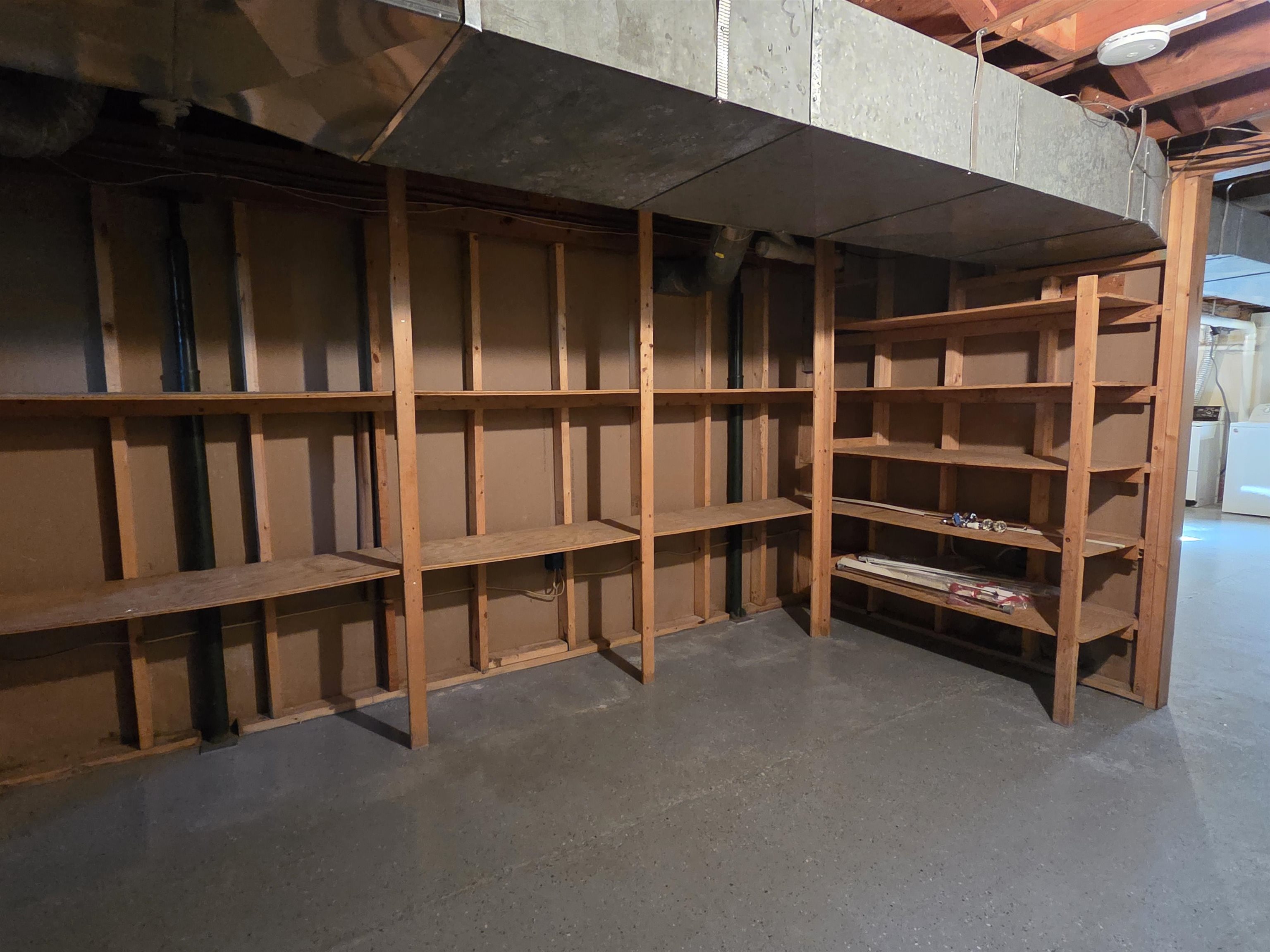 - Concrete, Concrete Floor, Full, Partially Finished, Interior Stairs, Storage Space, Basement Stairs