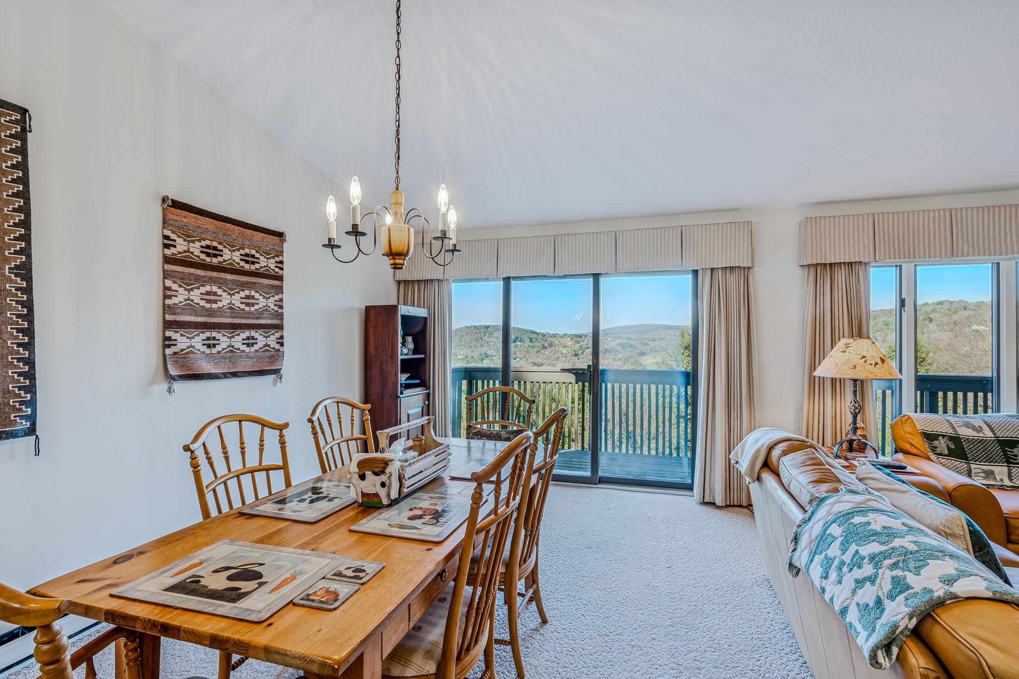 Outstanding 180 degree views of the Quechee Valley ! East, South and West facing for all the passive solar you could ask for. Excellent 3 bedroom and 3 bath townhouse with private on sight in ground pool for owners and guests to use. Unit consists of first level bedroom with beautiful renovated full bath. Galley kitchen with granite counter tops, oak cabinetry and tile flooring. Pass through into the dining and living rooms with bar stools for casual fare. Vaulted ceilings in combo dining /living room areas with wood burning fireplace. Wonderful deck with two awnings for comfort and shade. Lower level consists of two bedrooms and two baths with 2 additional storage rooms or make one into a game room. All tastefully finished. Lower level also has an additional deck for a peaceful retreat. This property has been used sparingly for the last several years and has been used by owners strictly as their second home get away.
