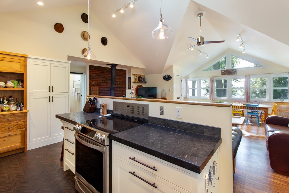 Discover the perfect Lake Champlain retreat in the quaint town of Isle La Motte. Set on 1.08 private acres with 100 feet of west-facing lake frontage, this year-round 3-bedroom home was fully renovated by Sweeney Design Build starting in 2014, blending modern comforts with timeless style. Inside, the open-concept living space showcases vaulted ceilings, a wood stove, a skylight, and lake views. The kitchen is a showpiece with herringbone teak floors, elegant white cabinetry with an integrated fridge, solid black marble countertops sourced locally from Isle La Motte, and a built-in rustic bar. A pass-through window connects the kitchen to the screened porch with ceiling heaters, seamlessly blending indoor and outdoor living. From there, step onto the stone patio with a custom pizza oven, the perfect place for lakeside entertaining. The home offers flexible bedroom options, including a main-level suite and a luxurious second-floor suite with a propane fireplace, soaking tub, and walk-in closet. A secret wine room provides a unique space to showcase your collection. The heated barn, also built by SDB, offers additional living space with a +1, 000 sqft second floor and first-floor bathroom, ideal for guests, hobbies, or storage. Enjoy spectacular sunsets from the lakeside deck with stairs to the water. The gradual shale beach is perfect for a dock, swimming, and boating, and includes a mooring. Schedule your showing today and experience lakefront living at its finest.