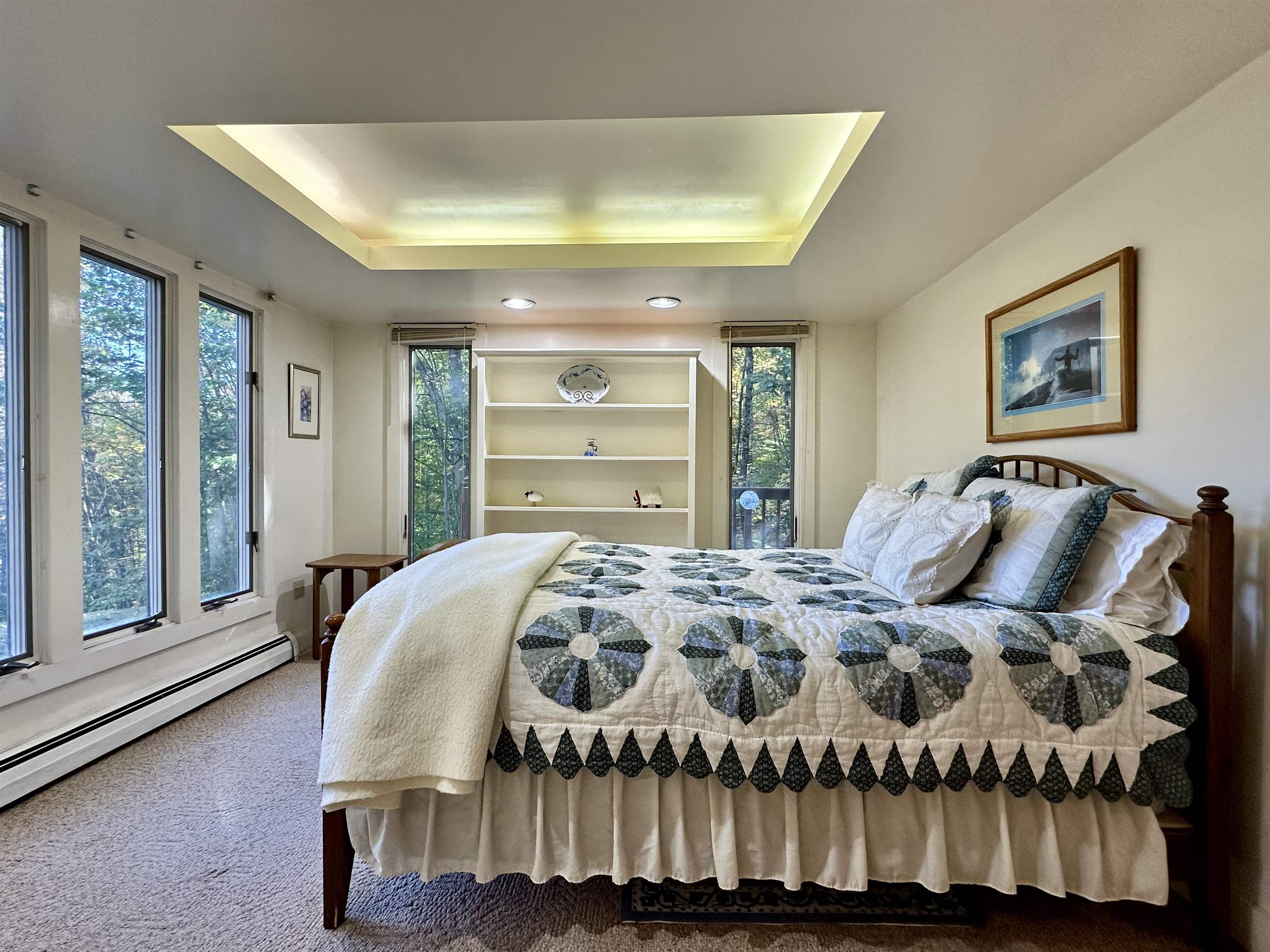 Welcome to your peaceful mountain retreat in the heart of Vermont's premiere ski country. Only minutes from Killington and Pico Mountains, this spacious 2.5-story, 4 bedroom, 3 bathroom home offers the perfect blend of rustic charm and modern comforts. All surrounded by Vermont’s natural beauty and stunning views of Killington Mountain. Step inside to a bright and open living space where the vaulted ceiling, exposed beams, and the large multi-floor windows frame the tranquil forest setting. The inviting great room features a grand stone hearth and wood stove, creating a cozy atmosphere after a day on the slopes. The adjoining dining area and kitchen make entertaining easy, with warm wood cabinetry, ample counter space, and a breakfast bar that’s perfect for gatherings. Off of this space is a wonderful wrap-around deck that offers unobstructed mountain views. Completing this level are two guest bedrooms with each offering its own sense of privacy and relaxation, highlighted by natural light and peaceful woodland or mountain views. The primary suite is located just above this space and has a private entrance overlooking the great room below. Downstairs, a finished walkout lower level provides flexible space for a media room, home office, or guest suite complete with a recessed ceiling, built-in shelving and an additional full bathroom. So if you are into skiing, snowmobiling, hiking, swimming or anything outdoors then this home is a must see. Welcome Home!