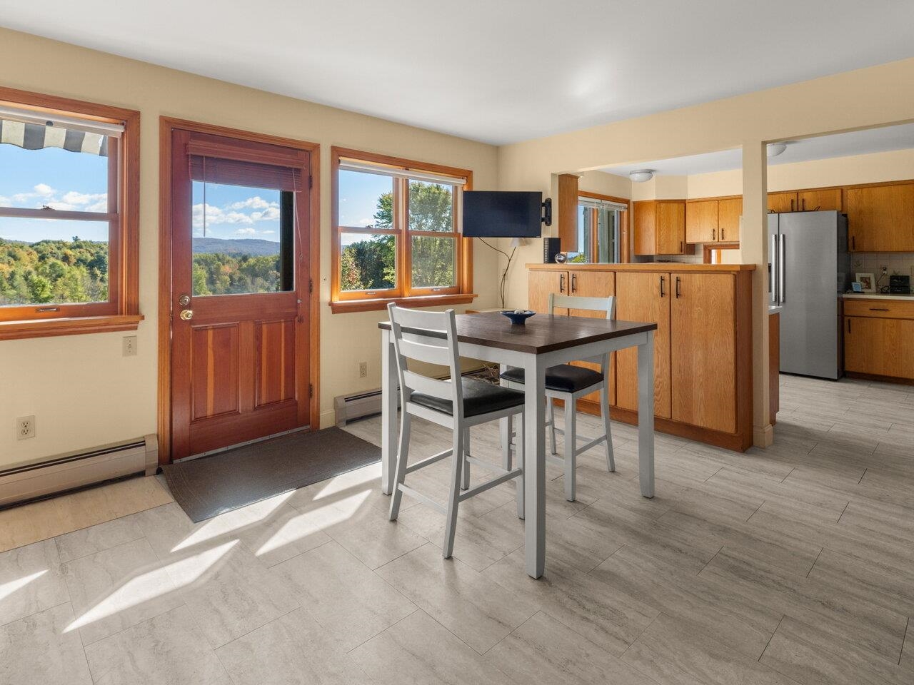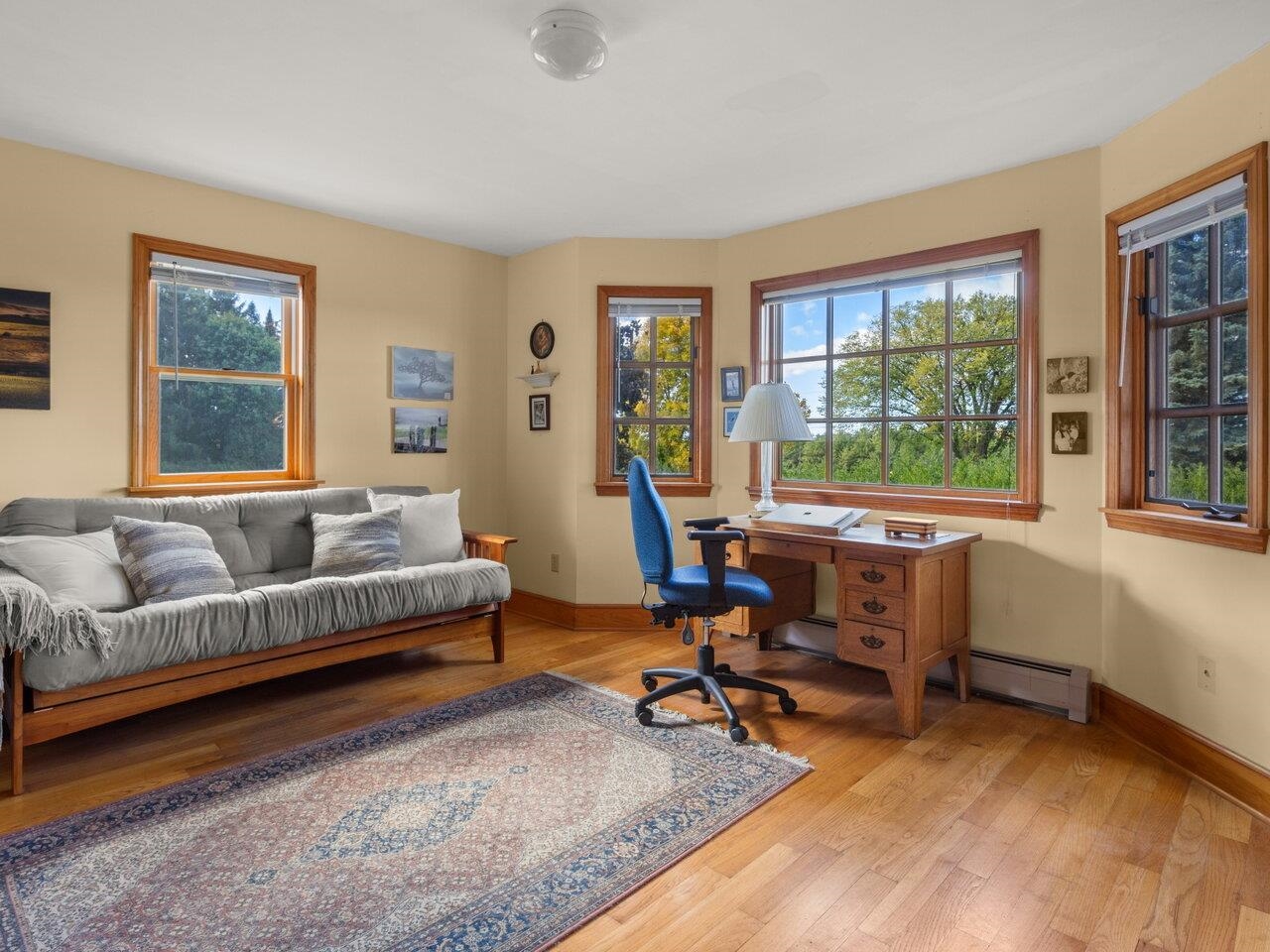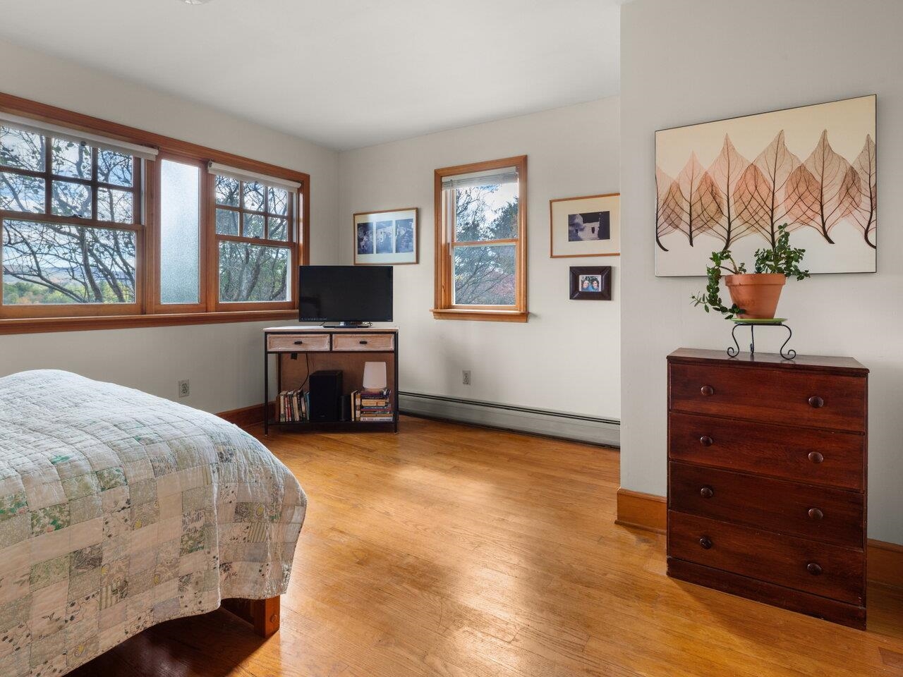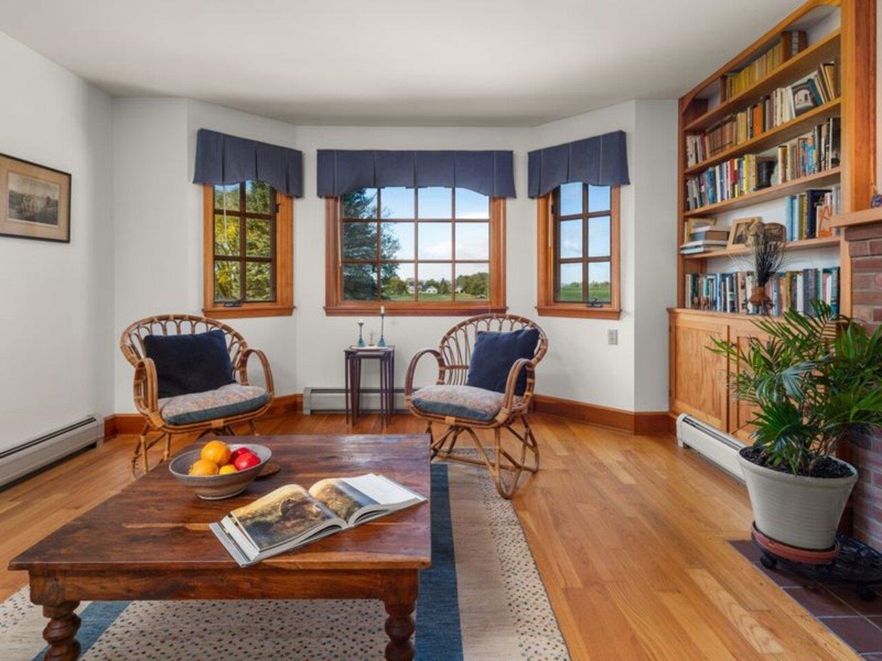 The perfect place to call home! Located in scenic Shelburne, VT, this beautiful contemporary cape is set on 4.5 private acres with surrounding mountain views! The 4-bed, 4-bath home features a casual kitchen/dining area with a warm wood stove and access to a large deck overlooking the manicured lawn and easterly Green Mountain views. Adjacent to the kitchen is a formal dining room with a stunning bow window, hardwood floors, and a convenient pass-through window for effortless entertaining. Just down a short hall is the 1st-floor bedroom with an updated en suite bath and a separate west-facing den/office. The living room, with hardwood floors, wood-burning fireplace, and bay window offers views of the Adirondack Mountains. The 2nd floor features two large bedrooms with multiple deep walk-in closets, a shared full bath, and an enormous bonus room with fir floors, vaulted ceilings, and skylights. The fully insulated basement is paneled with real plywood and has an acoustic ceiling. Add some designer floor coverings and you have one hip rec-room to enjoy! In addition, a built-in basement greenhouse off the home's south side is perfect for starting spring annuals. This solidly-built home, sited at the highest point of the lot, takes full advantage of the Green Mountain views to the east and the Adirondacks to the west! Shelburne Village, area bike paths, hiking trails, parks, and golf courses are nearby too. This tranquil homesite is so inviting, you'll never want to leave!