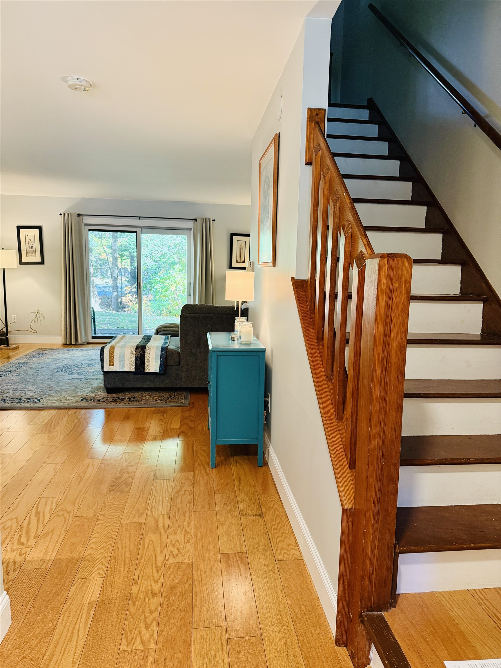 Beautifully updated 2-Bedroom, 1.5-Bath Townhouse in Cardinal Woods! This bright and inviting home offers a peaceful vibe with an open floor plan, fresh paint, and gleaming hardwood floors throughout both levels. The completely renovated kitchen features stainless steel appliances, modern cabinetry, and ample counter space, perfect for cooking and entertaining. The spacious dining/living room flows seamlessly to a large private patio that backs up to a wooded area, creating a serene and private outdoor retreat. Upstairs, you’ll find two generous bedrooms with excellent closet space, a full bath, and the convenience of second-floor laundry. Enjoy easy living with a covered carport that includes storage, all in a quiet location close to parks, schools, shopping, public transportation, and more. Meticulously maintained and move-in ready, this townhouse combines comfort, convenience, and style—all just minutes from South Burlington's amenities. Don’t wait—this pristine home won’t last long!
