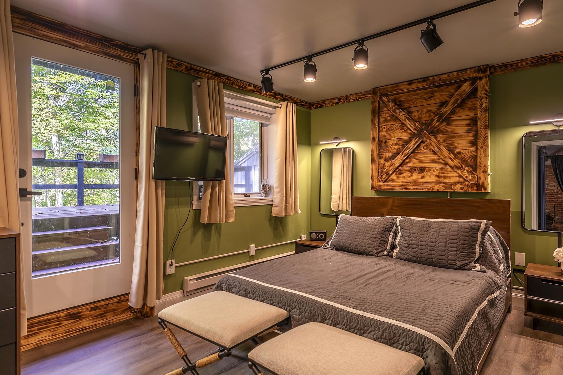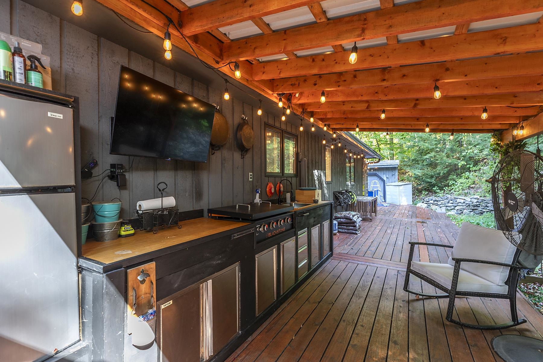 This spacious raised ranch sits on 1.08 acres and offers seasonal western mountain views, with close proximity to both Bromley and Stratton. The home features a large, open-concept floor plan on the main level, including a living room and a combined dining/kitchen area with a cathedral ceiling and a wood-burning stove on a raised brick hearth. This floor also has three bedrooms and one full bath. The dining area includes a double-door glass slider that opens to an elevated wood deck, ideal for outdoor dining during the summer. There is an outdoor kitchen. The downstairs area provides additional finished living space, featuring a family room (22x14) with a second wood-burning stove, an office (10x10), a studio space, and another full bath. Outdoors, the property includes two large wood storage sheds, one of which is heated, and a third shed specifically for firewood storage. The natural landscape design is enhanced by several curved stonewalls and numerous mature hardwood trees, with minimal lawn maintenance required. Please note that all measurements are approximate.