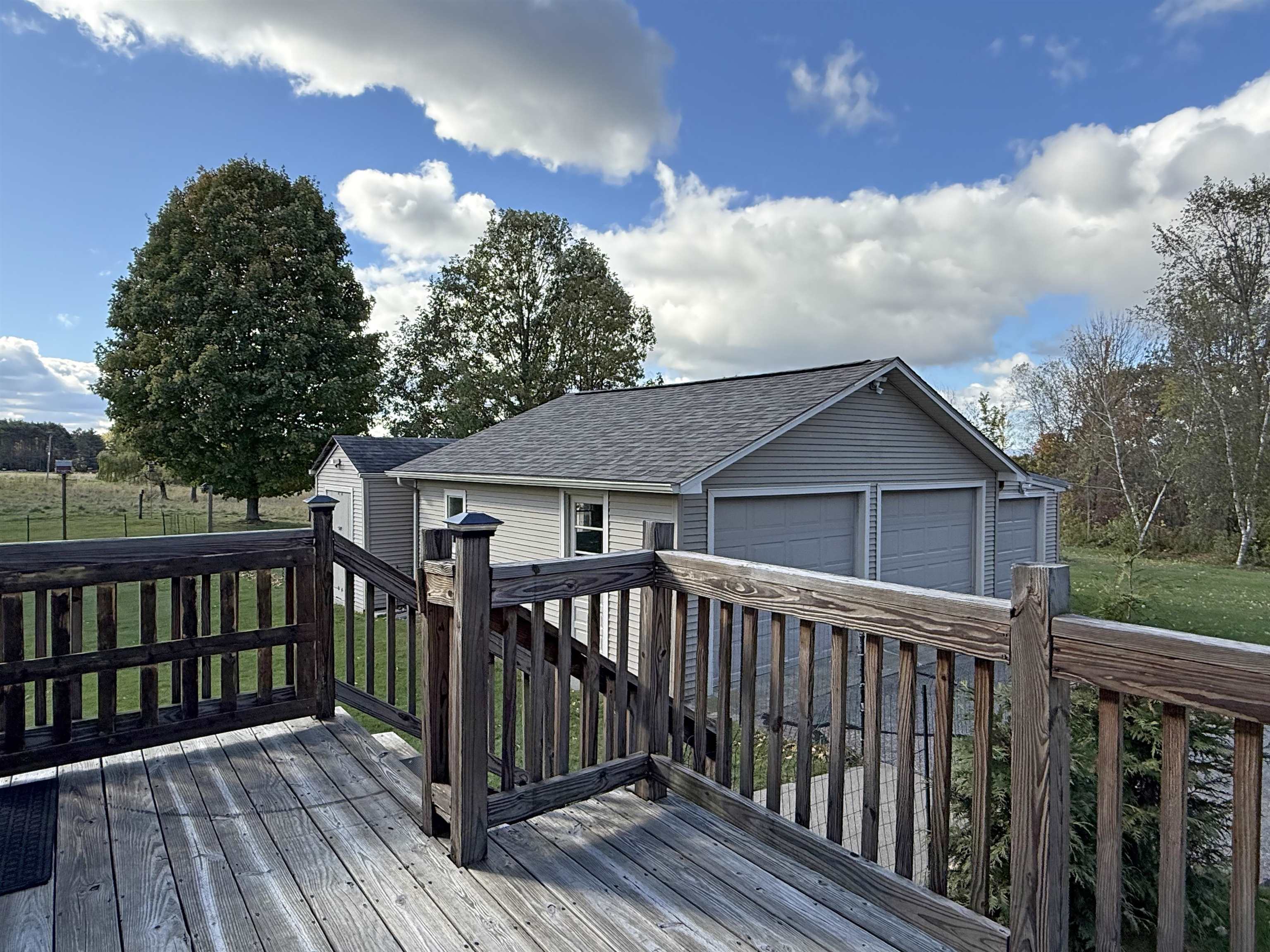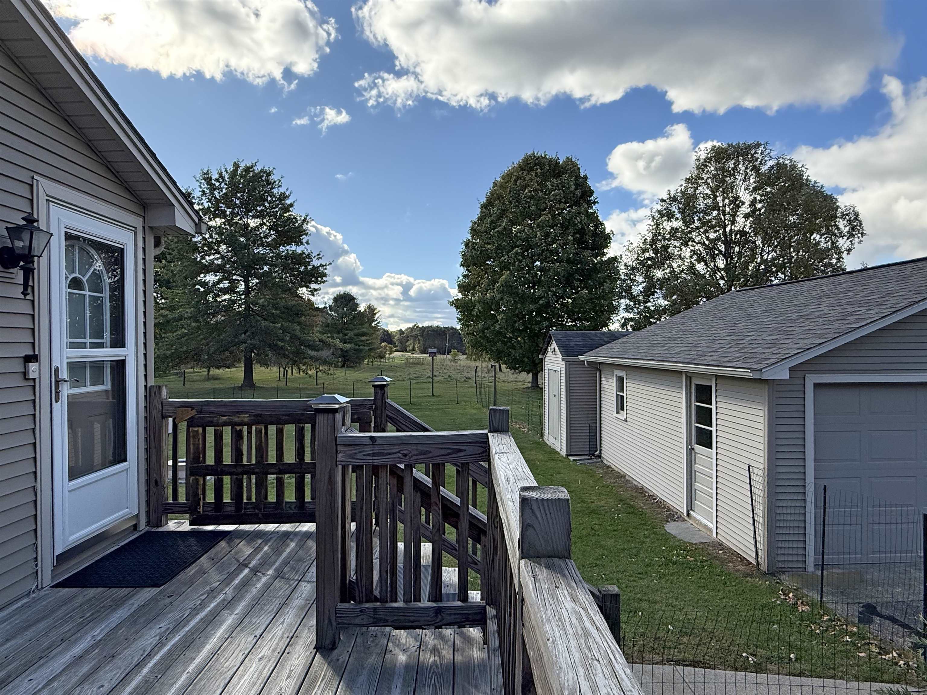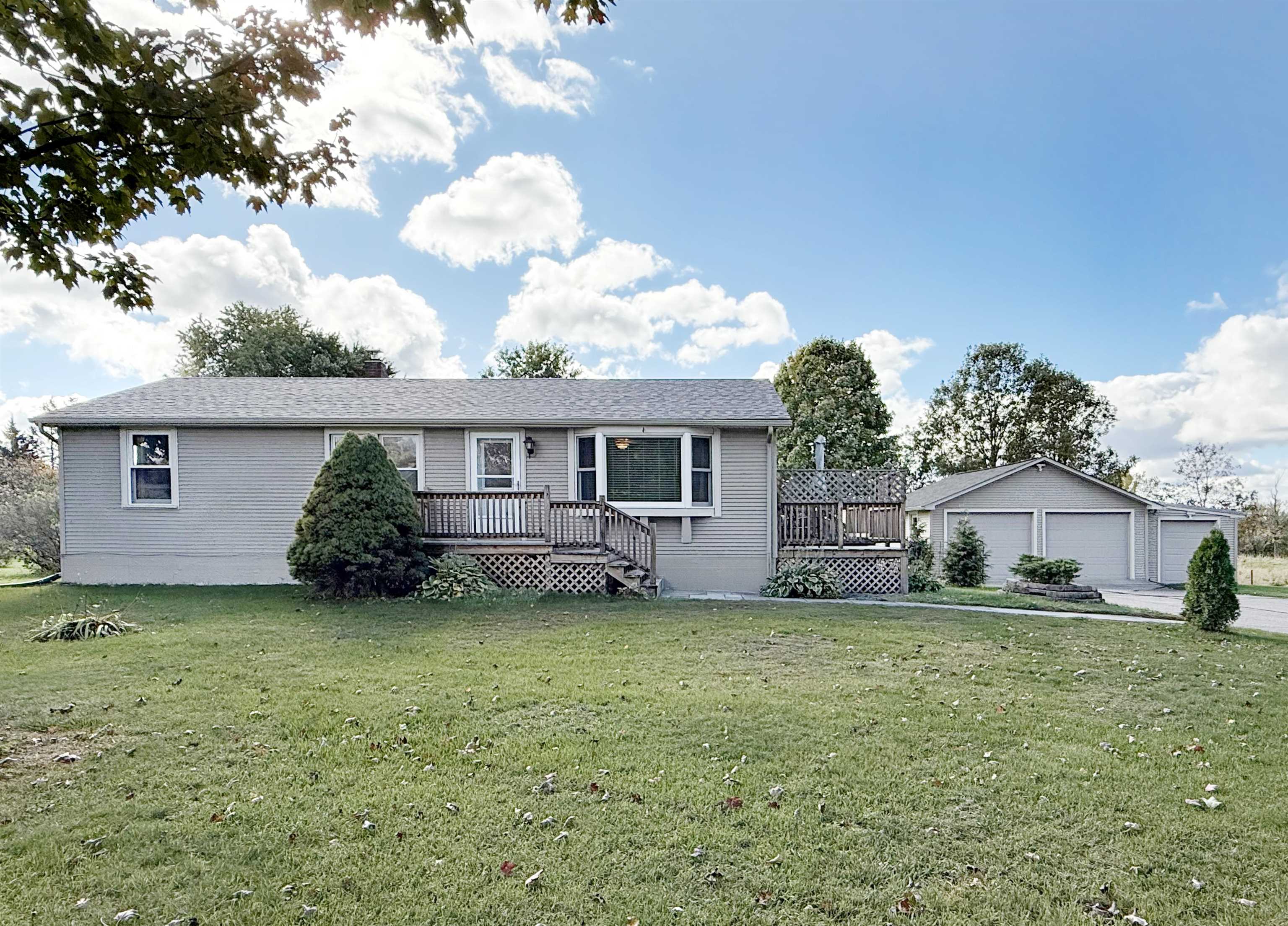 This well maintained, single-level home features 3 bedrooms and 1 bathroom, nestled on a peaceful country lot with pastoral views. Step through the side porch into the inviting eat-in kitchen or enter via the front porch into a tiled foyer that leads into the spacious living room, highlighted by natural wood flooring and a sunny bay window. The living room flows seamlessly into the well-designed kitchen located at the back of the home, offering ample counter space—perfect for cooking and entertaining in a warm, welcoming environment. A short hall connects the main living area to the full bathroom and three comfortable bedrooms, providing a thoughtful separation of living and sleeping spaces. The tidy basement includes a laundry area, the home's mechanical systems, and offers plenty of additional space for storage or hobbies. Outdoors, you’ll find two decks and a level 2-acre yard—ideal for gardens, play, and relaxation. Newly planted shrubs along the property line enhance privacy and curb appeal. Additional features include a detached two-car garage with an extra attached bay and two detached sheds, providing ample space for vehicles and enclosed storage. Vinyl siding and a newer roof ensure minimal maintenance. Don’t miss the opportunity to explore this charming home—check out the 3D virtual tour!
