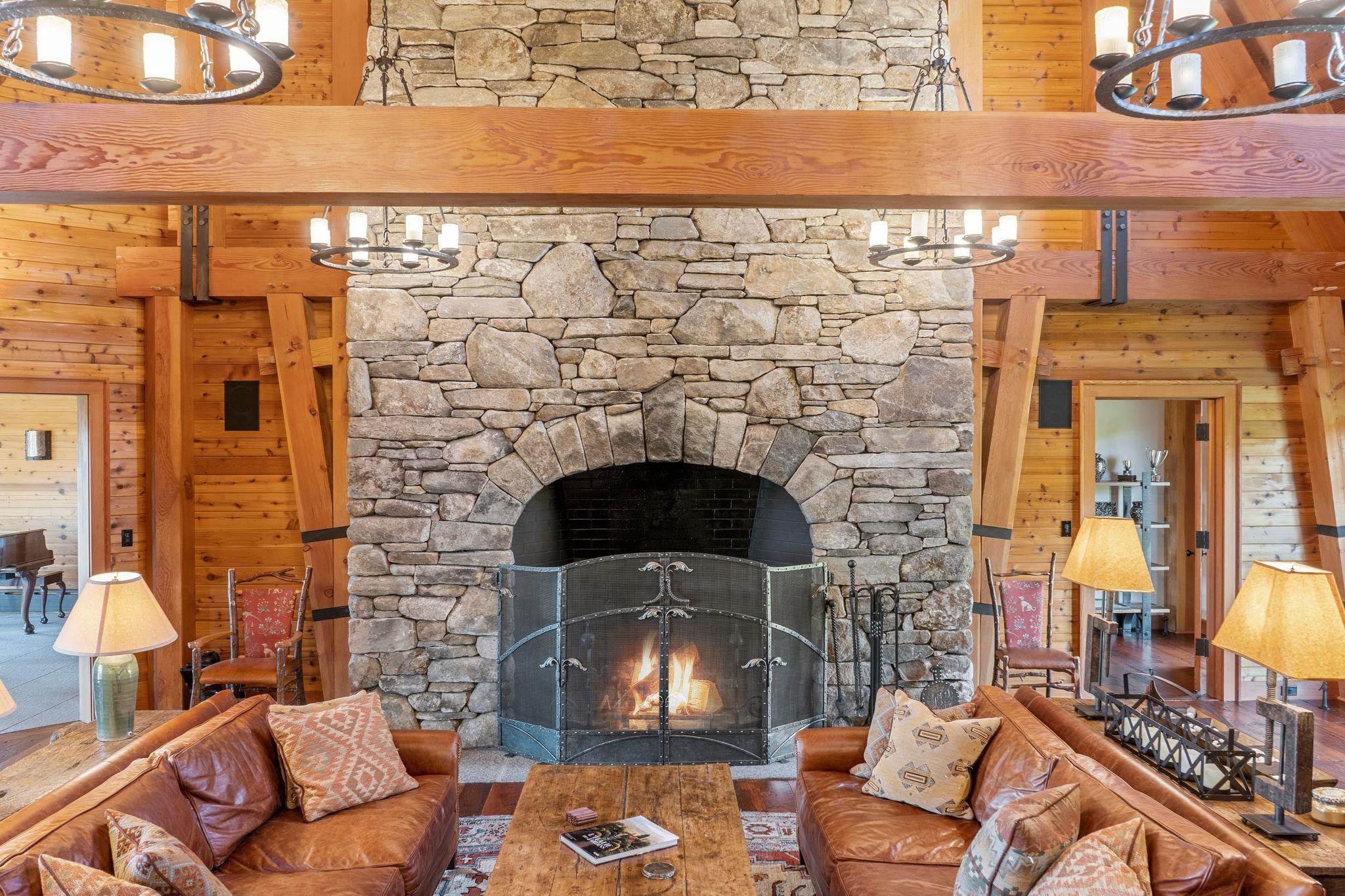 - Blinds, Cathedral Ceiling, Cedar Closet, Dining Area, Fireplace Screens/Equip, Wood Fireplace, 3+ Fireplaces, Furnished, Hearth, Kitchen Island, Kitchen/Dining, Kitchen/Family, Kitchen/Living, Primary BR w/ BA, Natural Light, Natural Woodwork, Security, Soaking Tub, Indoor Storage, Vaulted Ceiling, Walk-in Closet, Window Treatment
