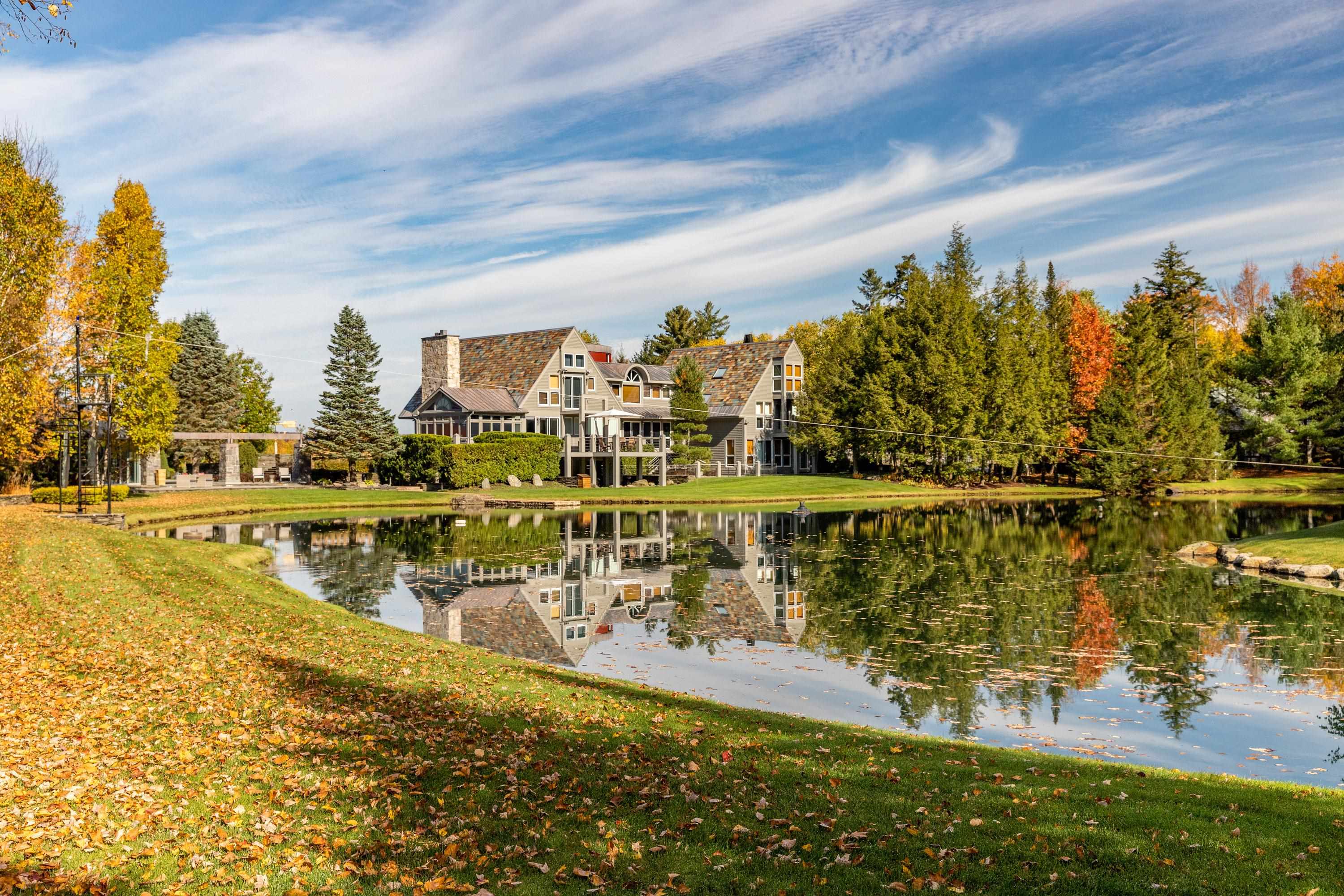 A world apart yet close to it all, this extraordinary 68-acre estate captures the essence of refined Vermont living where architectural sophistication meets natural beauty and absolute privacy. Set along a quiet country road just minutes from the heart of Stowe, the property reveals itself gradually, unfolding across rolling meadows, tranquil woodlands, and manicured lawns. At its heart lies a gracious six-bedroom main residence, complemented by a two-bedroom guest house and gallery with elevator, a six-bay garage, barn, equipment building, and tennis pavilion. Twin deep-water ponds mirror the sky while forest trails invite exploration and the gentle sound of streams enhances tranquil character. Beyond everyday luxuries, amenities elevate this estate to a rarefied level: a thrilling zip line, architect-designed championship demi golf course, tennis court, glass cube warming hut, and sunken hot tub. The helicopter landing site offers effortless travel and direct access to Montreal, New York, or Boston.