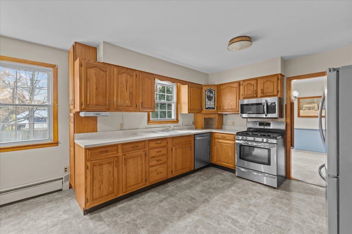 Don't miss this great value and rare opportunity to own this 5 bed 3 bath home in the Lakewood Estates. Great potential in this well maintained colonial style home. The 1st floor features a large living room, formal dining area, and a spacious eat-in kitchen. The kitchen boasts an abundance of cabinets, generous countertop space, and stainless steel appliances. The 1st floor also offers a 21x14 family room with hardwood floors and a large brick fireplace, a front foyer with slate and hall closet, a 3/4 bathroom, and a laundry room, along with a side-entry mudroom. The 2nd floor offers 5 true bedrooms. One bedroom, complete with built-in bookshelves, would be ideal for a home office. The primary bedroom includes an en-suite bathroom, remodeled in 2013, featuring an oversized walk-in shower, a new vanity with extra storage, and a water-efficient Toto toilet. The full bathroom remodeled in 2013, tub, tile, vanity, and a Toto toilet. The 1265 sq ft basement presents tremendous potential for additional finished living space. It currently includes baseboard heating, 8 daylight windows, drains and plumbing for a 1/2 bath. Basement walls and sills have been insulated with foam board and spray foam. Other features: two-car garage with high ceilings and 8-foot doors, and a large, partially fenced backyard. Direct access to Lake Champlain as a membership of the Lakewood Estate Beach Club. Walk to the Bike Path. shops, schools and minutes to downtown. All dim approx. see feature sheet