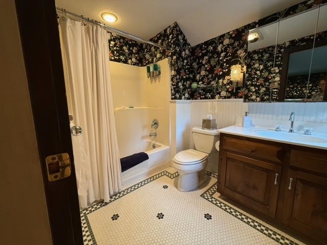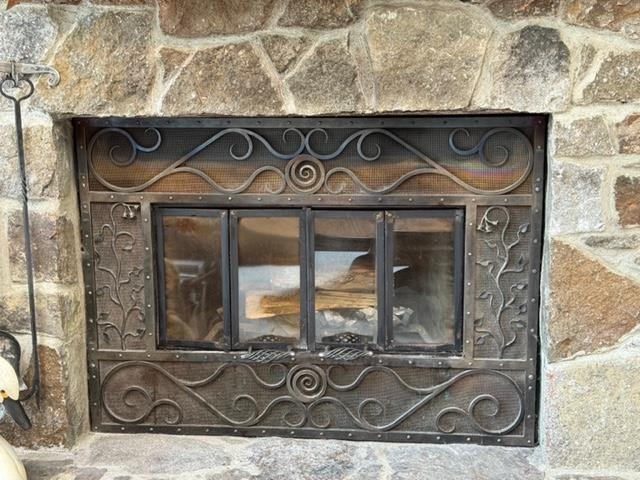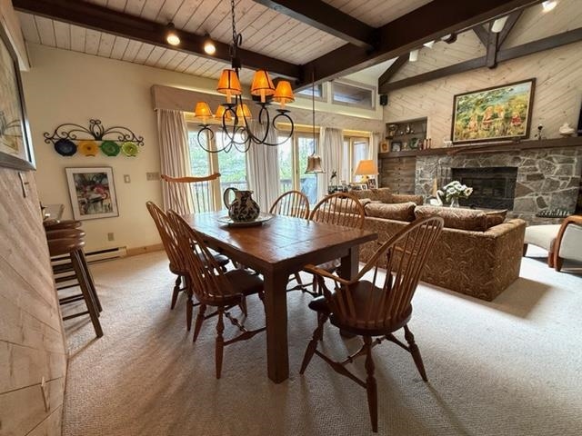 - Dining Area, Draperies, Wood Fireplace, Furnished, Natural Light, Natural Woodwork, Sauna, Vaulted Ceiling, 1st Floor Laundry
