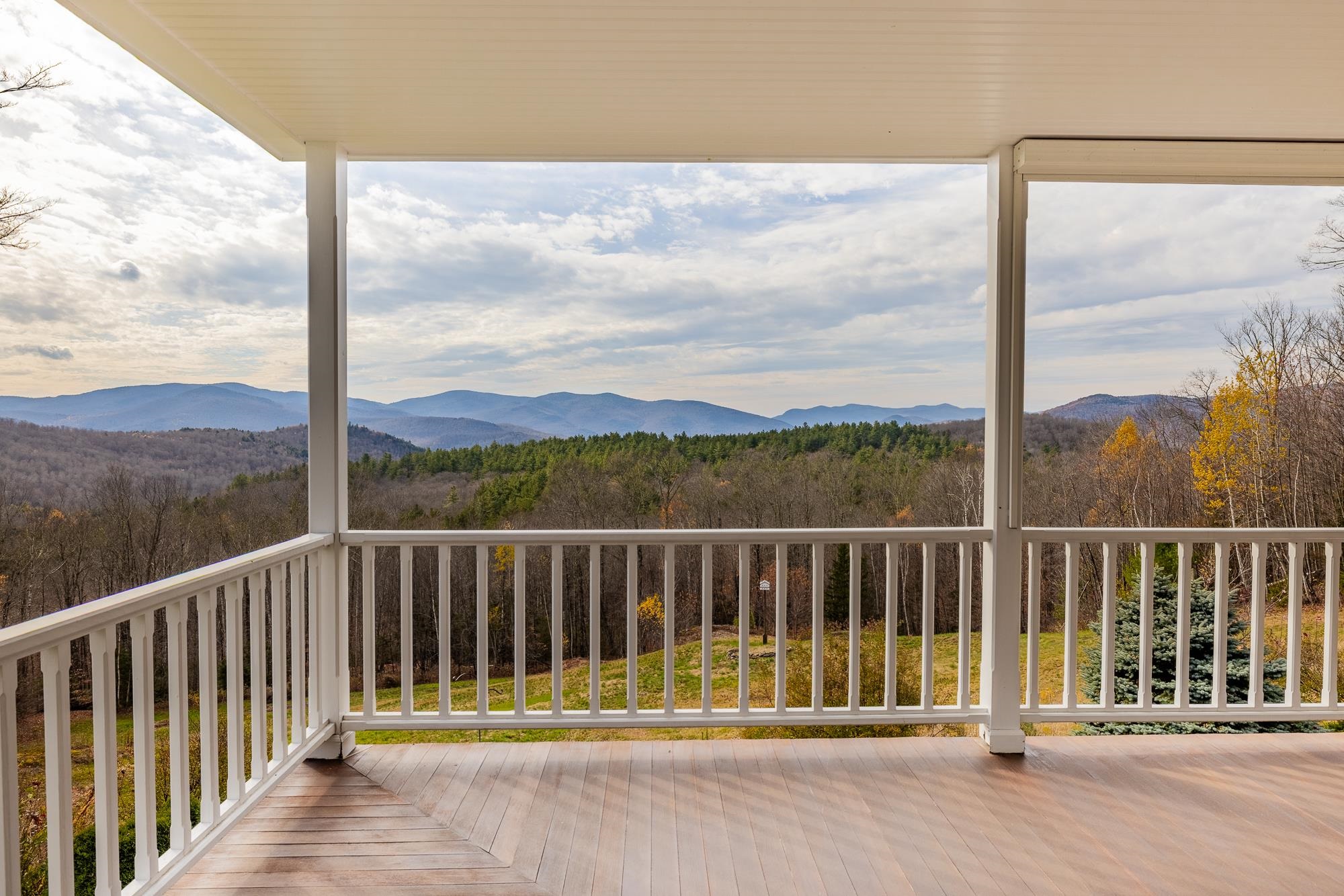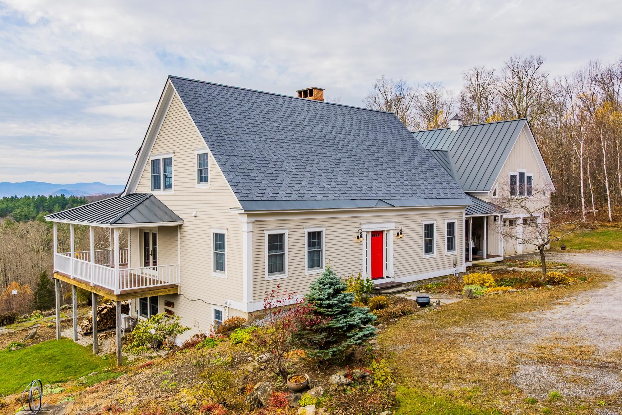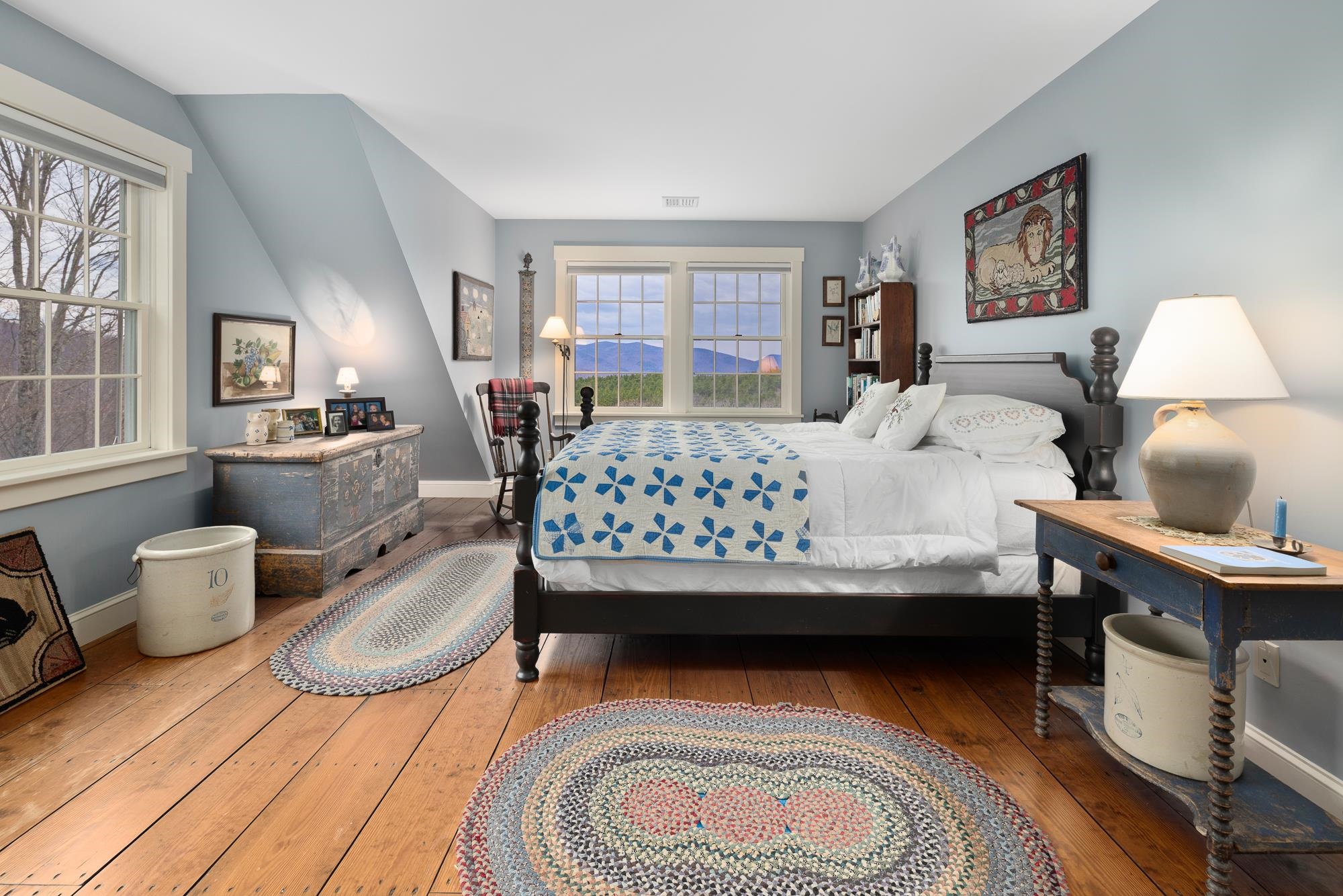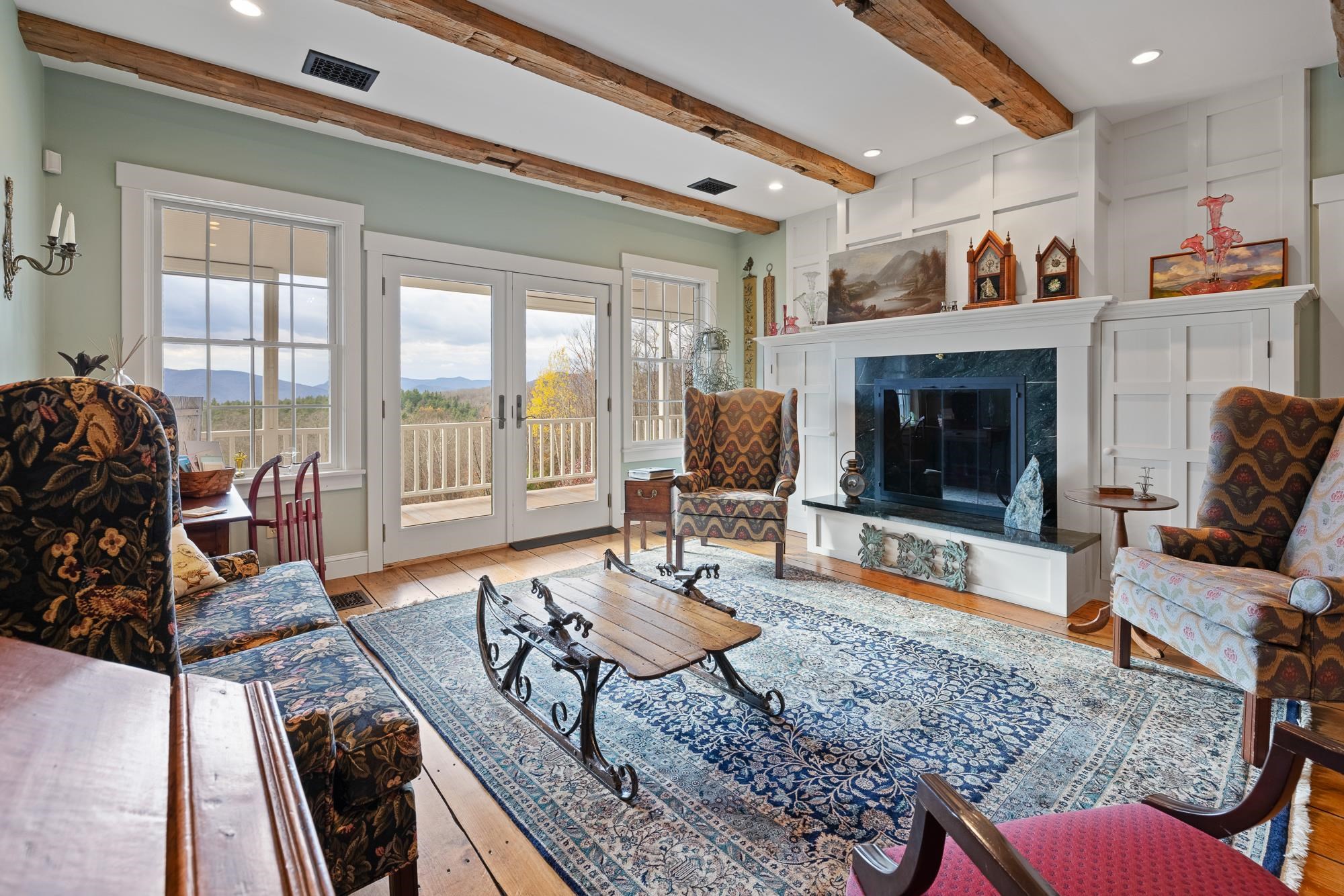 Set high on a quiet hillside overlooking the Green Mountains, this exceptional Vermont home blends rustic charm with modern warmth and efficiency. Every space, indoors and out, celebrates its connection to the surrounding landscape. Inviting living areas feature wide-plank floors, exposed beams, and large windows that frame mountain views. The kitchen combines timeless materials with contemporary comfort, offering soapstone counters, custom cabinetry, and a central island. From here, the space flows naturally through the dining room and into the fireside living area, creating a harmonious setting for gatherings and everyday living. The main-level primary suite provides convenience and privacy, complete with a spa-like bath and serene woodland views. Upstairs, additional bedrooms and a light-filled reading nook offer cozy retreats, while a second stairway leads to a flexible suite above the garage, ideal for guests, an office, or creative space. The lower level adds even more versatility, featuring a spacious family or game room with a wood stove and expansive mountain views. Outside, terraced stone gardens, meandering paths, and an expansive wraparound porch create a seamless connection to nature. An extensive network of private trails winds through the property, leading to “The Point, ” a tranquil woodland overlook that captures the magic of Vermont’s changing seasons.