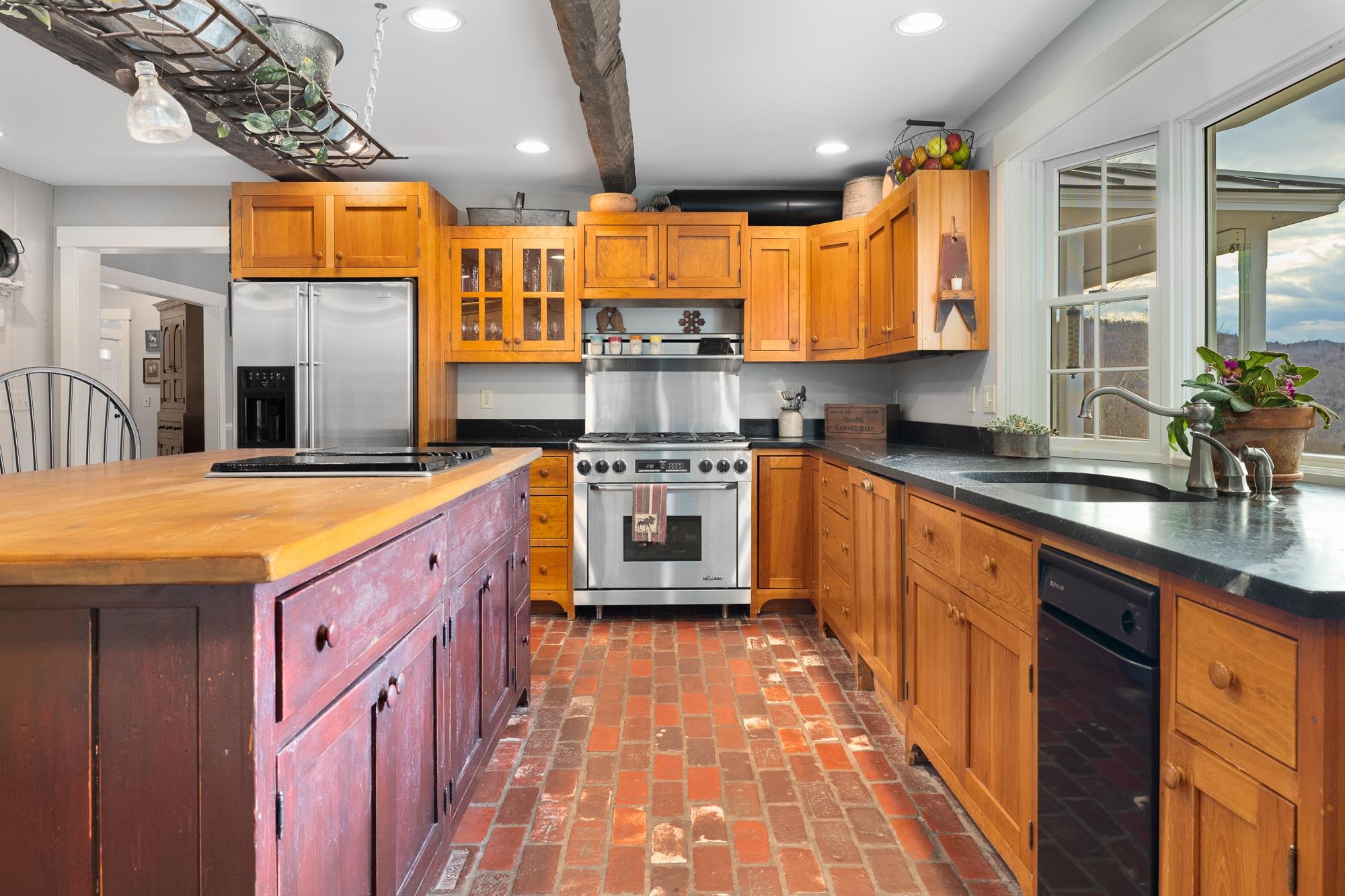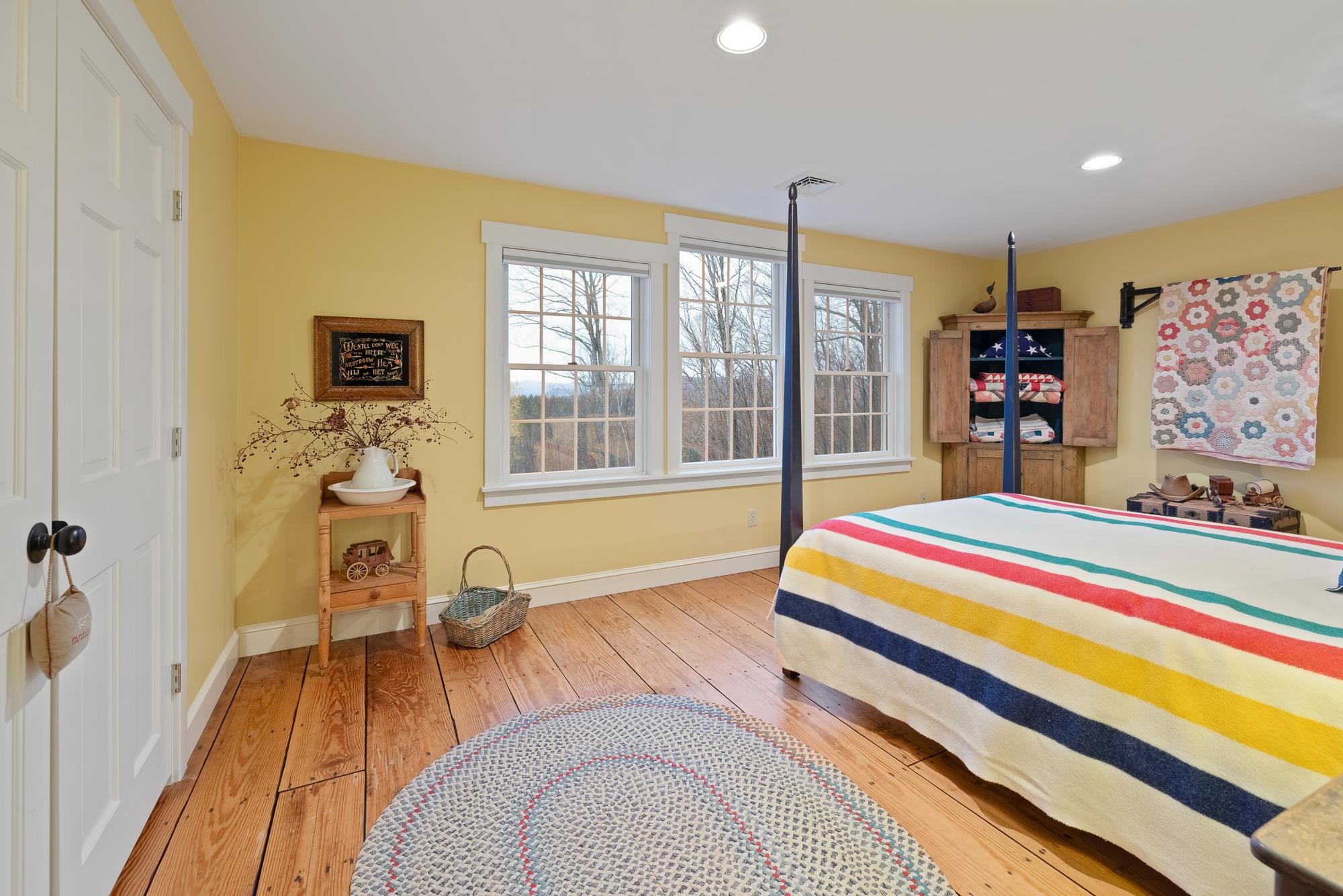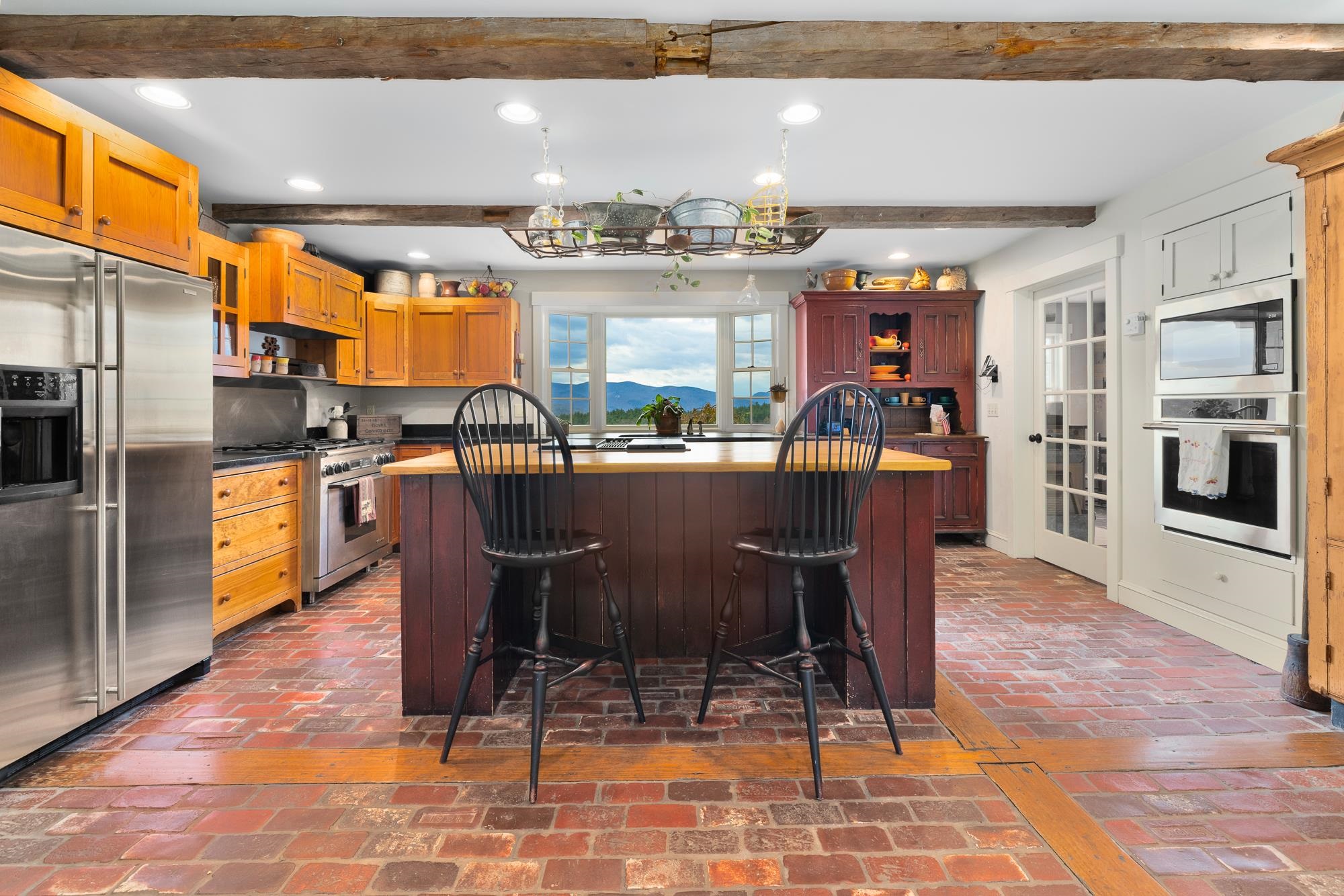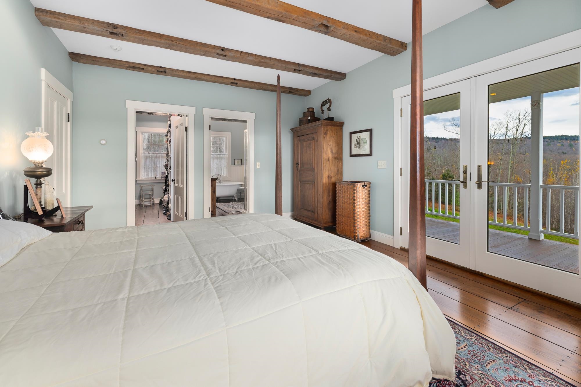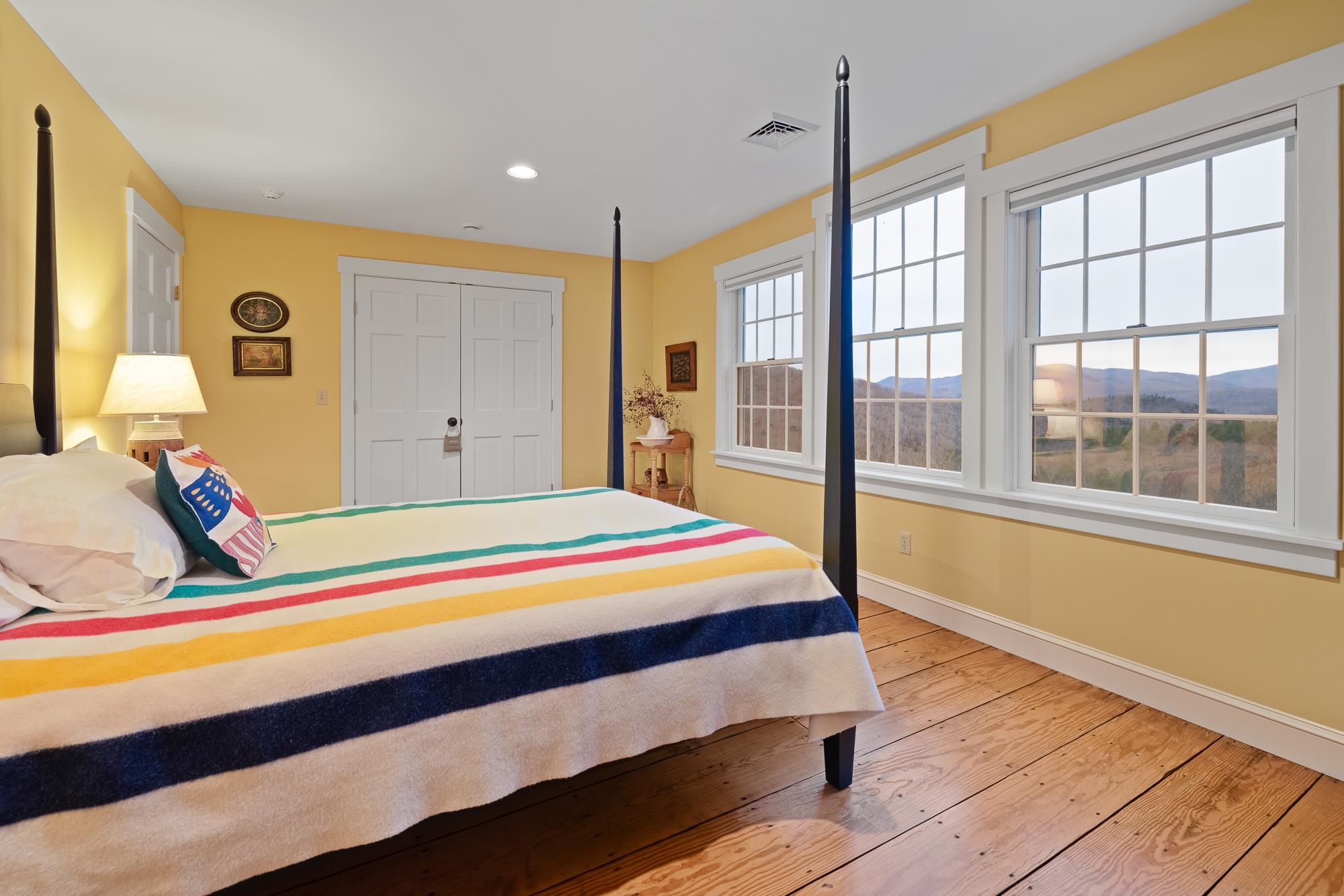 Set high on a quiet hillside overlooking the Green Mountains, this exceptional Vermont home blends rustic charm with modern warmth and efficiency. Every space, indoors and out, celebrates its connection to the surrounding landscape. Inviting living areas feature wide-plank floors, exposed beams, and large windows that frame mountain views. The kitchen combines timeless materials with contemporary comfort, offering soapstone counters, custom cabinetry, and a central island. From here, the space flows naturally through the dining room and into the fireside living area, creating a harmonious setting for gatherings and everyday living. The main-level primary suite provides convenience and privacy, complete with a spa-like bath and serene woodland views. Upstairs, additional bedrooms and a light-filled reading nook offer cozy retreats, while a second stairway leads to a flexible suite above the garage, ideal for guests, an office, or creative space. The lower level adds even more versatility, featuring a spacious family or game room with a wood stove and expansive mountain views. Outside, terraced stone gardens, meandering paths, and an expansive wraparound porch create a seamless connection to nature. An extensive network of private trails winds through the property, leading to “The Point, ” a tranquil woodland overlook that captures the magic of Vermont’s changing seasons.