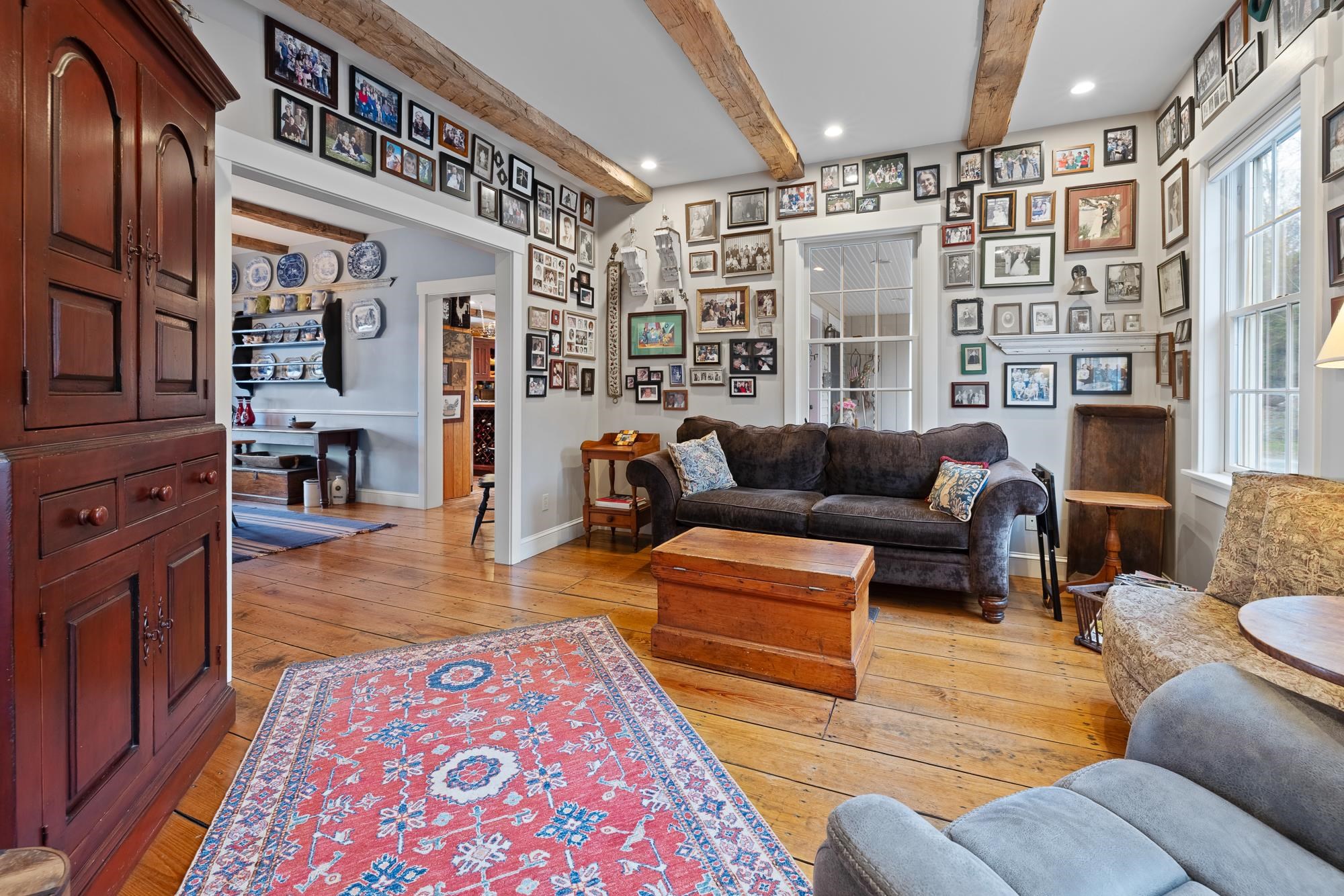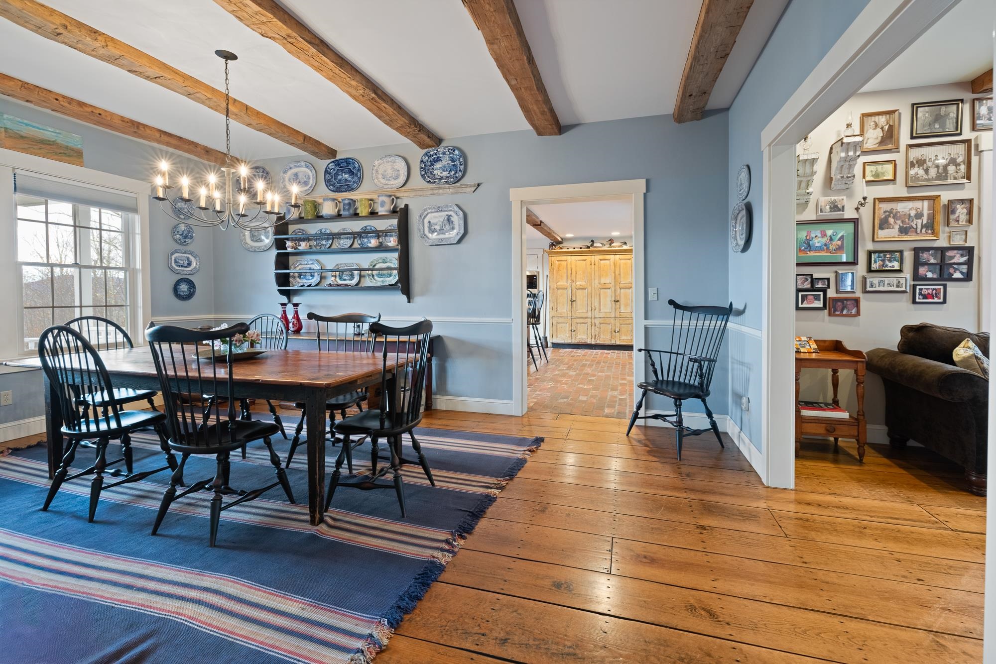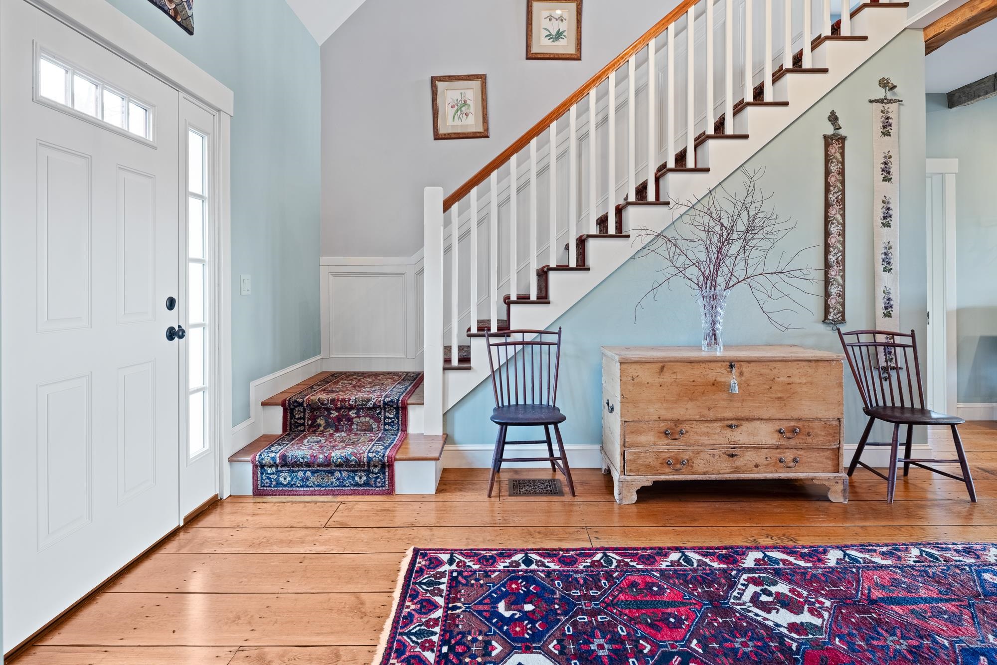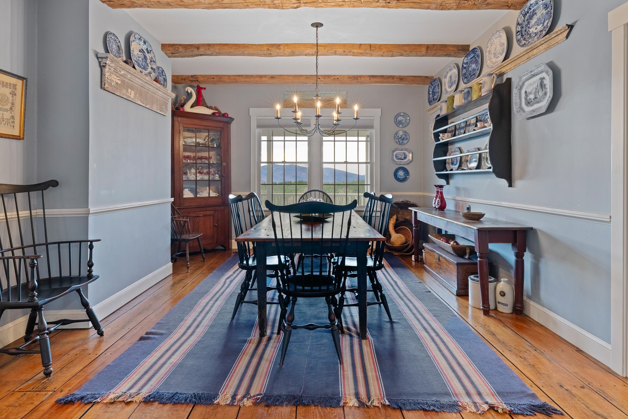 Set high on a quiet hillside overlooking the Green Mountains, this exceptional Vermont home blends rustic charm with modern warmth and efficiency. Every space, indoors and out, celebrates its connection to the surrounding landscape. Inviting living areas feature wide-plank floors, exposed beams, and large windows that frame mountain views. The kitchen combines timeless materials with contemporary comfort, offering soapstone counters, custom cabinetry, and a central island. From here, the space flows naturally through the dining room and into the fireside living area, creating a harmonious setting for gatherings and everyday living. The main-level primary suite provides convenience and privacy, complete with a spa-like bath and serene woodland views. Upstairs, additional bedrooms and a light-filled reading nook offer cozy retreats, while a second stairway leads to a flexible suite above the garage, ideal for guests, an office, or creative space. The lower level adds even more versatility, featuring a spacious family or game room with a wood stove and expansive mountain views. Outside, terraced stone gardens, meandering paths, and an expansive wraparound porch create a seamless connection to nature. An extensive network of private trails winds through the property, leading to “The Point, ” a tranquil woodland overlook that captures the magic of Vermont’s changing seasons.
