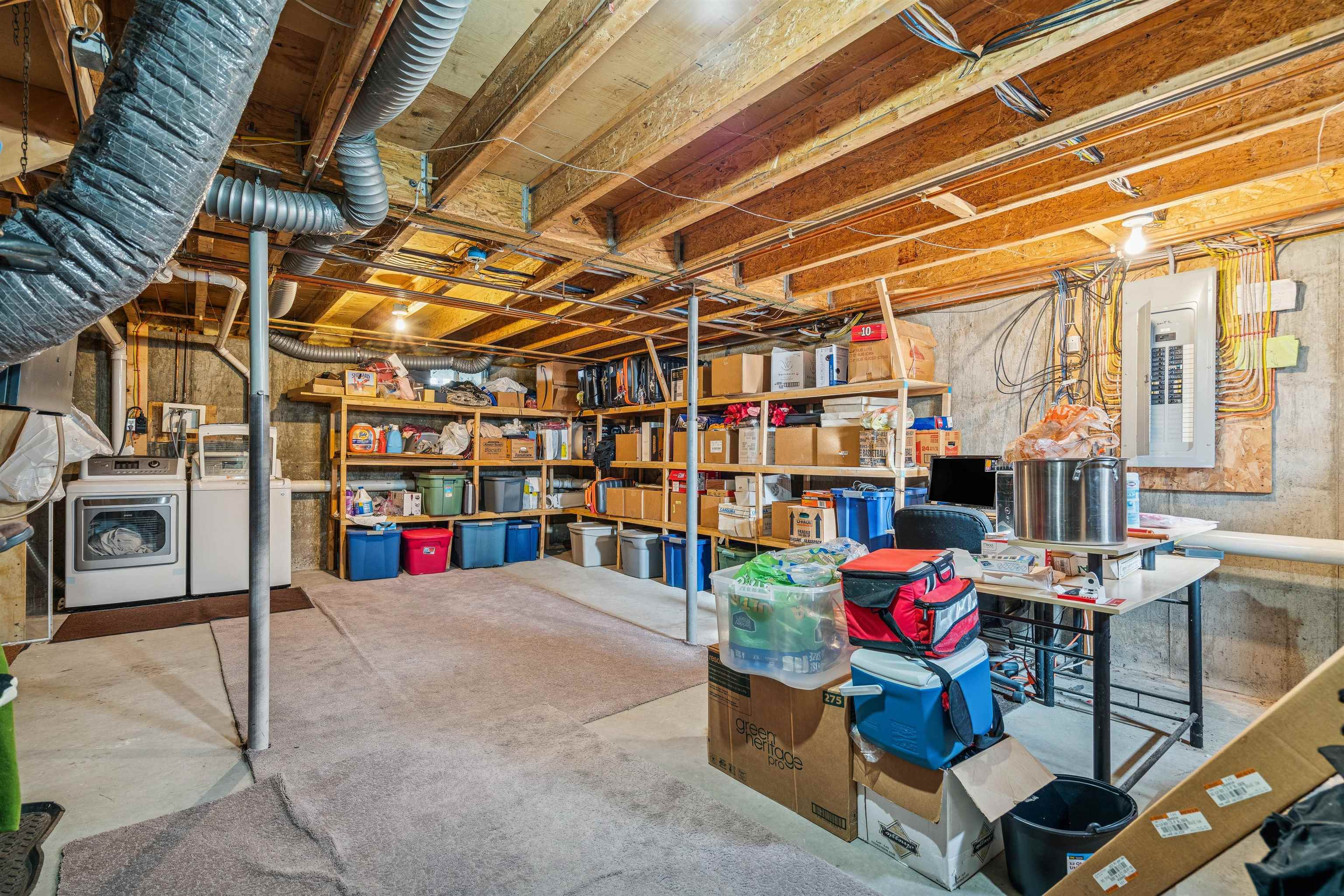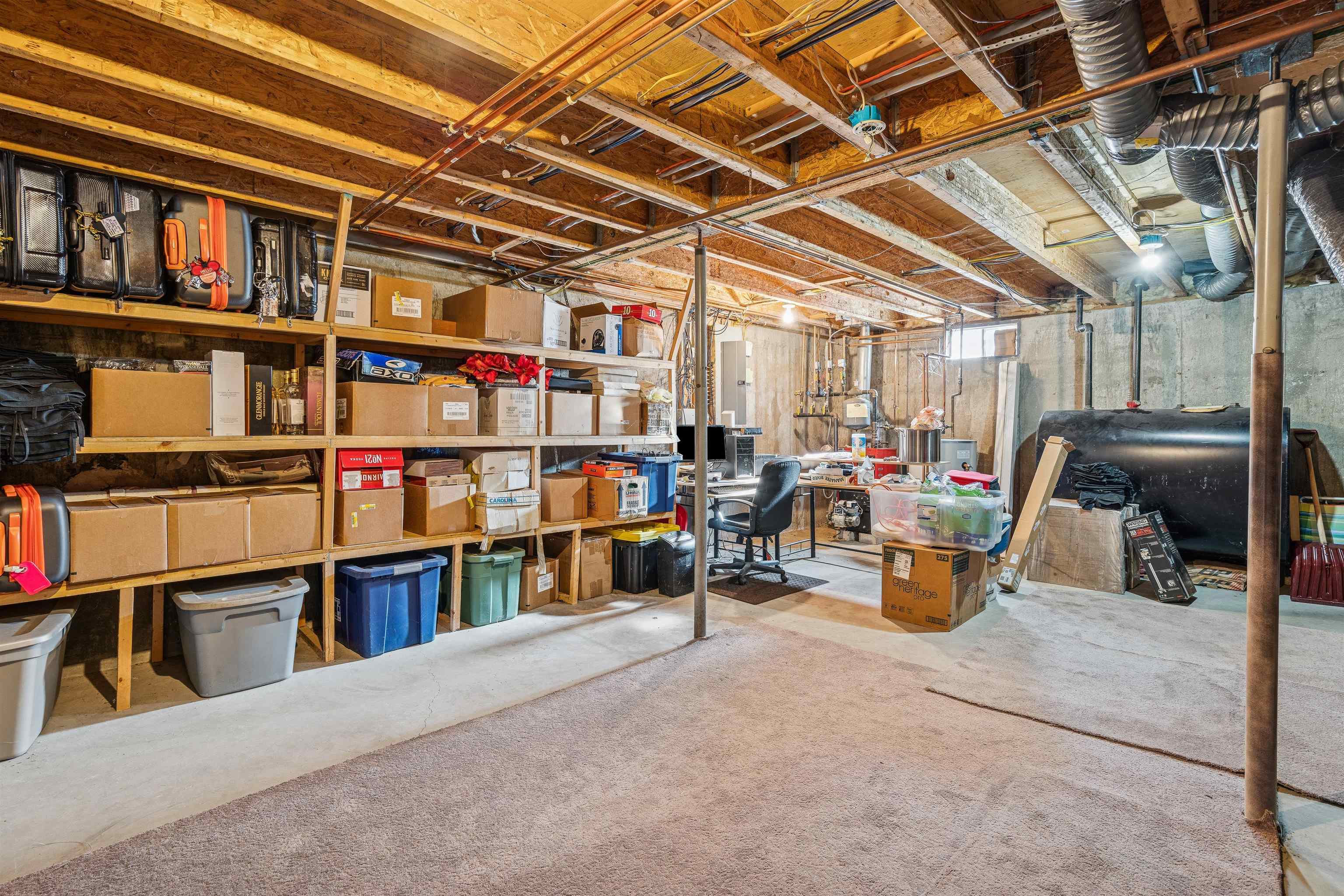 - Concrete, Concrete Floor, Full, Interior Stairs, Storage Space, Unfinished, Interior Access, Basement Stairs