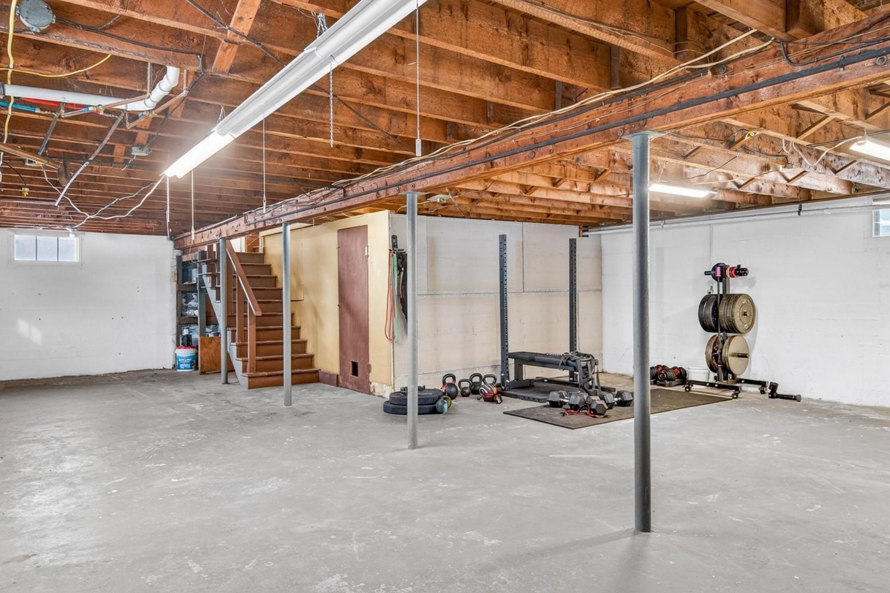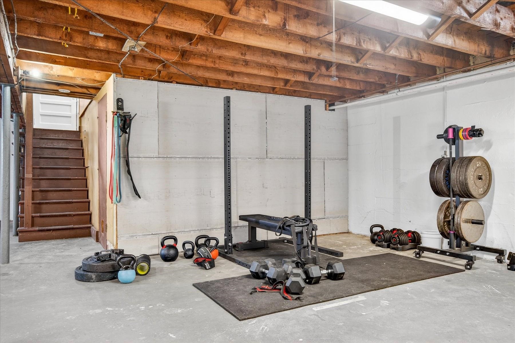 - Concrete, Concrete Floor, Full, Interior Stairs, Storage Space, Sump Pump, Unfinished