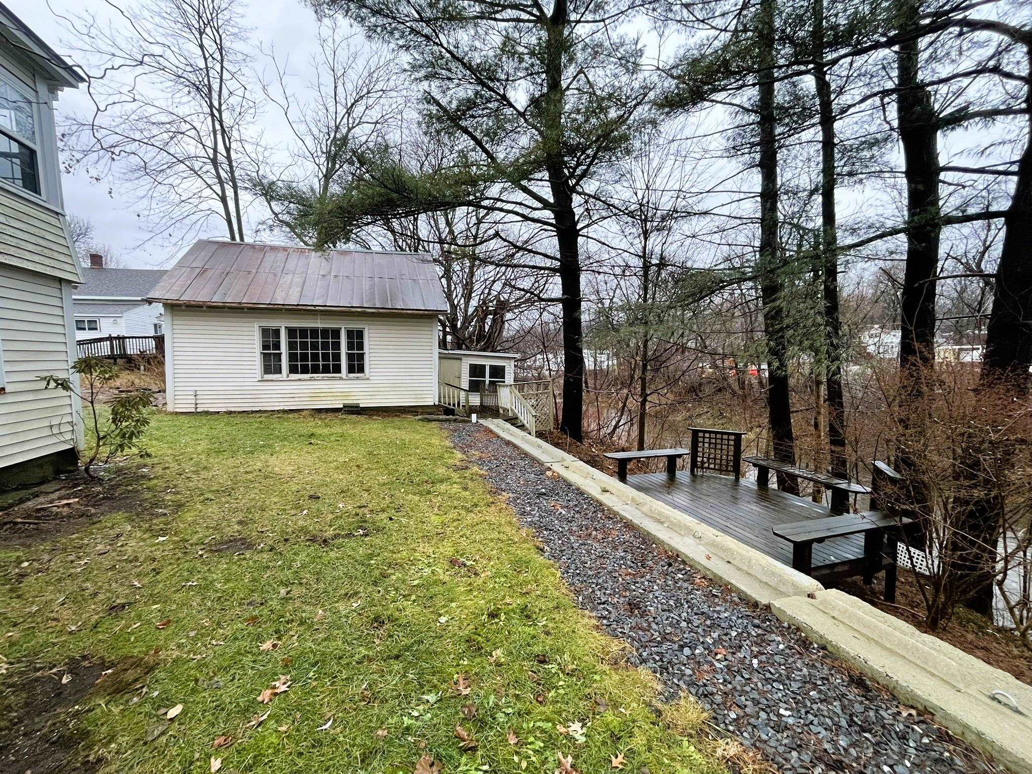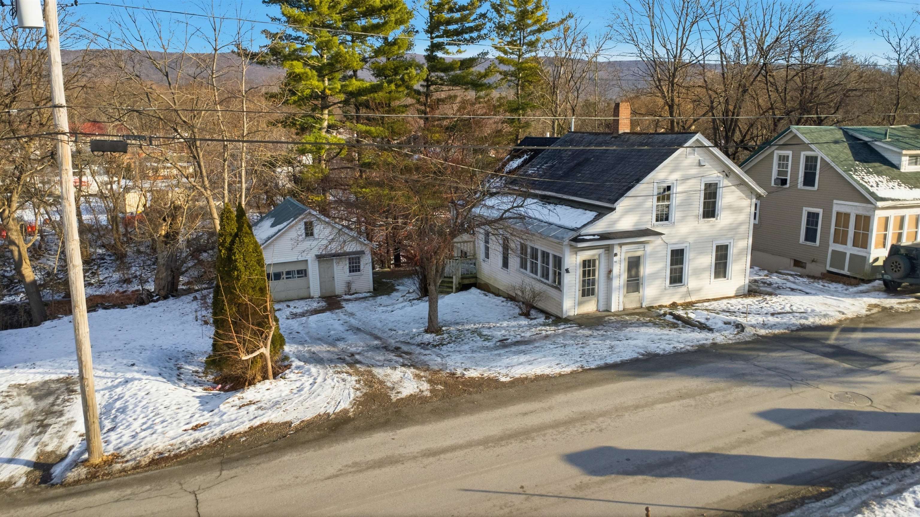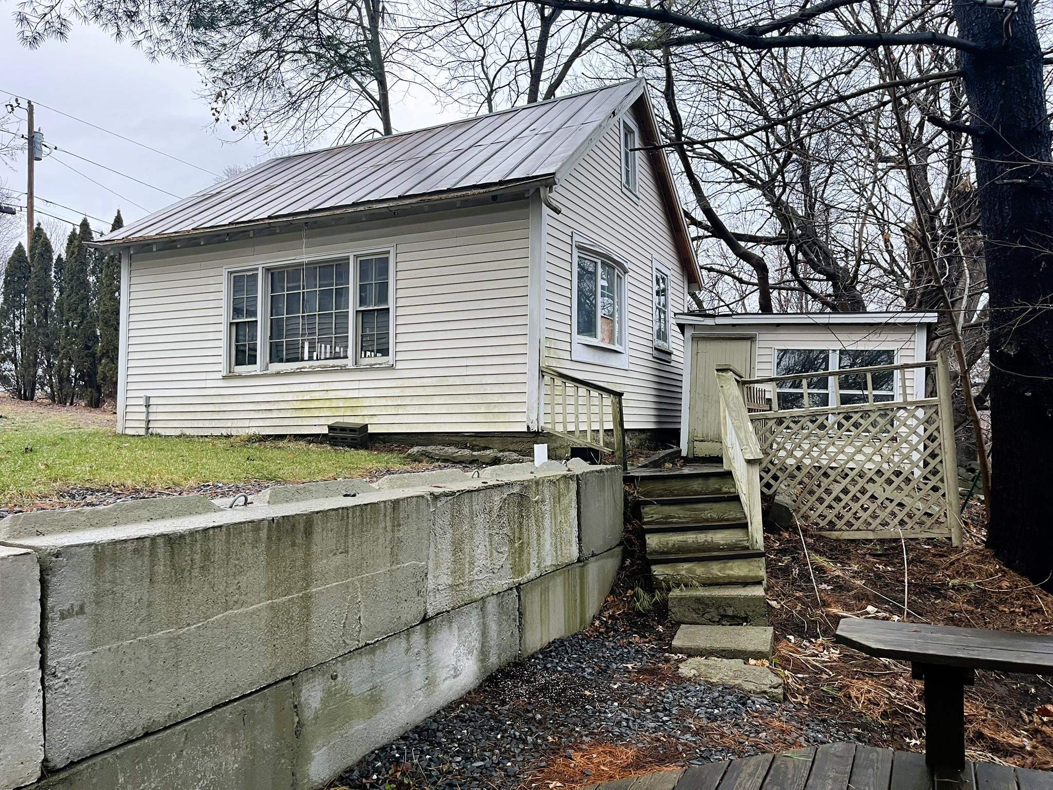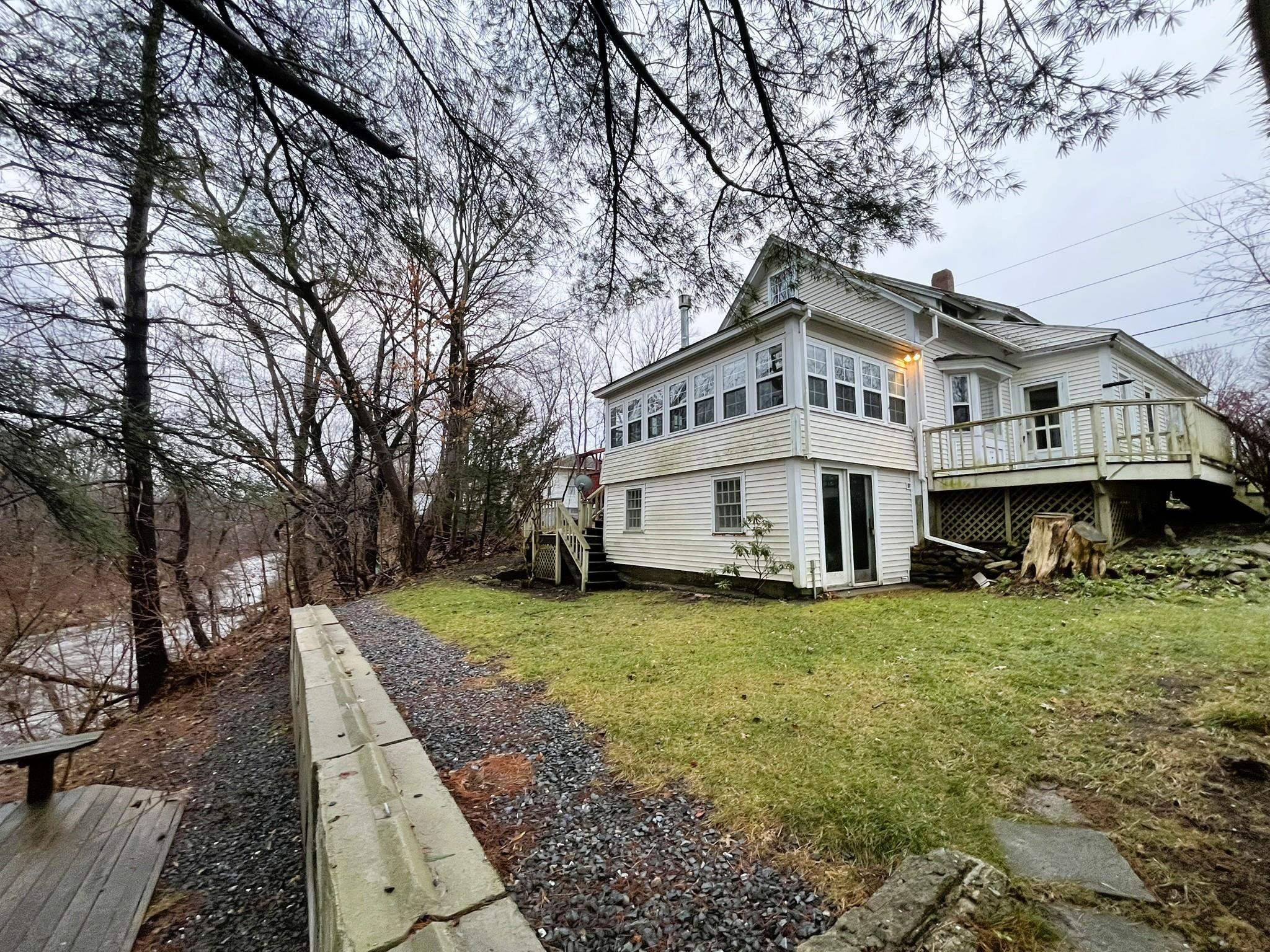 Affordable housing on your holiday wish list? Look no further. This charming home—originally built as a single-family residence—offers generous space, character, and flexibility to meet a variety of needs. The current layout reflects a long-ago duplex conversion, but by reopening a now-closed interior door, it can easily function again as a cohesive single-family home. The main level offers two bedrooms, a full bath with classic wainscoting and pedestal sink, kitchen with breakfast bar, dining room with hardwood floors, and a spacious living room with a gas stove and peaceful views of the South Stream. Upstairs is another large bedroom with generous closet space, full bath with a brand-new toilet, second kitchen with glass-front cabinets, and an office with tree-house vibes. Laundry hookups are available on both levels, with a washer and dryer included upstairs and space for a stacked unit on the main floor. The dry basement with poured concrete floor provides ample storage and includes a walk-out workshop. Additional features include town water and sewer, forced hot air furnace and oil tank, separate electric meters and hot water tanks, and a detached two-car garage with attic storage, plus an additional shed. Enjoy two wood decks, a level backyard, and a newly installed concrete retaining wall. Set high above the riverbed and not in a flood zone, the home offers river views with peace of mind. A versatile property with charm, space, and value—schedule your showing today!