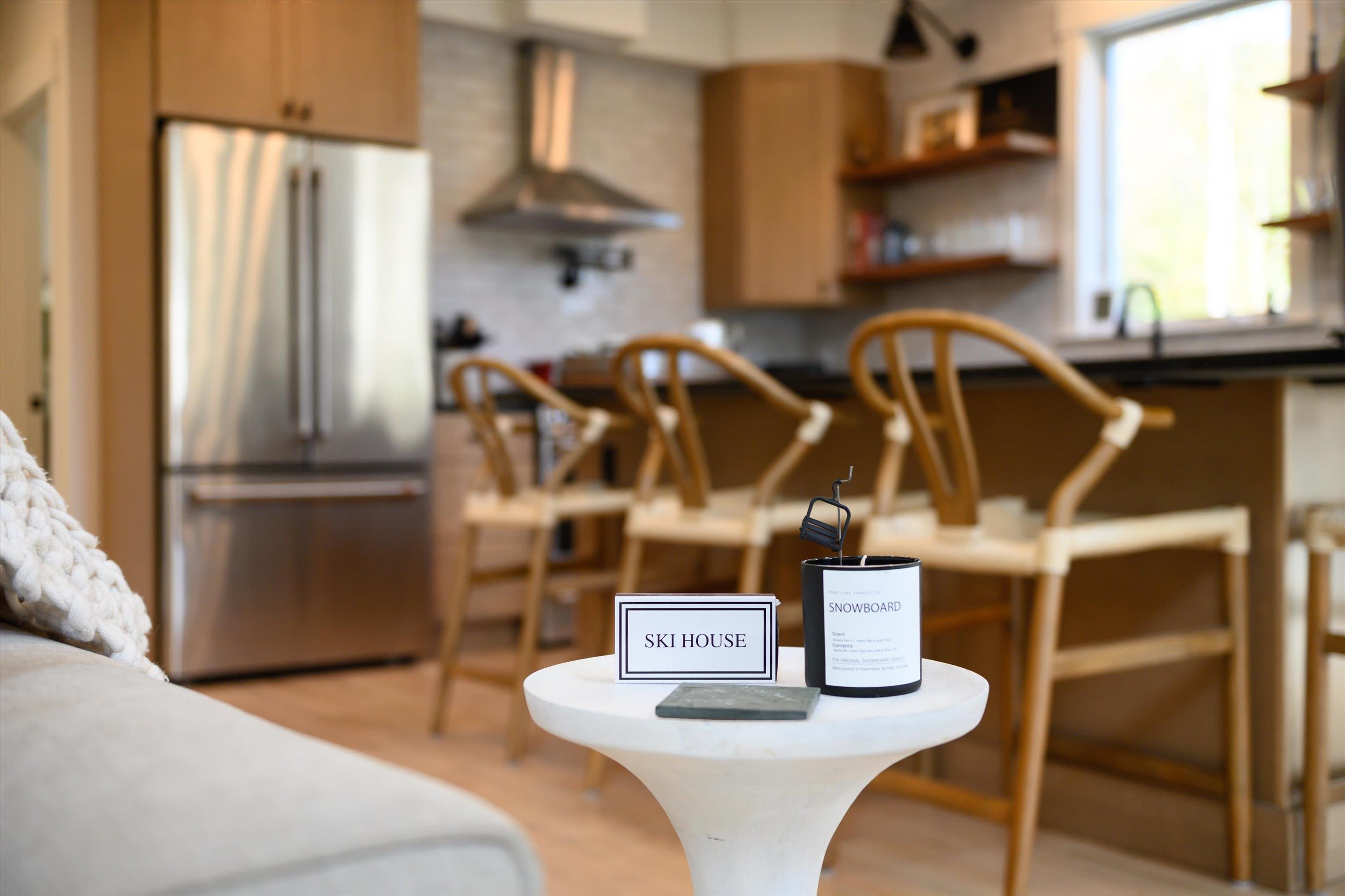 - Ceiling Fan, Dining Area, Draperies, Gas Fireplace, Furnished, Home Theater Wiring, Hot Tub, Kitchen Island, LED Lighting, Living/Dining, Natural Light, Surround Sound Wiring, Vaulted Ceiling, Walk-in Pantry, Window Treatment, Programmable Thermostat, Basement Laundry, Attic with Pulldown