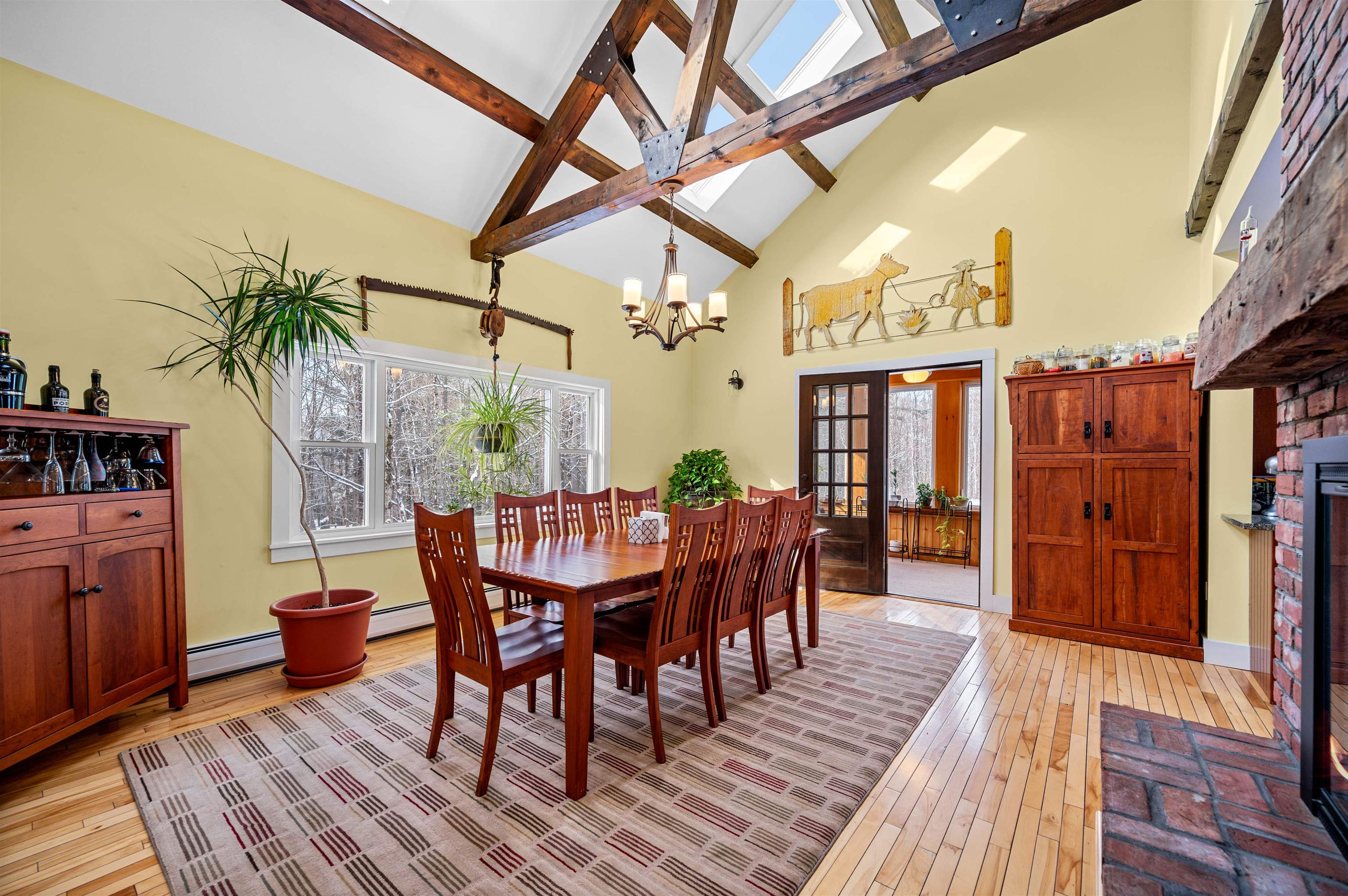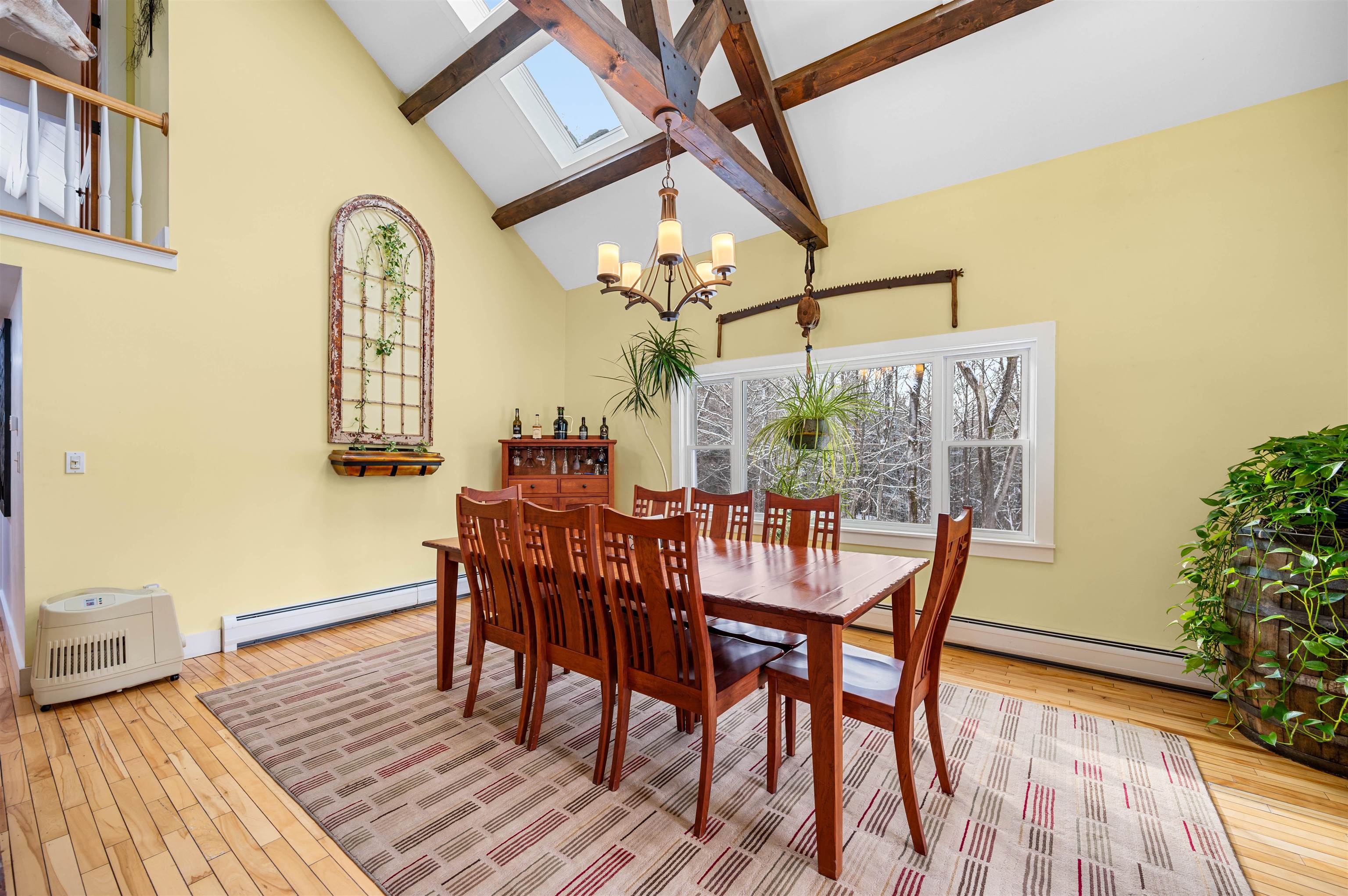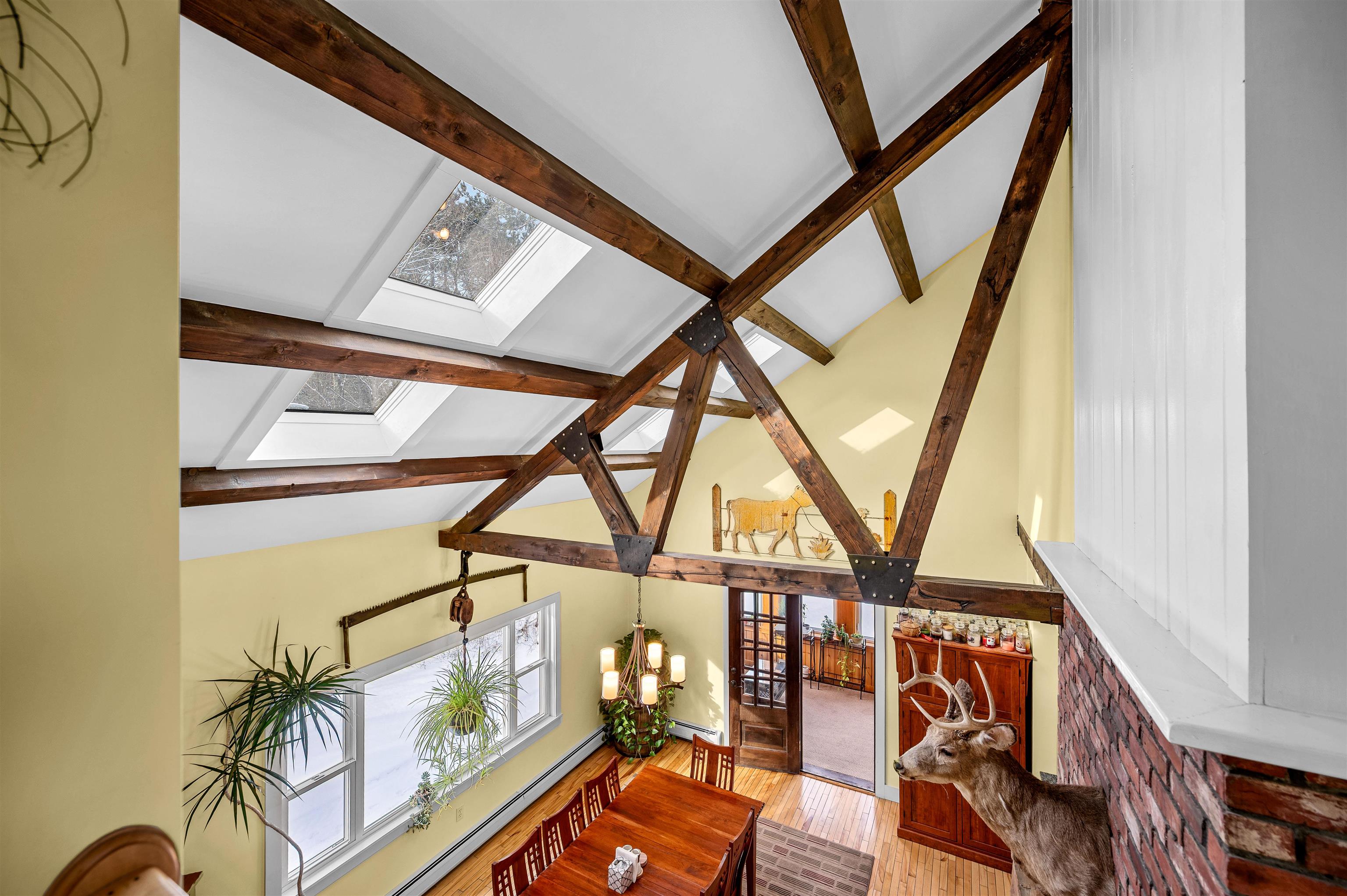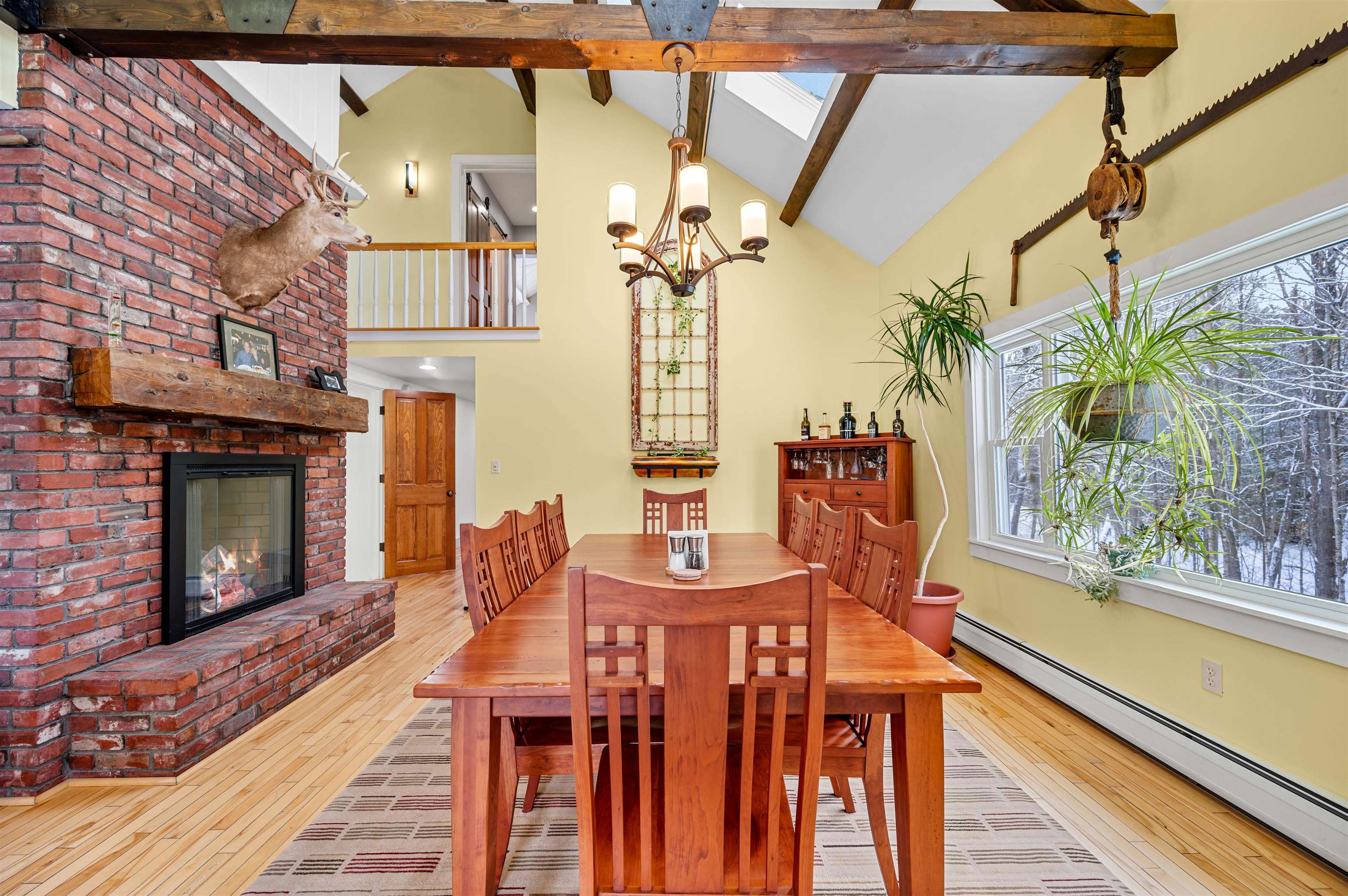 - Cathedral Ceiling, Ceiling Fan, Dining Area, Wood Fireplace, Kitchen Island, Natural Light, Natural Woodwork, Skylight, Basement Laundry