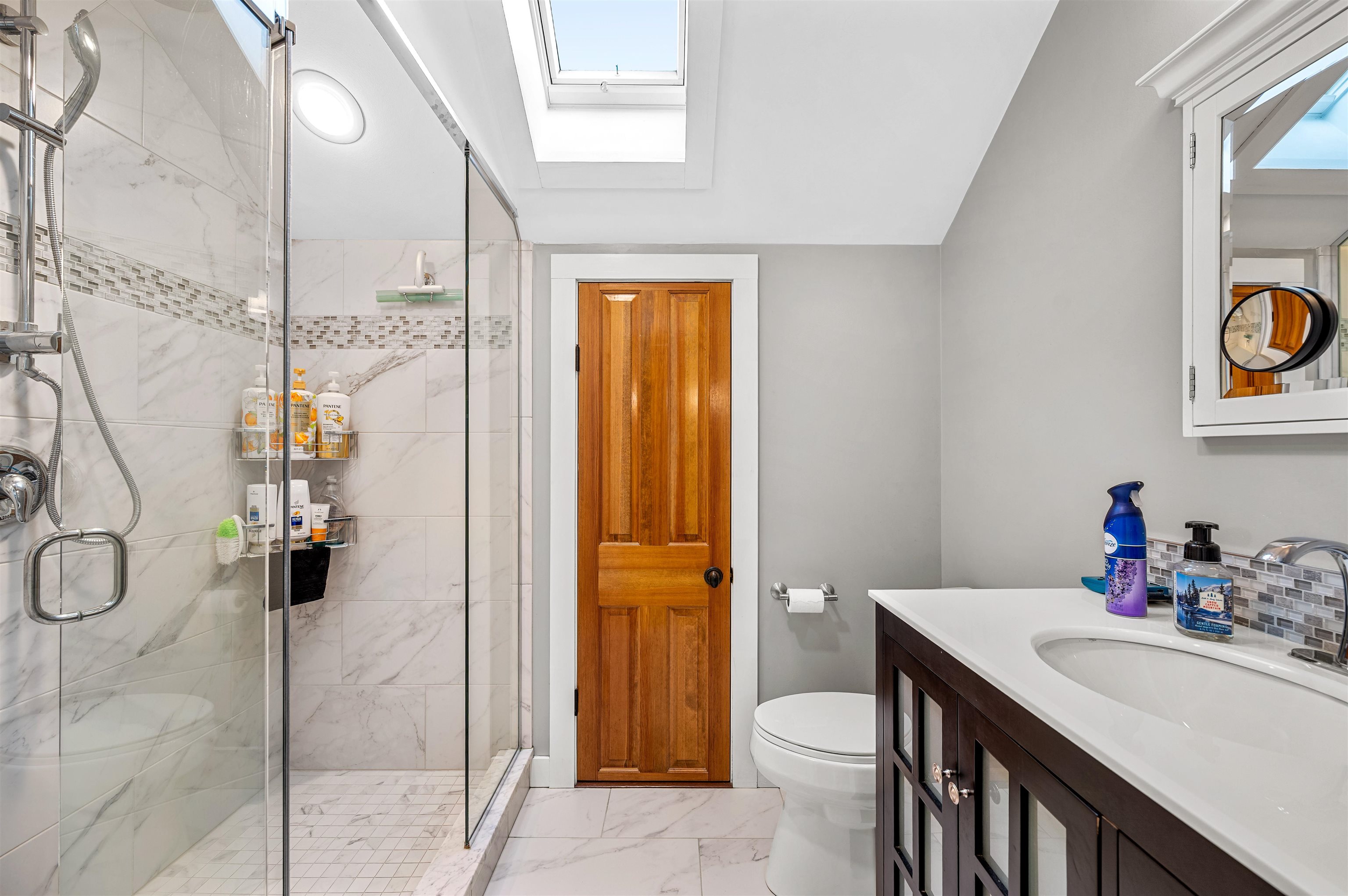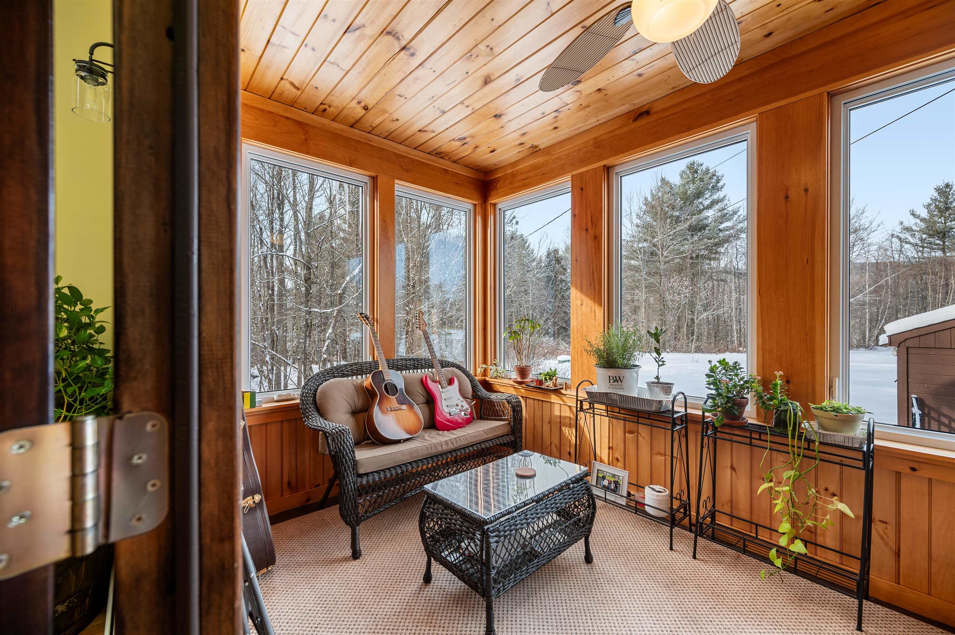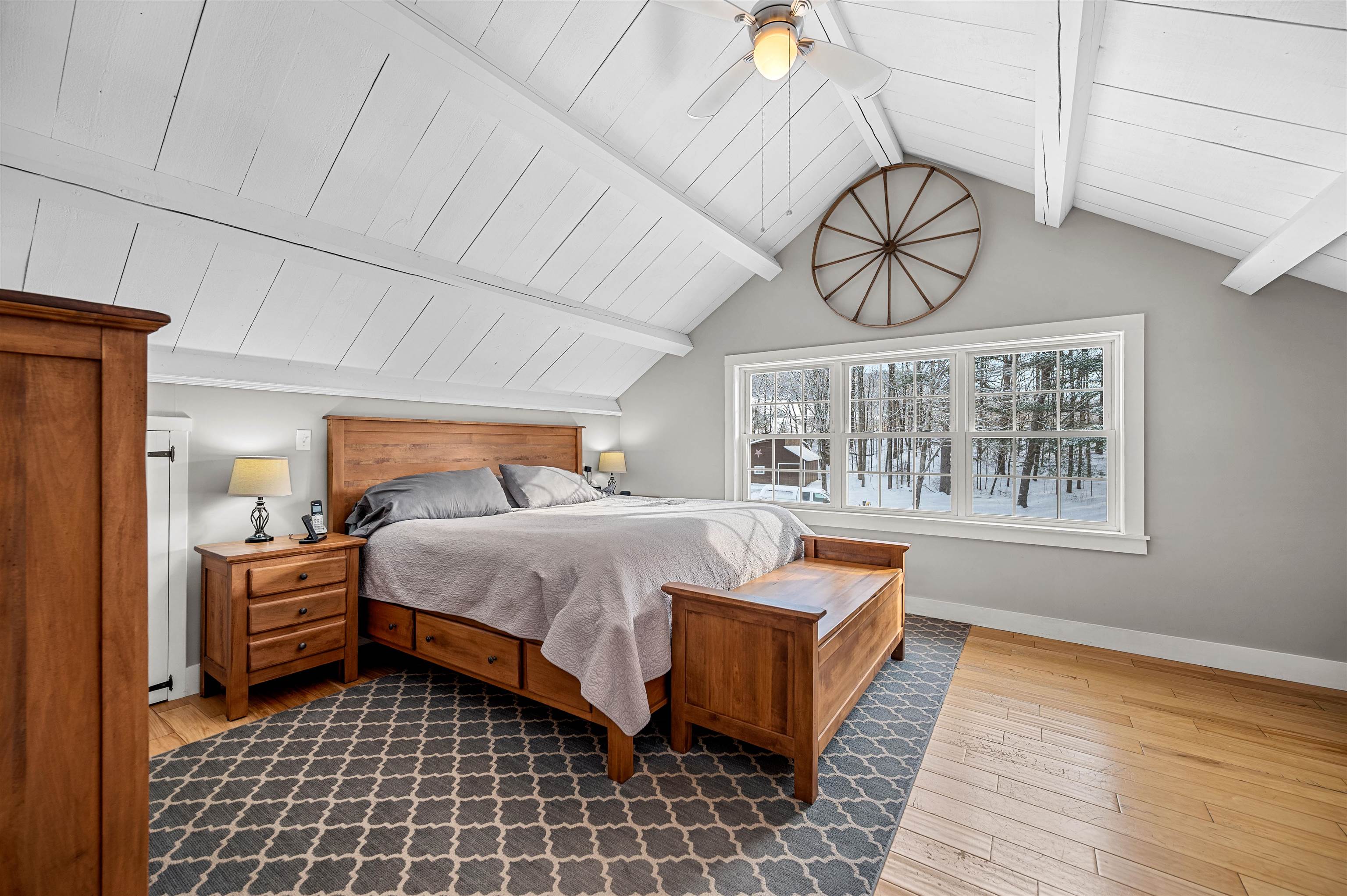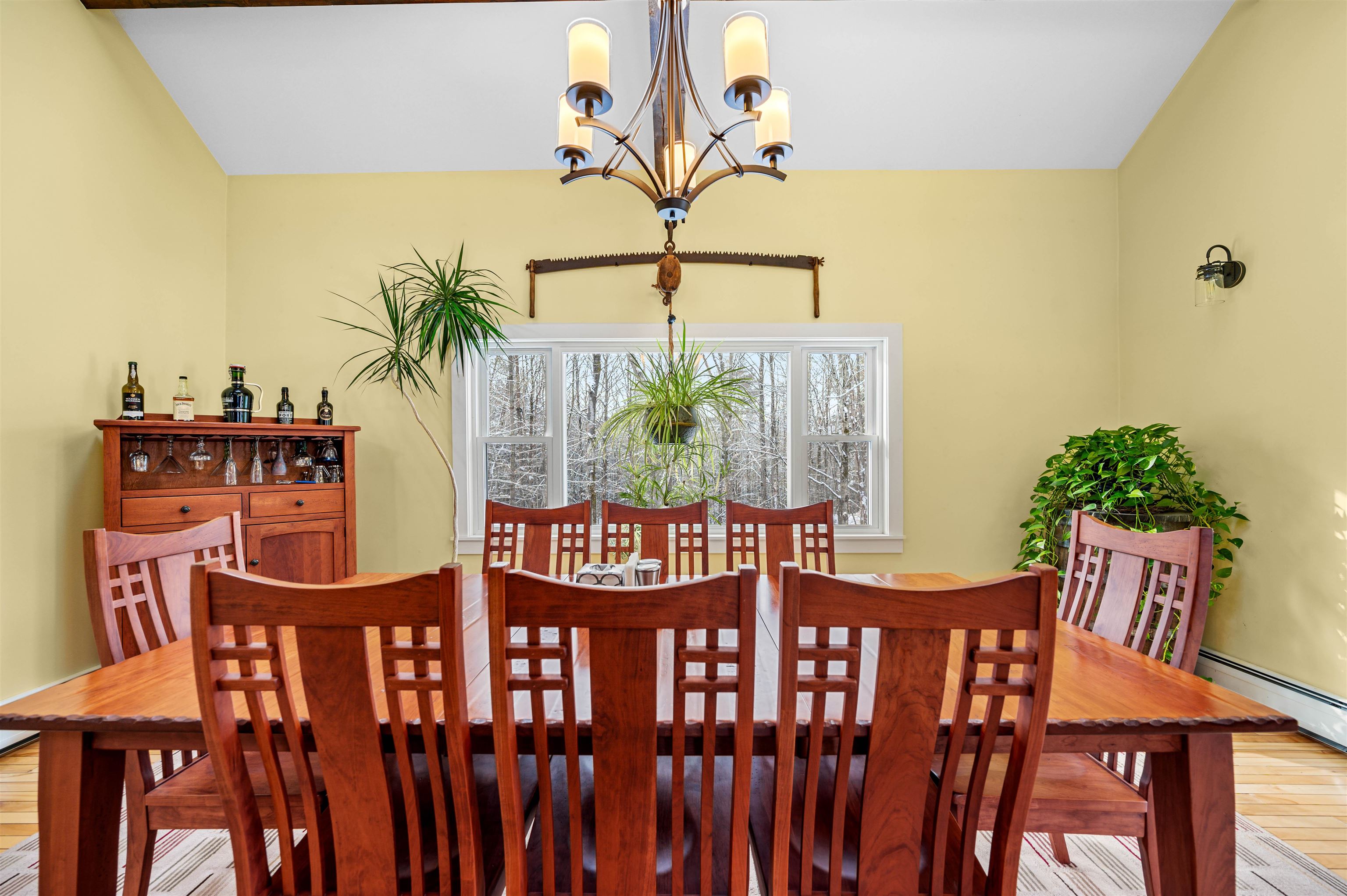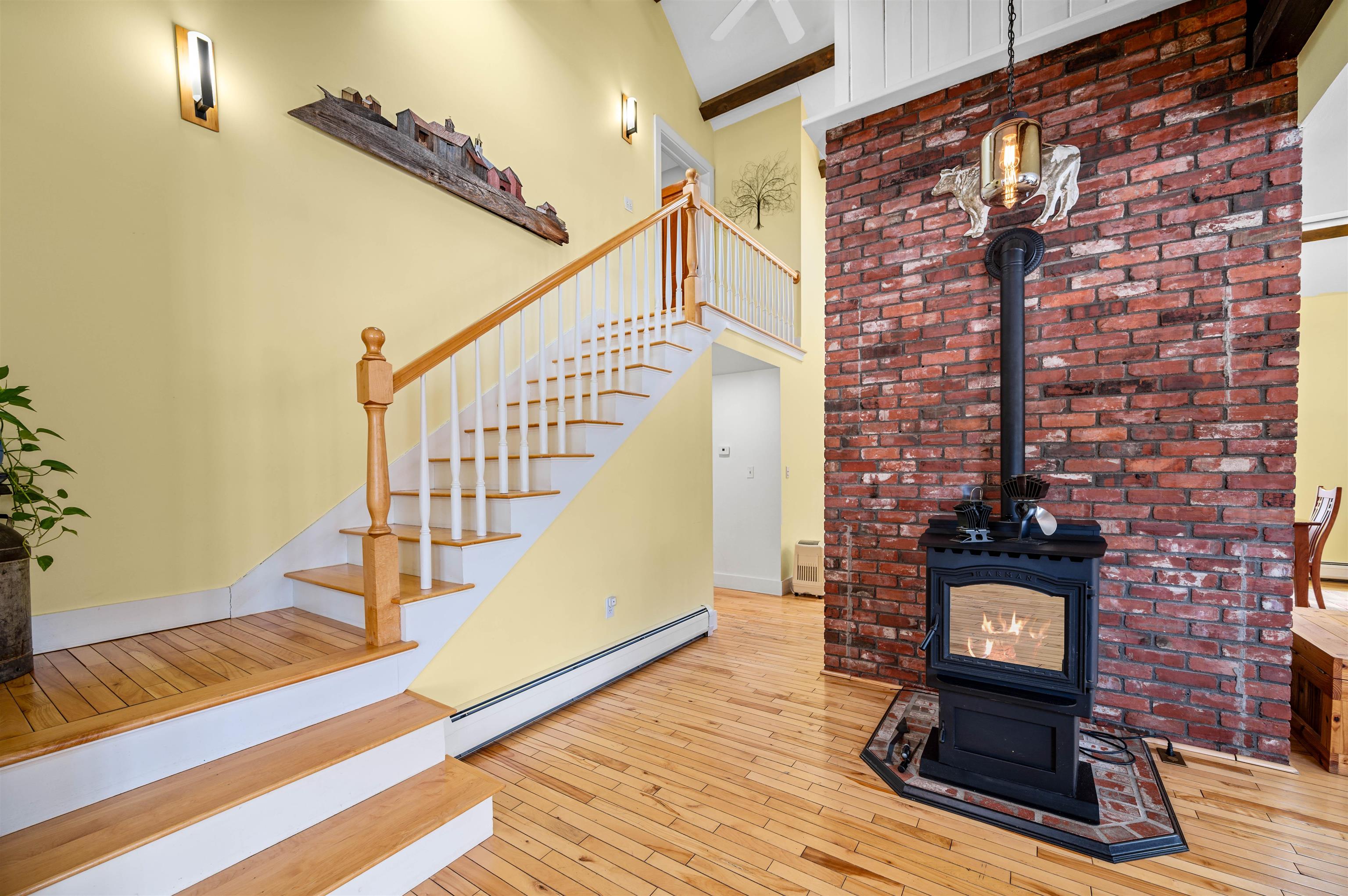 - Cathedral Ceiling, Ceiling Fan, Dining Area, Wood Fireplace, Kitchen Island, Natural Light, Natural Woodwork, Skylight, Basement Laundry