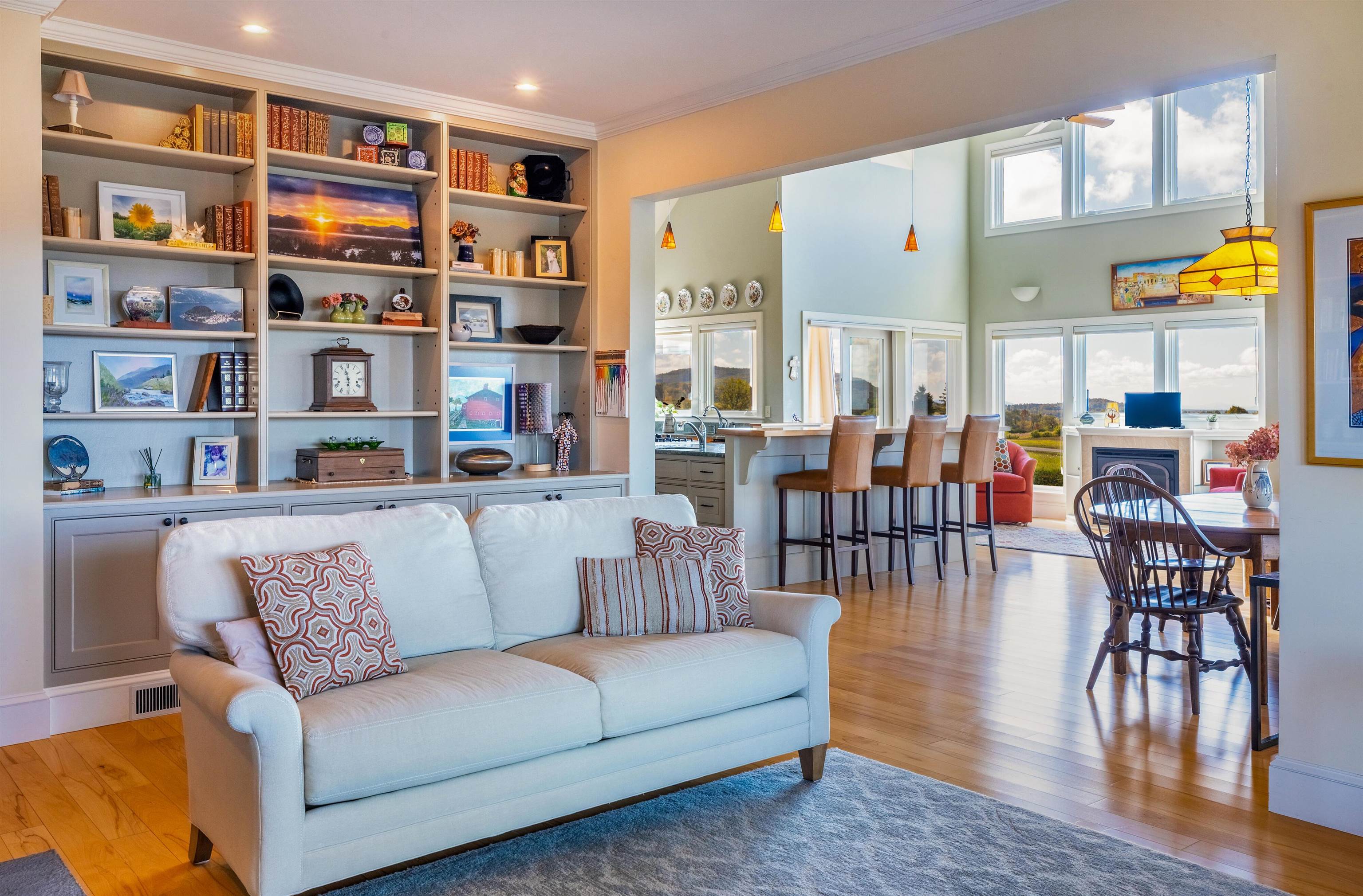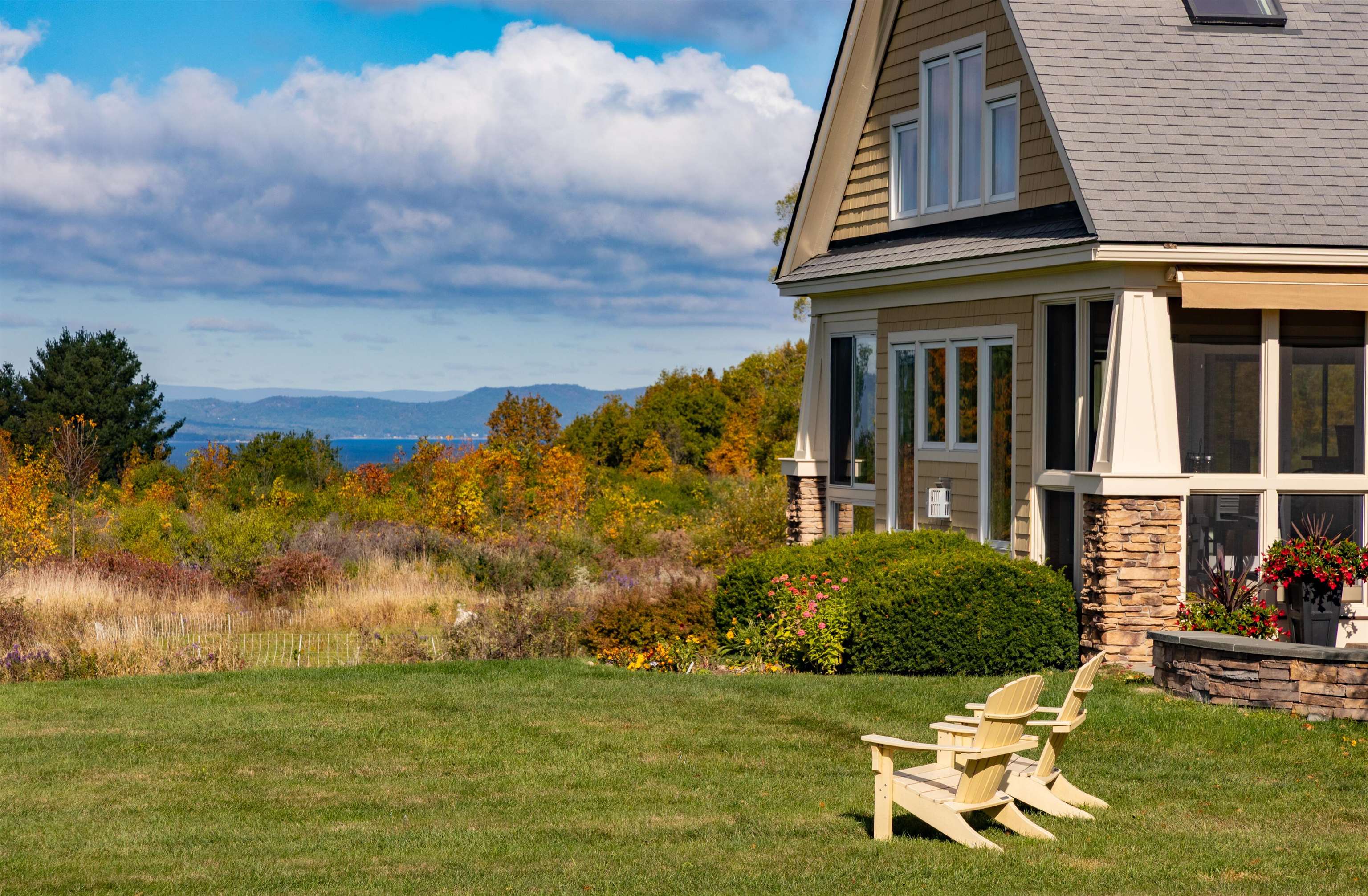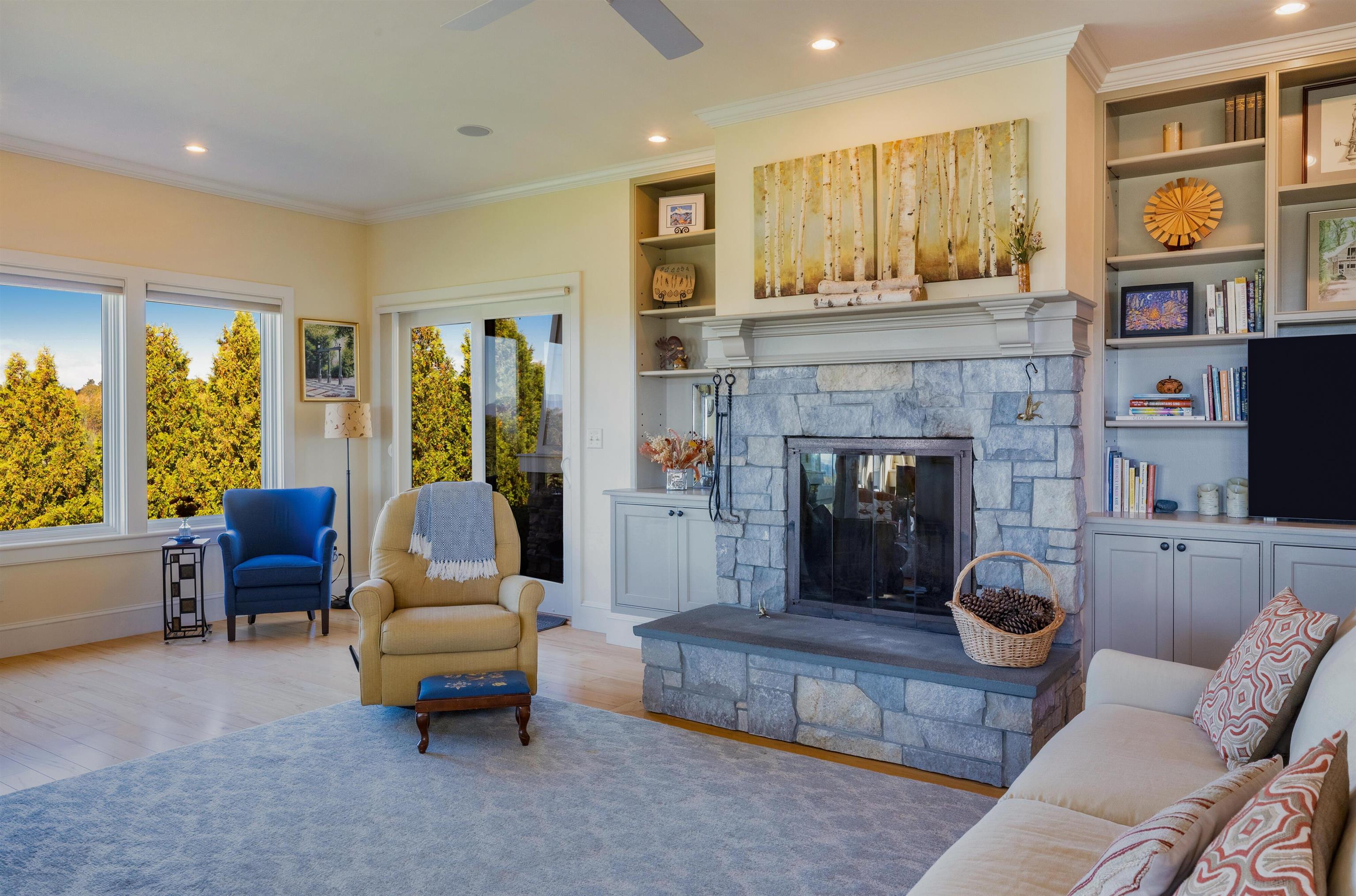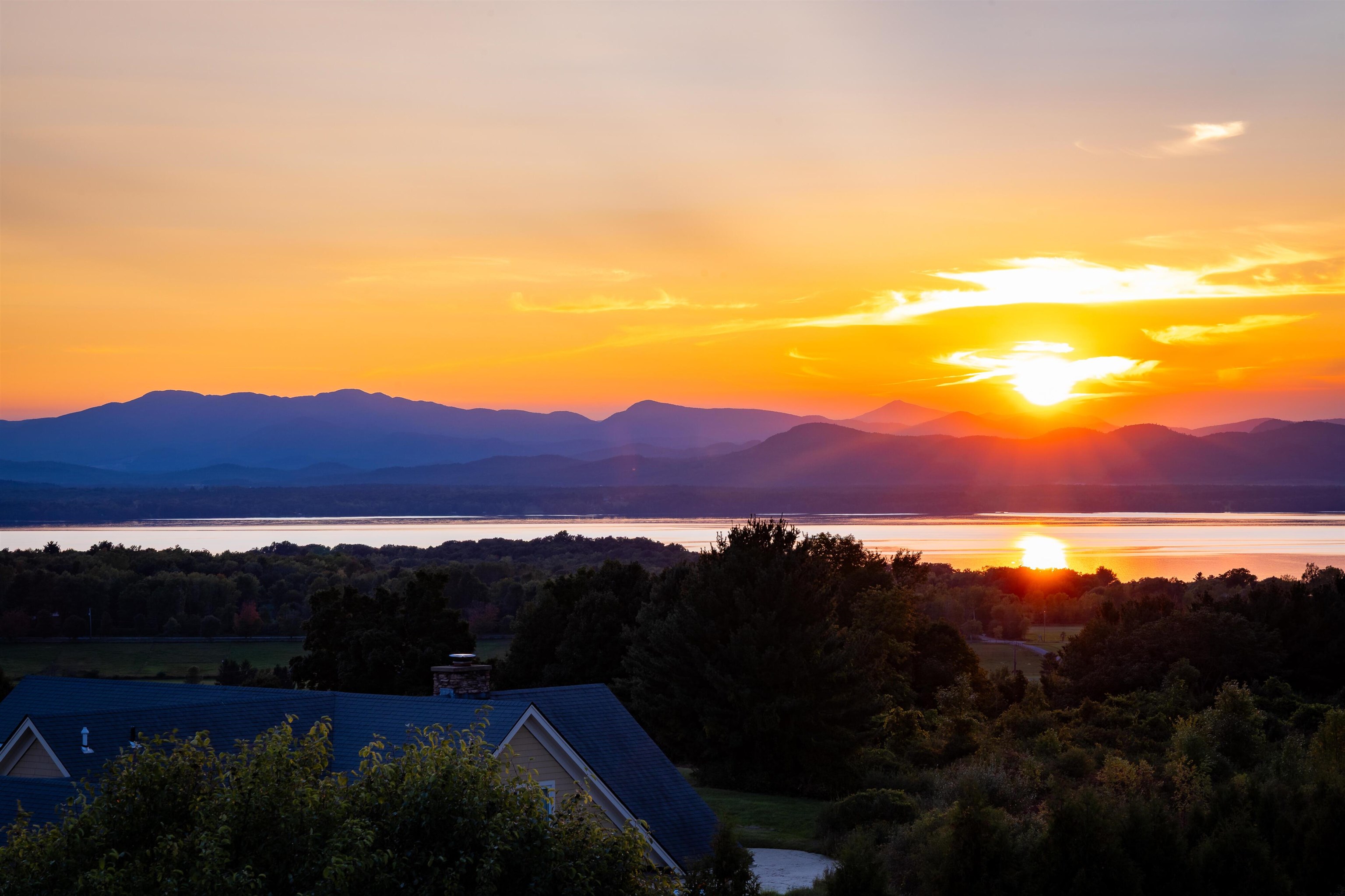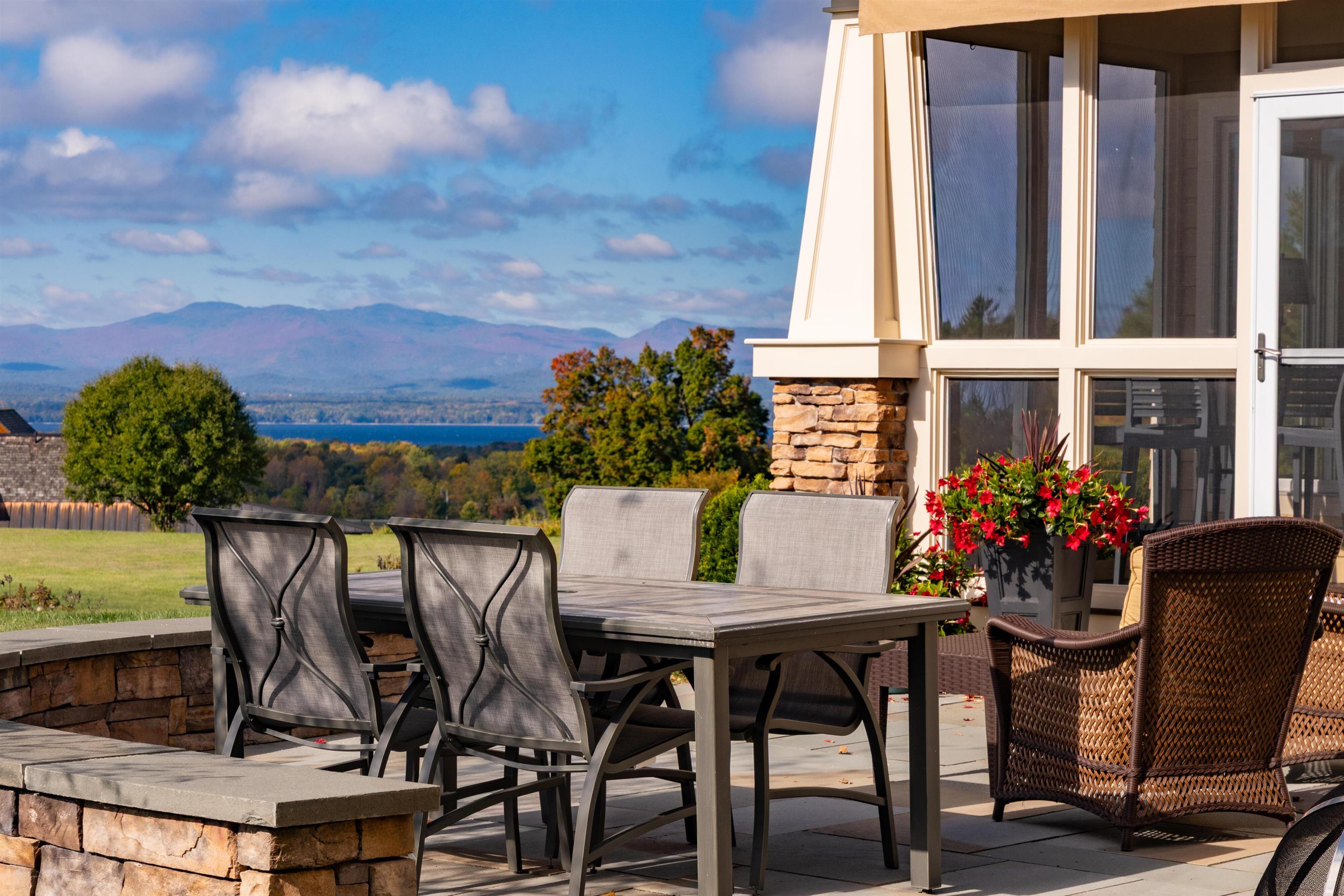Occupying a private end-lot setting on 3.03± acres, this three-bedroom shingle-style home offers expansive views of Lake Champlain and the Adirondack Mountains. Abutting over 50 acres of conserved land with a protected view easement, the setting ensures lasting privacy and openness. Built in 2006, the residence features an open kitchen and living area with expansive windows, a heated sunroom, main-level primary suite and home office, and thoughtfully landscaped grounds with stone walls, and a large bluestone patio oriented toward the lake. Located approximately 25 minutes from Burlington, the property combines exceptional views, privacy, and convenience.