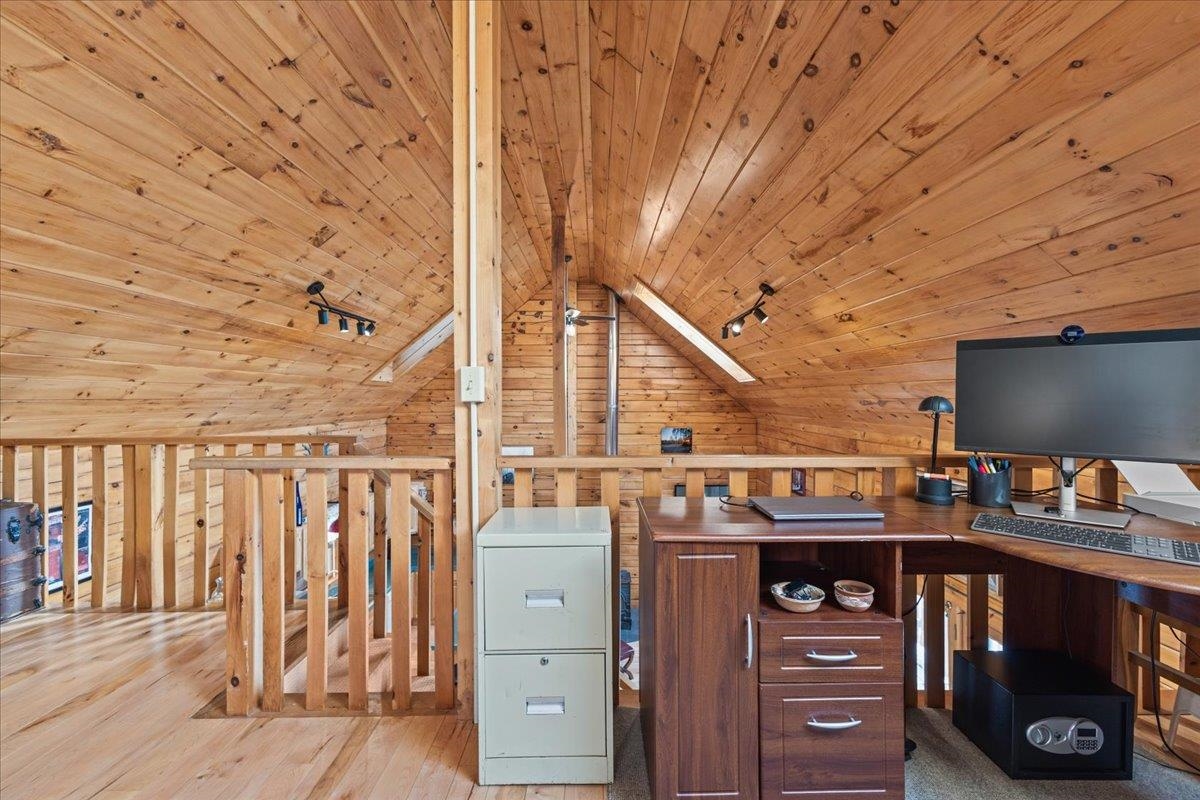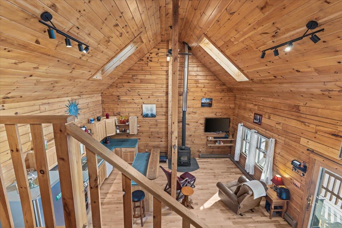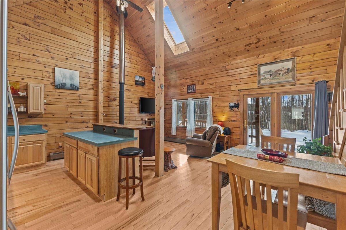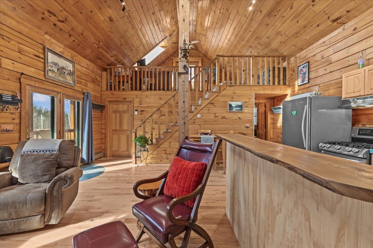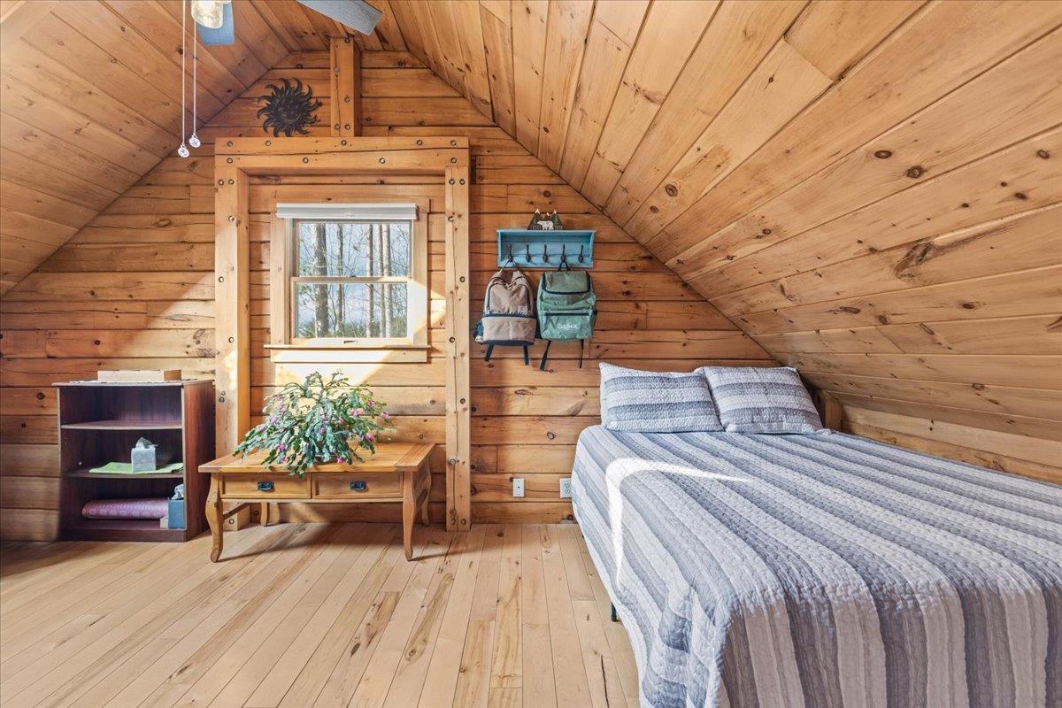 This is the Vermont Life! Situated on 16.9 acres and set 0.2 miles back from a quiet country road. This property offers total privacy with an open yard, deep woods for wildlife viewing, and a classic Southern facing covered porch featuring sunset and seasonal mountain views. Conveniently located, this "slice ofVermont" is within an hour of several ski resorts, hiking trails, and quintessential Vermont towns. It is also just 30 minutes from Montpelier and less than an hour from the Hanover/Lebanon area, with VAST Snowmobile Trail #110 just around the corner, reachable at the back of the property. The open-concept floor plan includes a kitchen, dining, and living area with gorgeous woodwork, dramatic vaulted ceilings, skylights, and a cozy wood stove. The home's current septic system is rated for three bedrooms. Converting the loft into an additional bedroom could be done with minimal effort. The basement features high ceilings, LVP flooring, and outdoor access, making it ideal for storage or future finishing.This solidly built, fully furnished low-maintenance home features a standing seam roof, propane heat, a wood stove, high-quality insulation, fiber internet and is wired for a backup generator. Whether you are looking for a full-time residence or a vacation getaway with Airbnb potential, this is a unique large land opportunity.