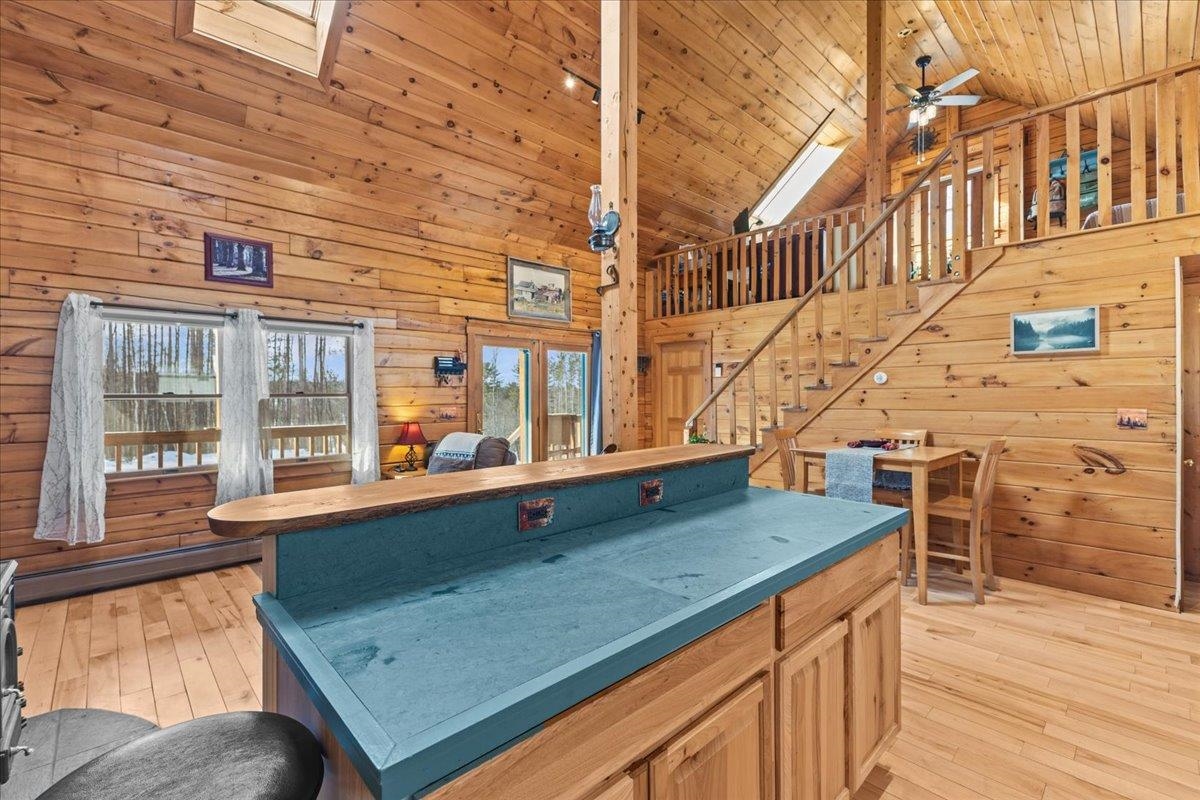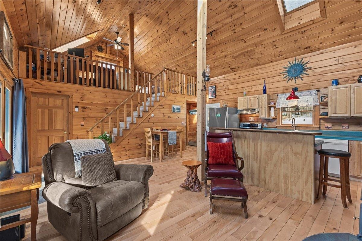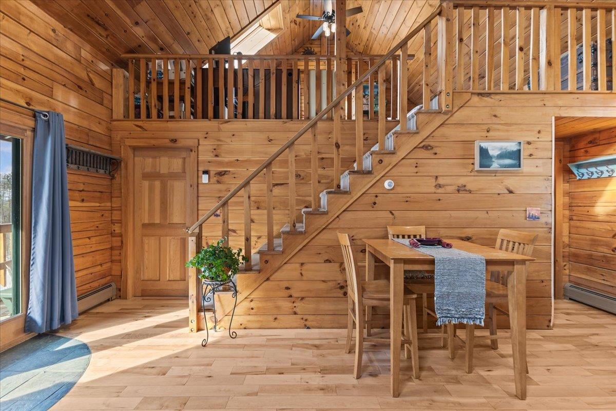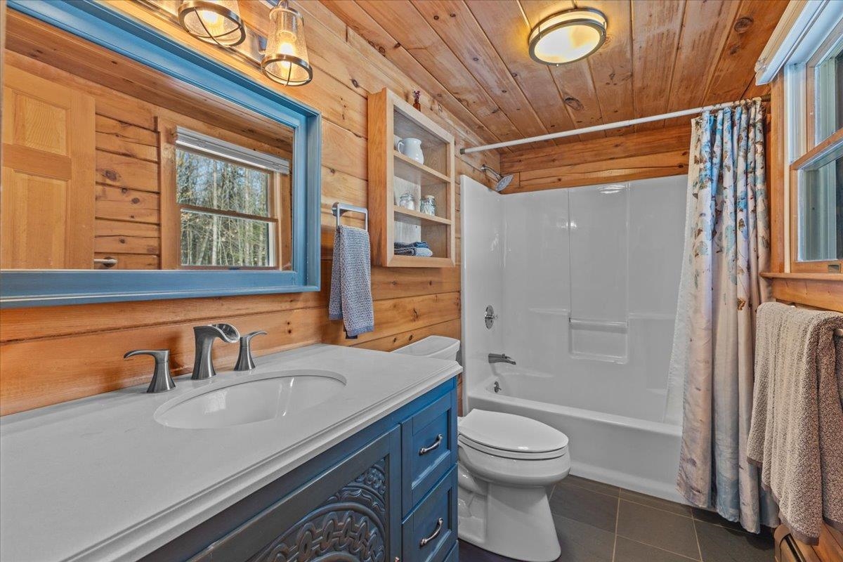 This is the Vermont Life! Situated on 16.9 acres and set 0.2 miles back from a quiet country road. This property offers total privacy with an open yard, deep woods for wildlife viewing, and a classic Southern facing covered porch featuring sunset and seasonal mountain views. Conveniently located, this "slice ofVermont" is within an hour of several ski resorts, hiking trails, and quintessential Vermont towns. It is also just 30 minutes from Montpelier and less than an hour from the Hanover/Lebanon area, with VAST Snowmobile Trail #110 just around the corner, reachable at the back of the property. The open-concept floor plan includes a kitchen, dining, and living area with gorgeous woodwork, dramatic vaulted ceilings, skylights, and a cozy wood stove. The home's current septic system is rated for three bedrooms. Converting the loft into an additional bedroom could be done with minimal effort. The basement features high ceilings, LVP flooring, and outdoor access, making it ideal for storage or future finishing.This solidly built, fully furnished low-maintenance home features a standing seam roof, propane heat, a wood stove, high-quality insulation, fiber internet and is wired for a backup generator. Whether you are looking for a full-time residence or a vacation getaway with Airbnb potential, this is a unique large land opportunity.