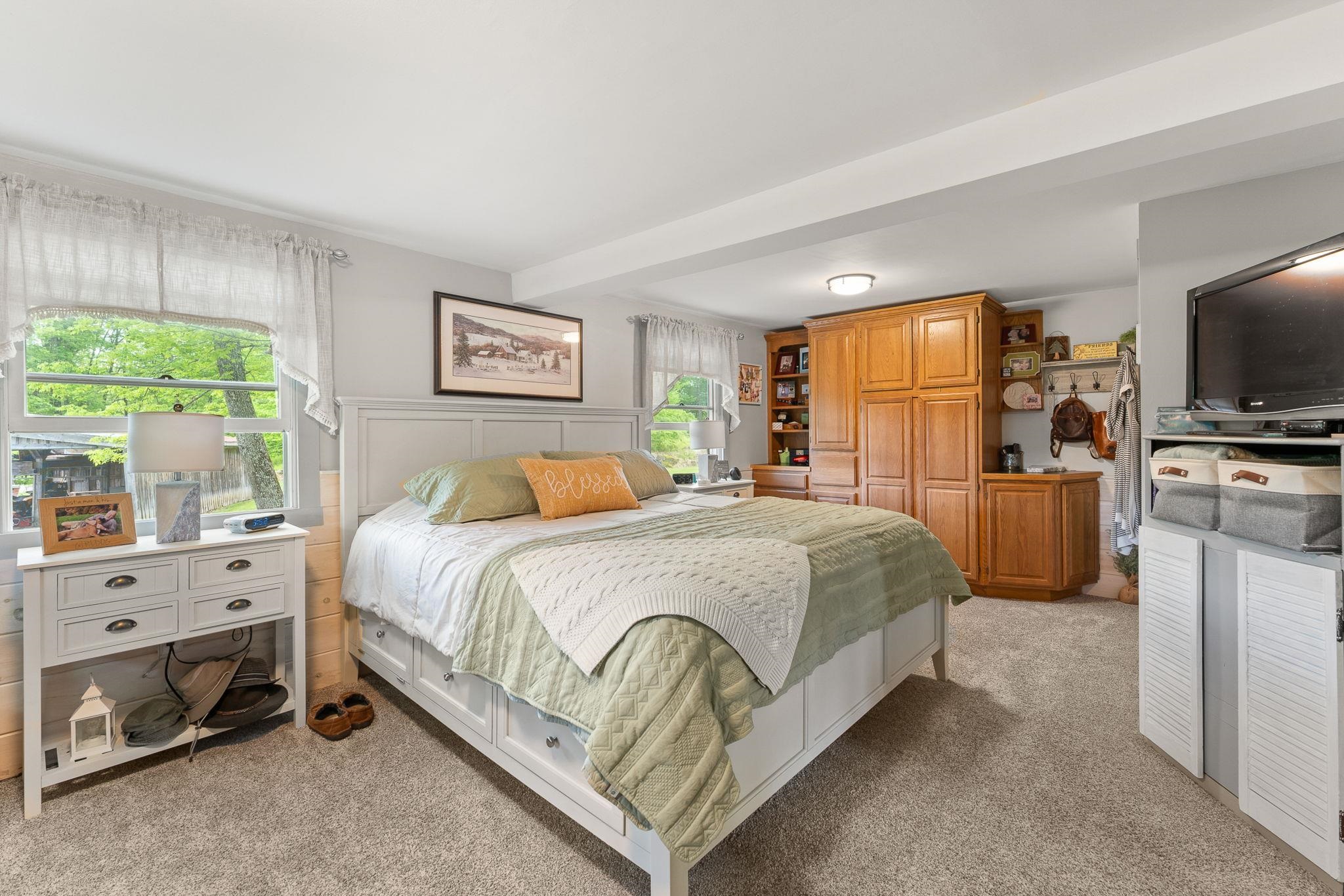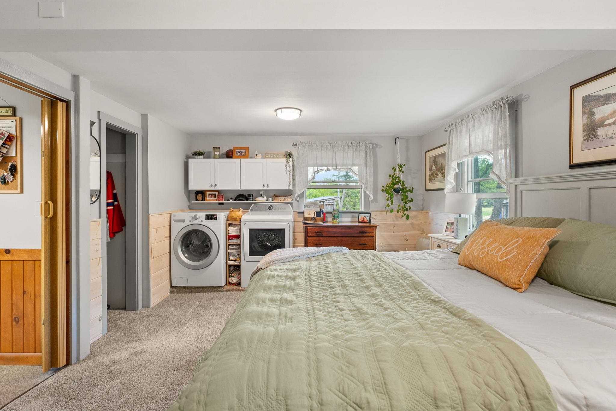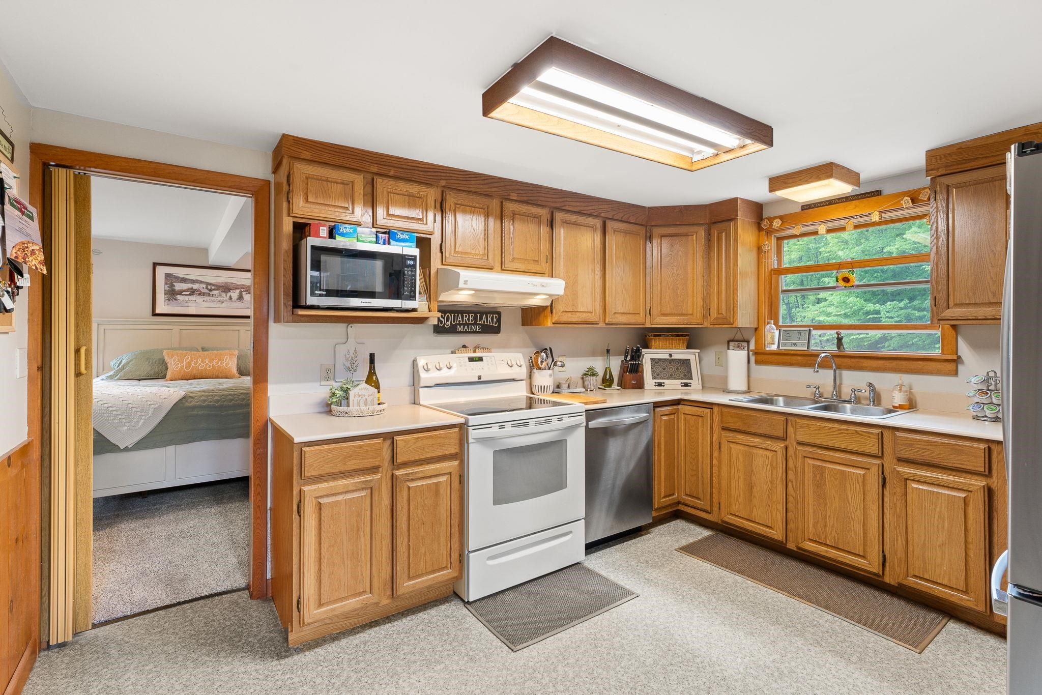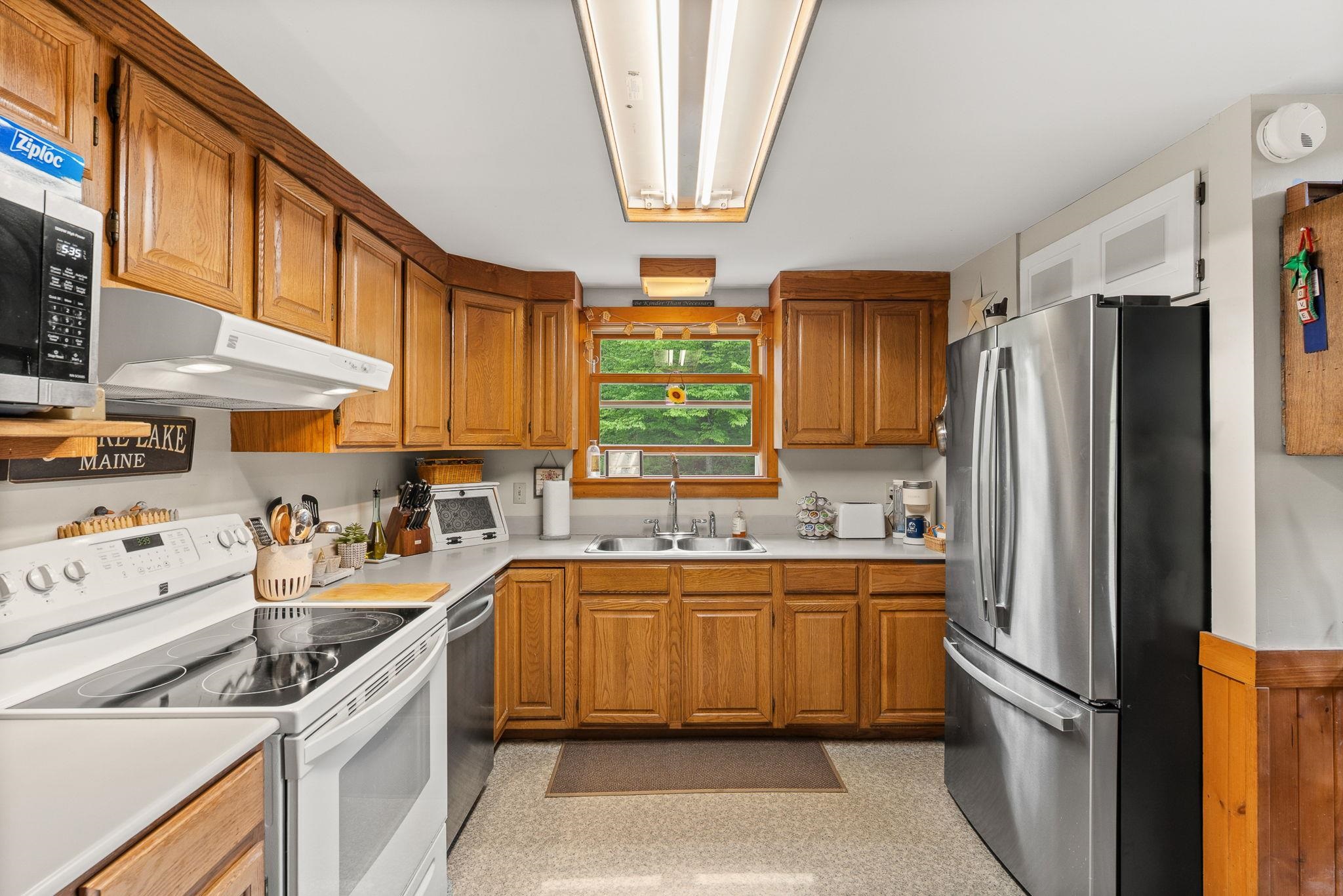 - Blinds, Cathedral Ceiling, Ceiling Fan, Kitchen/Dining, Natural Light, Natural Woodwork, Vaulted Ceiling, 1st Floor Laundry