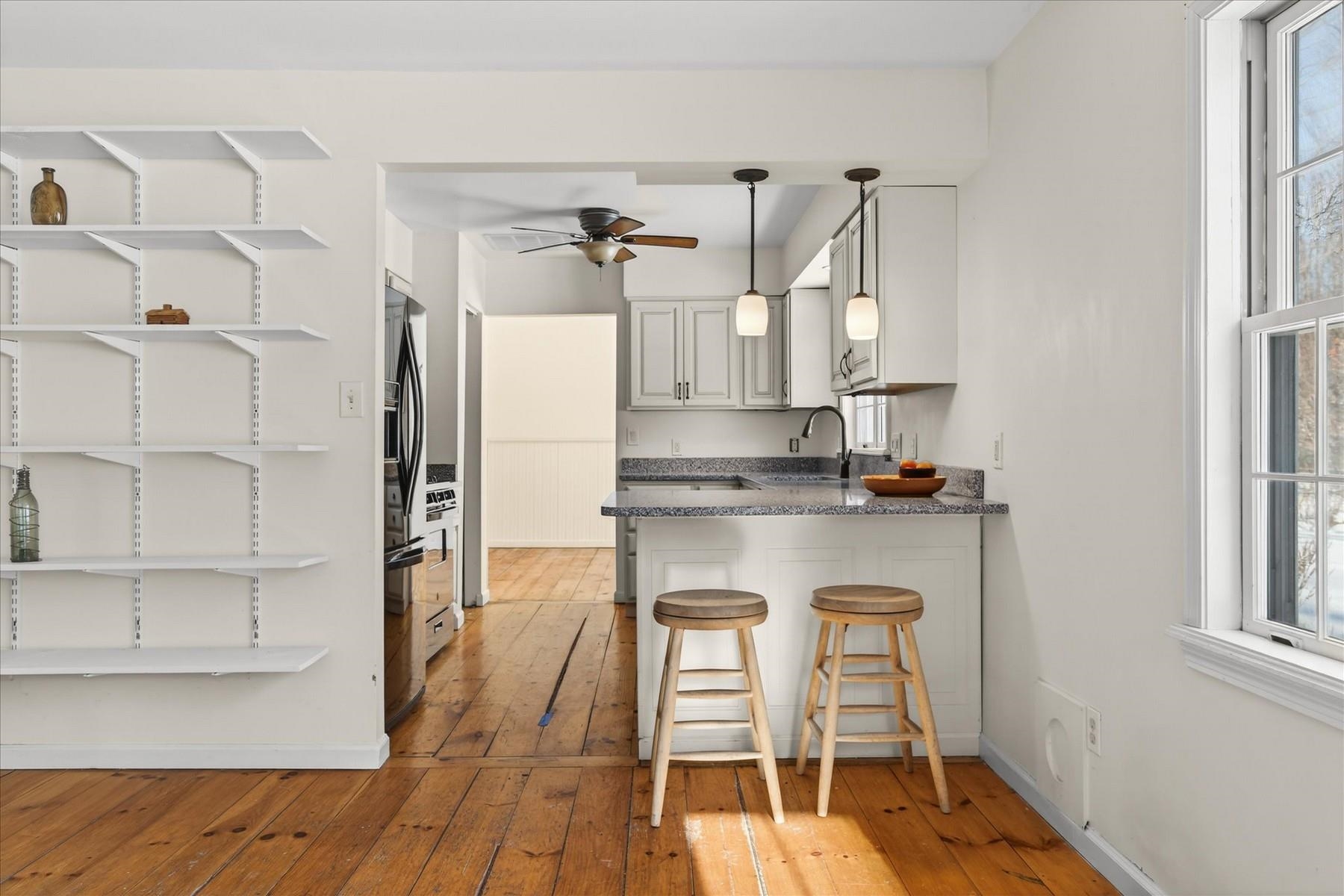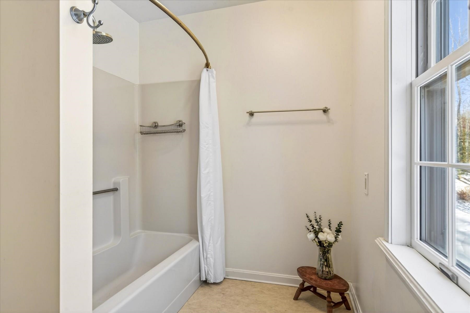 Discerning buyers will appreciate this thoughtfully upgraded, energy efficient home that blends comfort, style, and long term value. The solar energy system is complimented by multiple heating options including a heat pump hot water heater, forced hot air, wood stove insert, for year round efficiency. The kitchen features Silestone countertops and opens to the inviting living room, anchored by a large hearth with a modern wood stove insert. The first floor includes a private primary suite, cozy reading nook, and half bath, while upstairs offers Three spacious bedrooms, a central landing, and a full bath. Elegant touches include the Hubbardton Forge Corona Smoke Chandelier, with matching wall sconce, and the modern floating mantel. The full basement provides laundry, storage, and utility space, ensuring functionality without sacrificing style. Step outside to enjoy a serene setting from the back deck with a hot tub and charming front porch, perfect for relaxing, entertaining, or observing the abundant wildlife. This home offers a rare combination of modern upgrades, inviting interiors, and tranquil outdoor living.