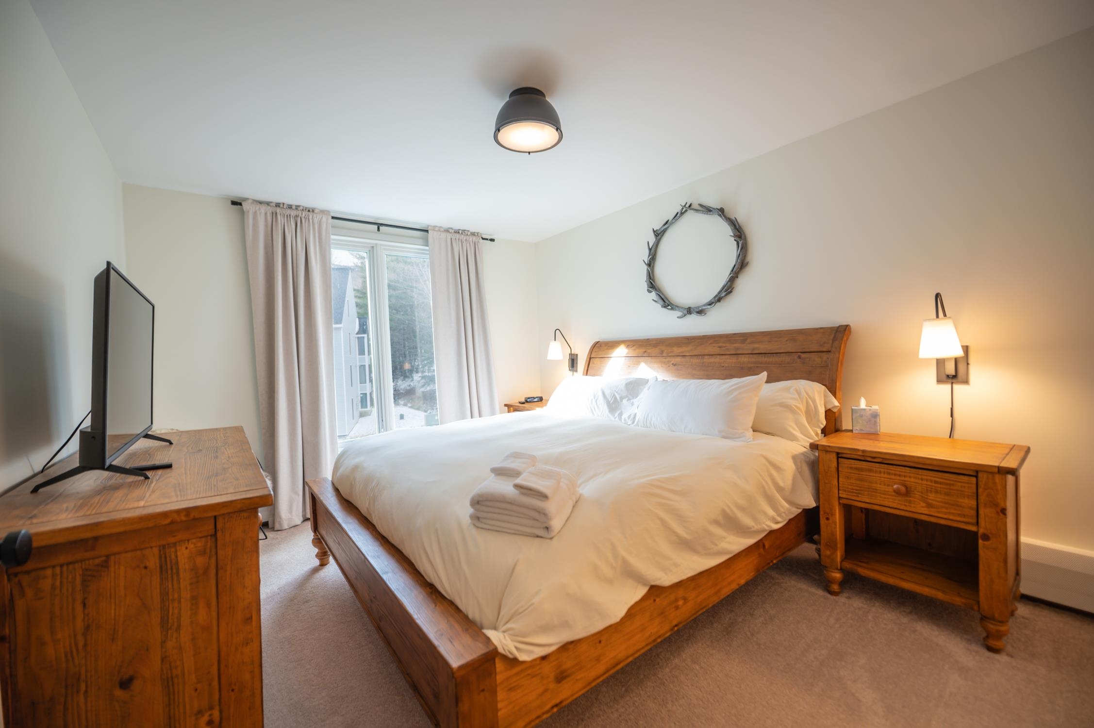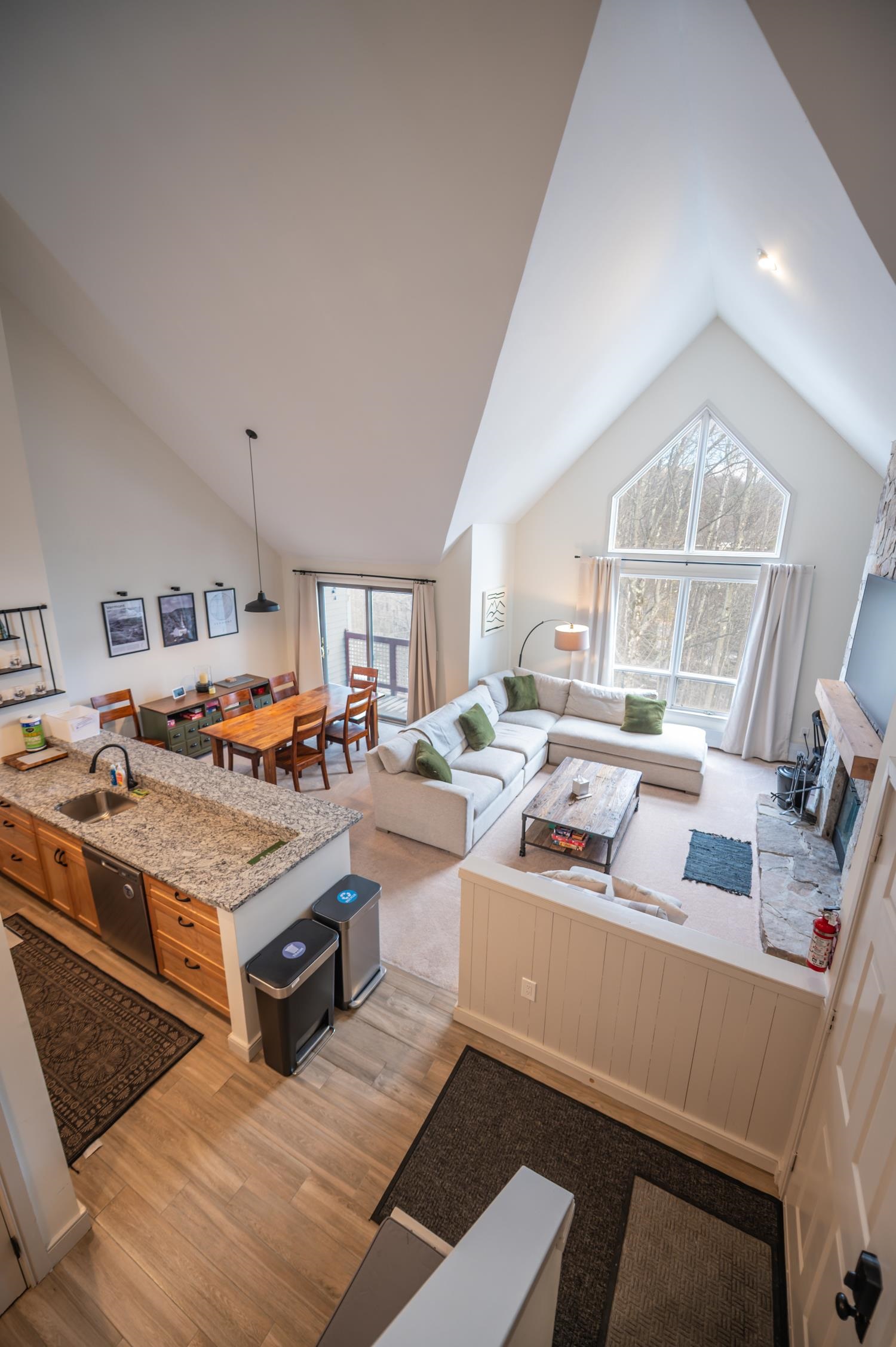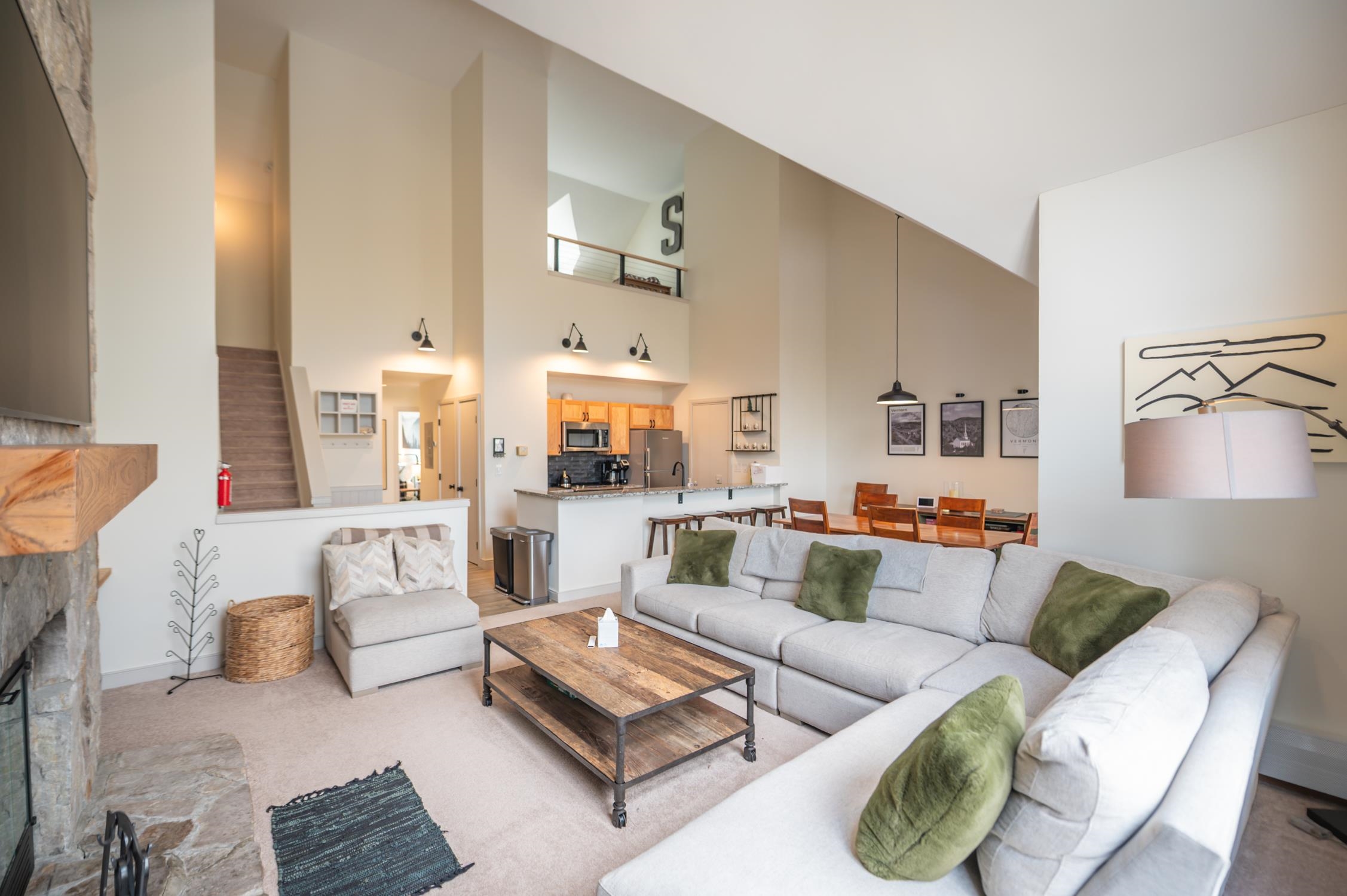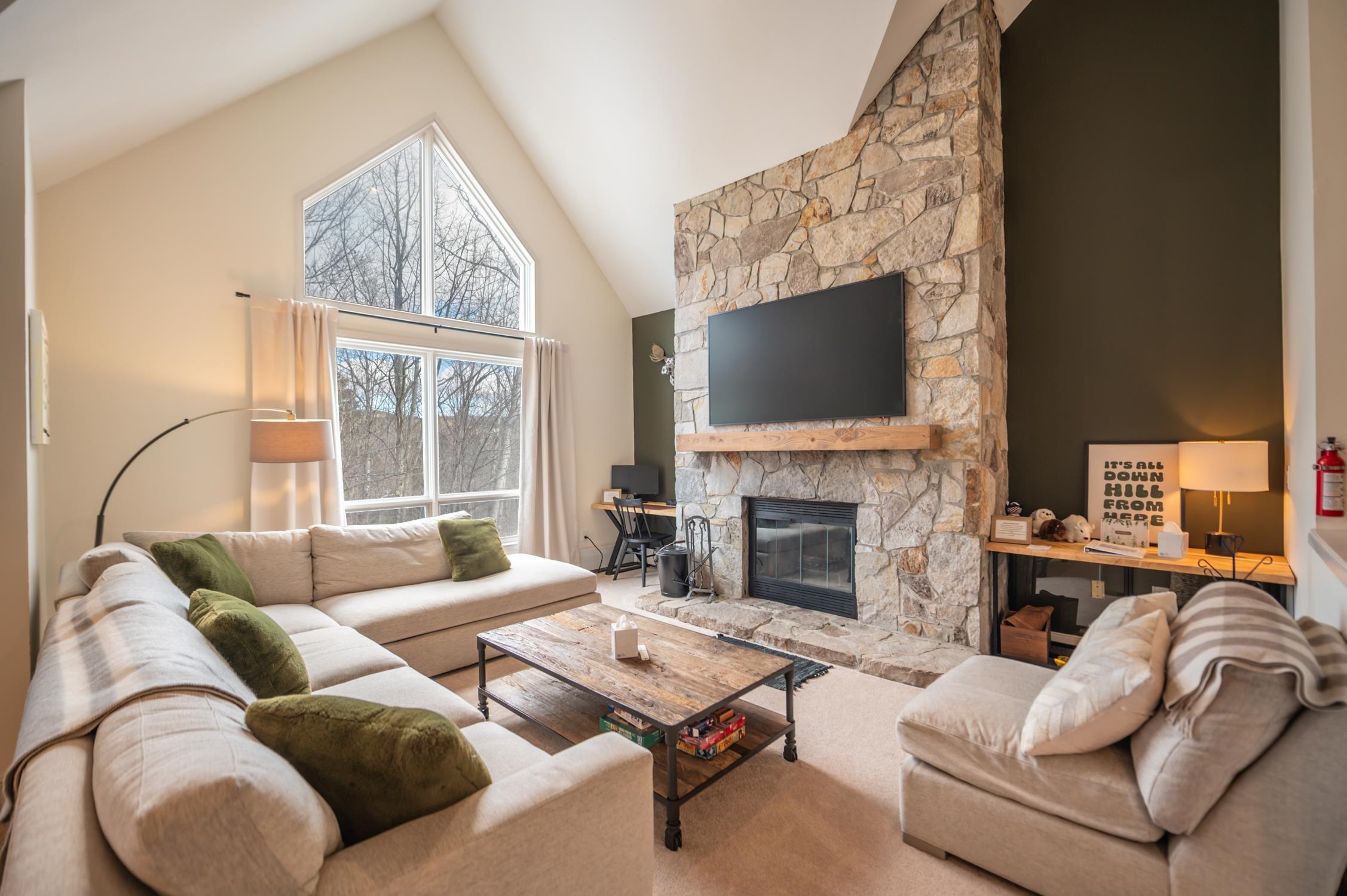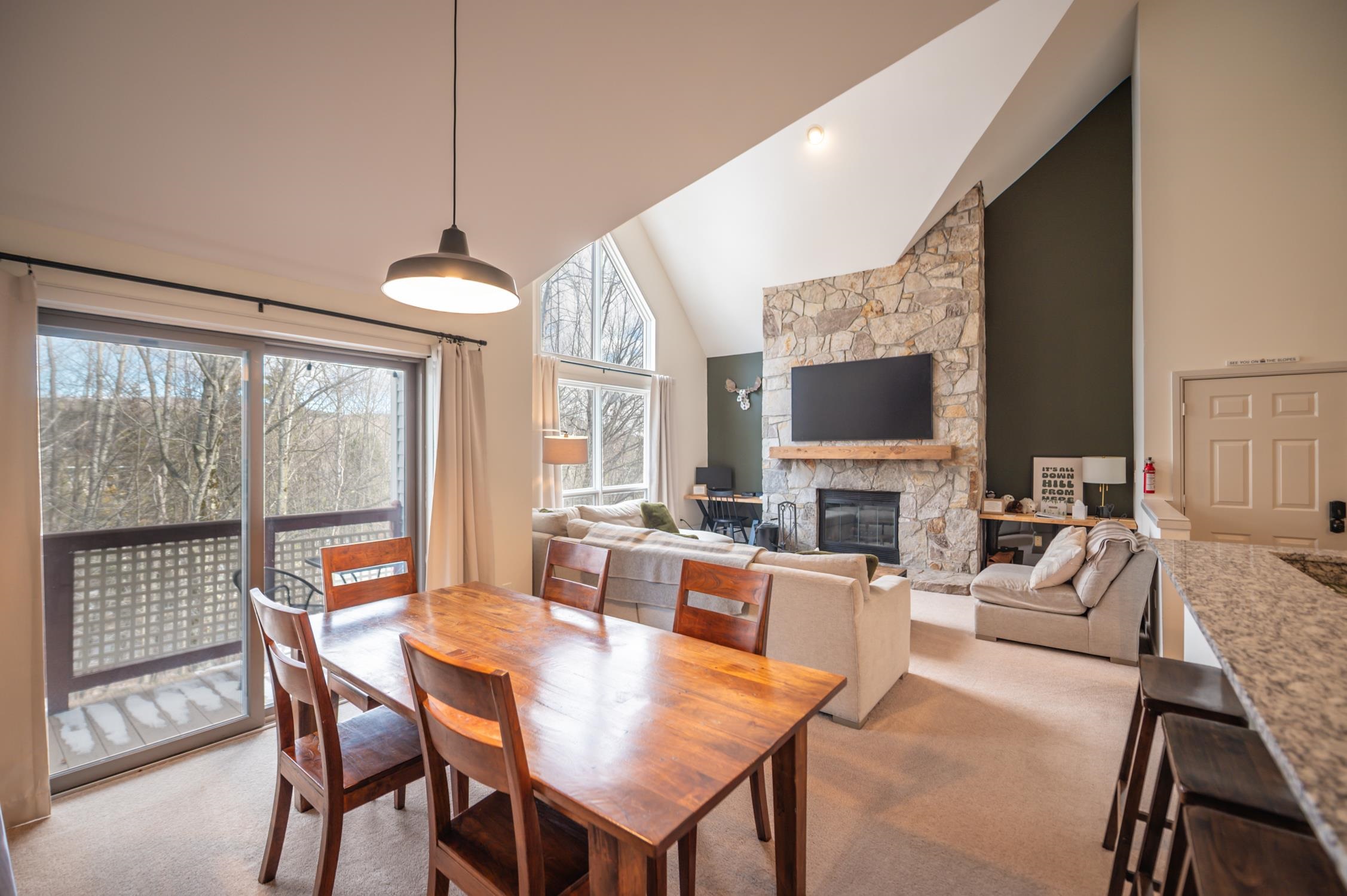 One-of-a-kind opportunity to own true trailside at Mount Snow. This lofted three-bedroom, three-bath residence is among the closest buildings at Seasons to the newly renovated amenities center — allowing you to walk to the pools, gym, and hot tubs without ever moving your car on rest days. Enjoy a large vaulted living space anchored by a dramatic floor-to-ceiling stone wood-burning fireplace. The open layout includes a remodeled kitchen with new cabinetry, breakfast bar, granite counters, and stainless appliances, plus excellent natural light and direct ski trail access. A convenient entry mudroom with cubbies keeps gear organized, and each unit includes a ground-floor ski locker. Positioned at the top of the building, this unit has no residences above — minimizing noise and enhancing privacy. All three bedrooms are vaulted suites, offering excellent separation and comfort for guests. Additional features include in-unit laundry and a private deck to take in the Vermont scenery. Recent upgrades include a brand-new heating system for improved efficiency and reliable hot showers after a day on the slopes, fresh paint throughout, updated lighting, new mounted TV, renovated baths, and all new furnishings — offered fully turnkey. No matter the weather, you’ll enjoy effortless access on and off the mountain as well as to the clubhouse. The recently updated amenities building features indoor and outdoor pools, a full gym, separate owner and renter hot tub areas, locker rooms, basketball court, wood and trash service, and on-site management — allowing for downtime, not upkeep.