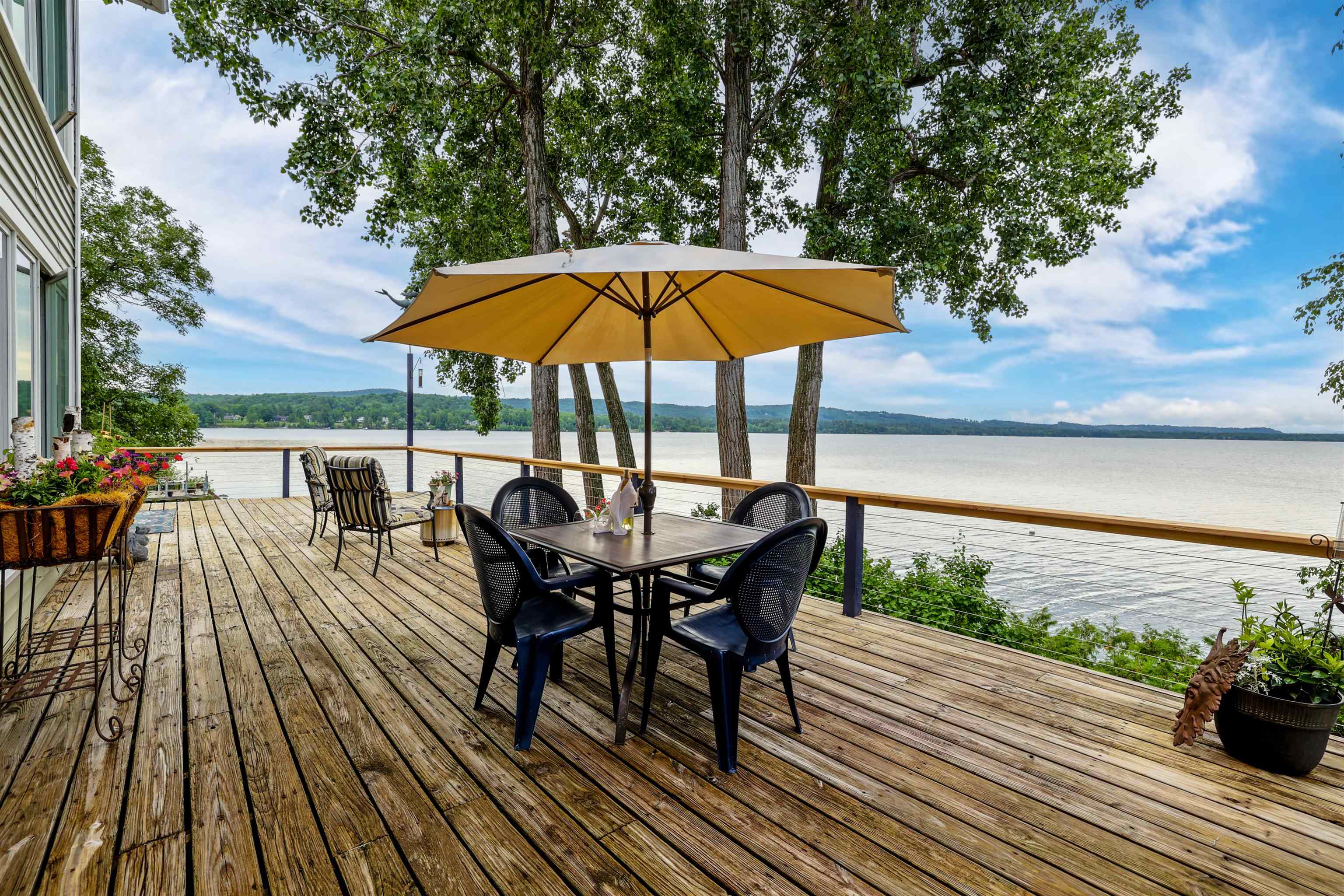 Welcome to 130 Lands End Road—an exceptional lakefront retreat on the shores of Lake Memphremagog, an international body of water. This renovated 6-bedroom colonial sits on 1.2 acres with 295 feet of direct frontage, complete with a grandfathered concrete dock, small sandy beach, and mooring. The heart of the home is the expansive lakeside great room, where open living and dining areas are wrapped in walls of glass capturing uninterrupted lake and mountain views. Sliding doors lead directly to a massive south-facing deck with stainless-steel railing—ideal for relaxing, dining, and entertaining against a spectacular backdrop. Three second-floor bedrooms share the same commanding vistas, complemented by a bunk room, another large bedroom, and two updated baths. An attic provides flexible overflow space or an excellent home-office option. At list price, the home is offered mostly furnished for an easy transition. A separate 2-bedroom guest suite—connected yet private—includes its own living room, full bath, and deck. It is perfectly suited for multi-generational living, hosting guests, or generating supplemental income through short-term rentals. The grounds feature perennial gardens, a beach area, and prime water access. Storage and parking are abundant with an attached heated 3-bay garage plus a detached 2-car. Recreation is unmatched: the property borders the Eagle Point Wildlife Management Area and is steps from the recreational path and Memphremagog Trails for biking, hiking, and Nordic activities. Jay Peak and Burke Mountain are each within 45 minutes. A rare offering on one of Vermont’s finest lakes—privacy, views, and unmatched waterfront living. If you like what you see, be sure to check out the 3D tour.