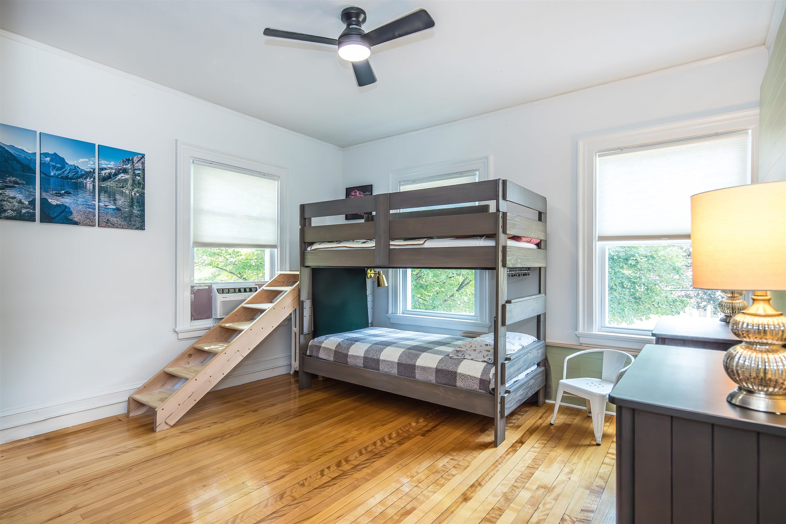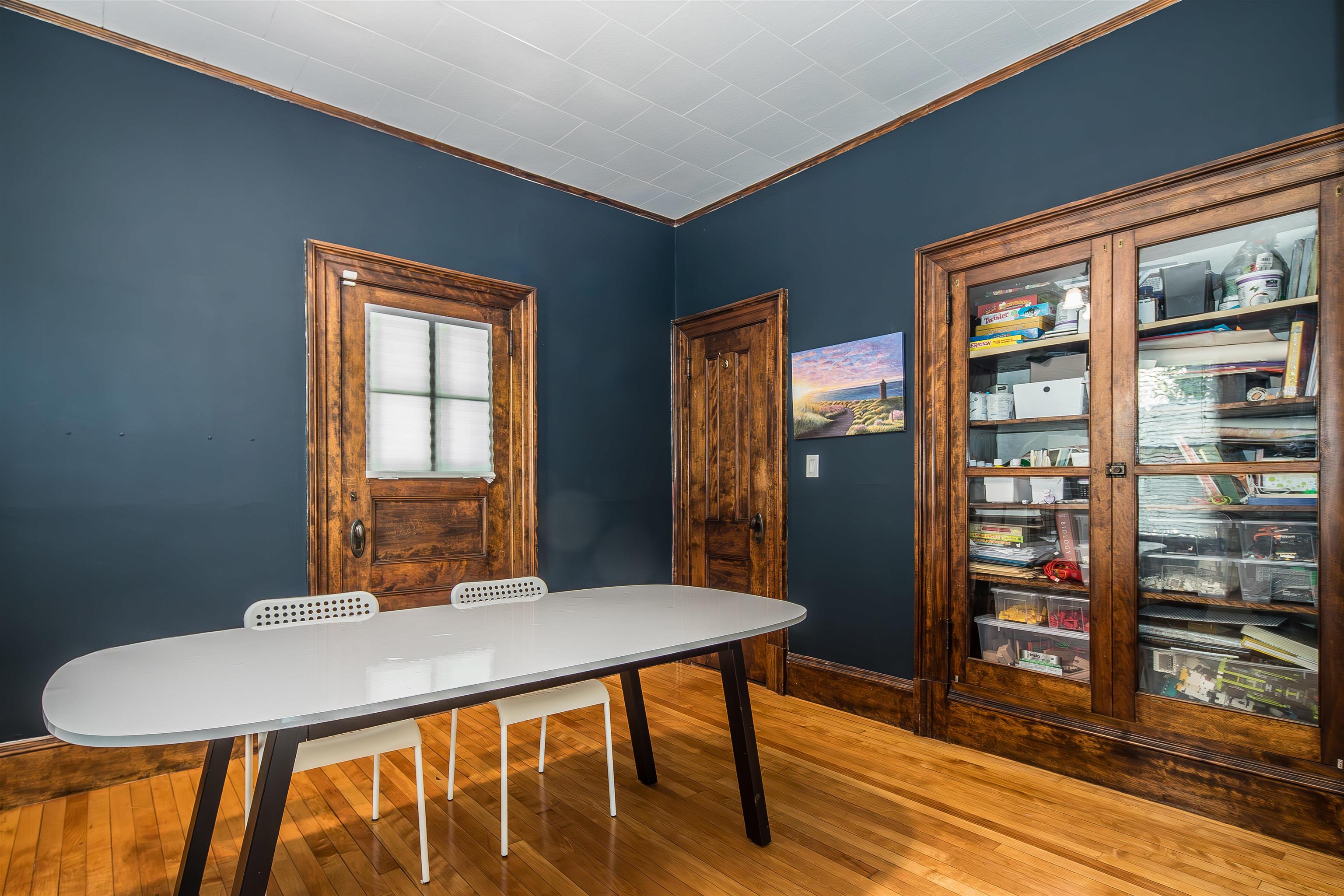 - Blinds, Ceiling Fan, Dining Area, 1 Fireplace, Natural Light, Natural Woodwork, Walkup Attic