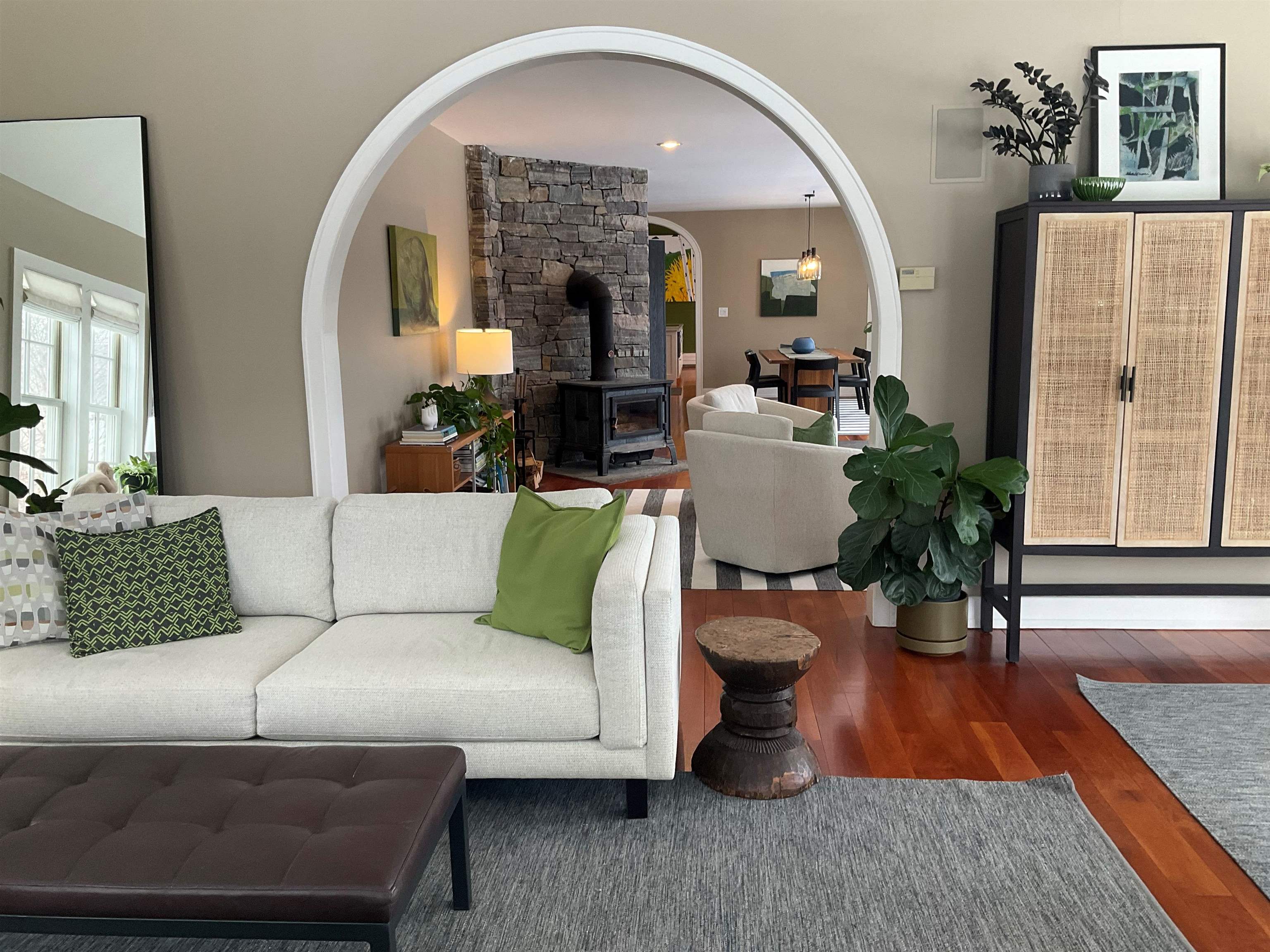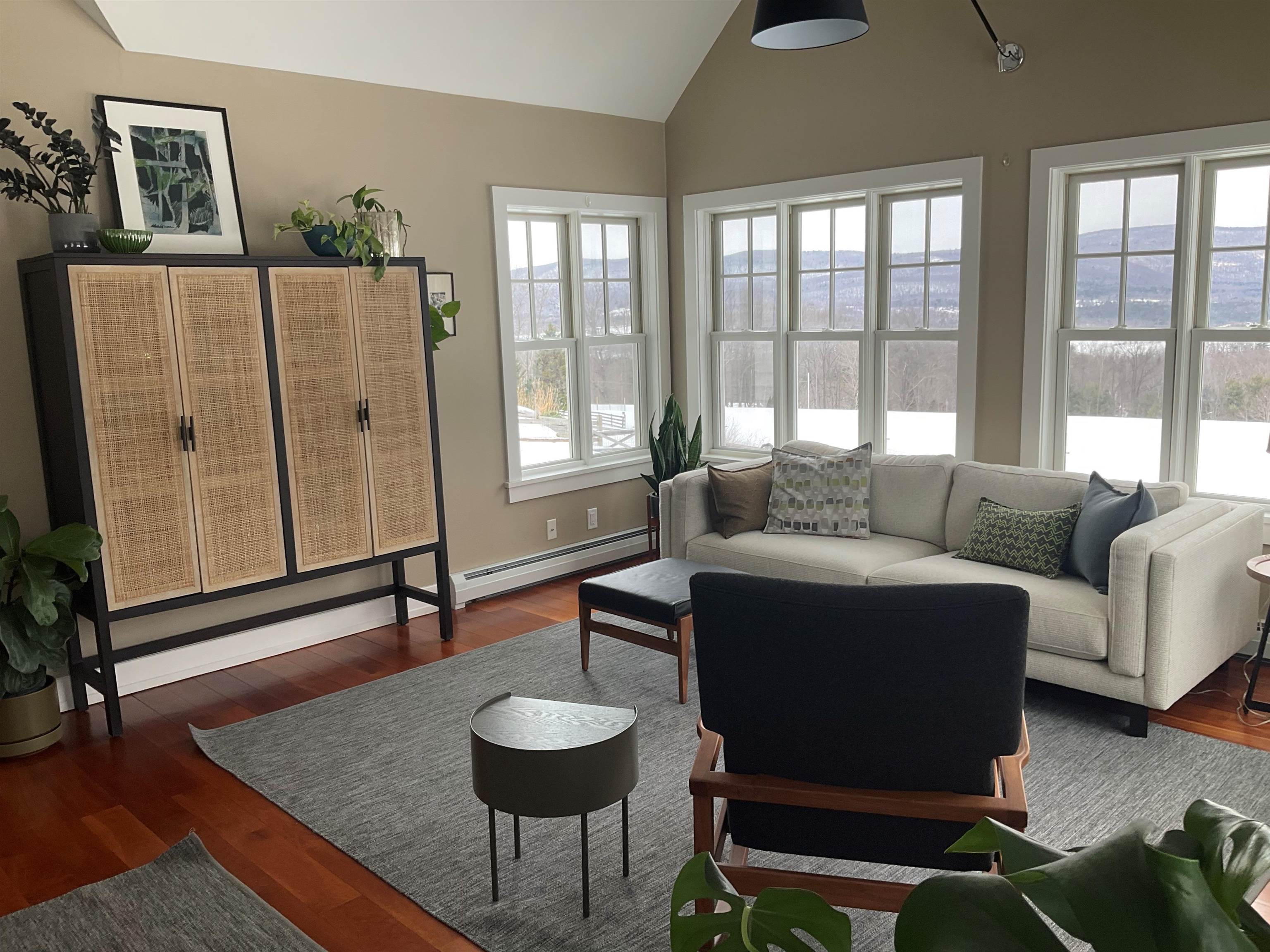Experience the quintessential Vermont lifestyle in this masterfully renovated (2021) contemporary farmhouse, offering 6, 100 sq. ft. of finished living space. Tucked at the end of a breathtaking maple-lined driveway, this 17± acre property offers panoramic mountain views and a private sanctuary for hiking, cross-country skiing, snowshoeing, and snowmobiling right from your door. The heart of the home features beautiful cherry flooring and a chef’s kitchen with premium appliances and quartz countertops, flowing seamlessly into a spacious dining area with an intimate sitting room anchored by a soapstone stove. Beyond, a window-lined living room with vaulted wood-beamed ceilings and custom built-ins serves as a perfect hub for media, games, or relaxation. The top floor is designed for both luxury and versatility, featuring a primary suite retreat with a private fireplace and a modern en suite bath showcasing those incredible mountain views. A window-lined hallway with recessed laundry leads to a flexible secondary living wing with two additional vaulted ceiling bedrooms and two full bathrooms—perfectly suited for guests or an au pair suite with its own separate entries. The expansive lower level is built for indoor-outdoor living, featuring a massive stone fireplace, family room, exercise area, game room, and two private bedrooms. Large glass doors provide a seamless walk-out to the patio, where you’ll find a heated inground swimming pool and a custom fire pit. Automotive and outdoor enthusiasts will appreciate the three separate garages accommodating several cars plus a spacious workshop, including one bay designed specifically for a boat or oversized vehicle. A solar array on the garage roof works with backup batteries to keep electric costs below $400 annually. Located with easy access to Stratton and Mount Snow, and a straightforward drive from New York or Boston, this estate is the ultimate four-season destination.