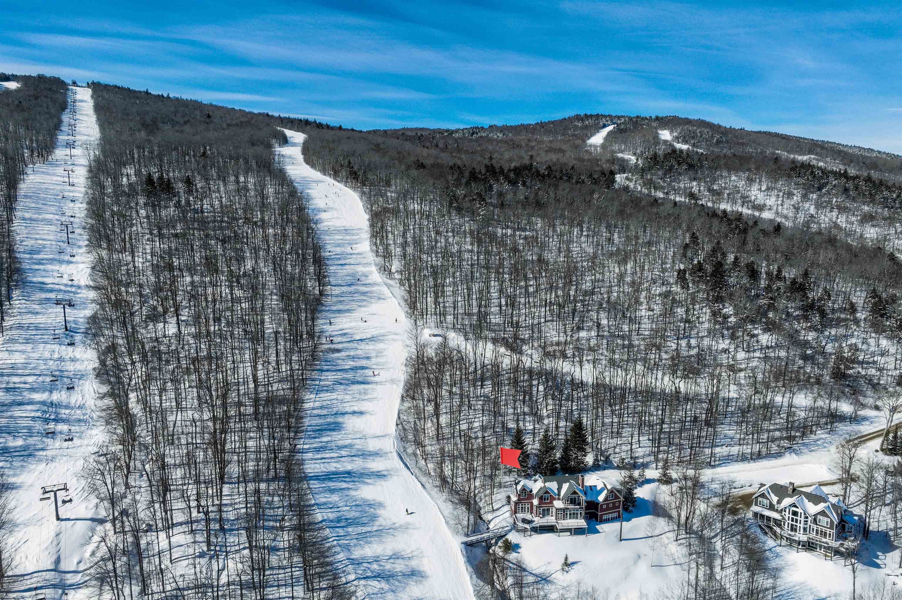 Solitude home at the top of the hill awaits! Solitude on Okemo Mountain, where this exceptional five-bedroom home captures the ultimate ski location, breathtaking long-range views, and unparalleled privacy. Perfectly positioned to embrace the beauty of the surrounding mountains, this residence offers a rare opportunity to enjoy true slope-side living in one of Vermont’s most sought-after resort communities. The main floor offers a sunken living room with views of the Okemo Valley. Off the living room is a dining room and kitchen with a large island and room for entertaining. The family room off the kitchen has a full bathroom and access to the large deck with a hot tub overlooking the ski trail. From the main floor, you can access the heated garage. Above the garage is a primary suite. The primary suite has a vaulted ceiling, a gas fireplace, a balcony, and a soaking tub with window views. The bathroom has a large shower, a double vanity, and a walk-in closet. Back down to the main level, you can access another second floor with 2 en-suites, each with a full bathroom. There is a den and a full bathroom to complete the second level. The basement area offers a full game room and family room, 2 additional bedrooms, a full bathroom, a half-court basketball room, and a mudroom, which opens to the bridge that brings you to the ski trail. The current homeowner has thoughtfully enhanced the property with numerous upgrades, including new mechanical systems and additional improvements that enhance efficiency and livability. Step outside and experience mountain living at its finest in this secluded setting, where serenity meets adventure right at your doorstep. Whether you’re relaxing after a day on the slopes or entertaining while taking in the sweeping vistas, this home delivers the very best of resort lifestyle. If you're looking for the best of the best, call us today to schedule your private showing and discover this extraordinary mountain retreat.