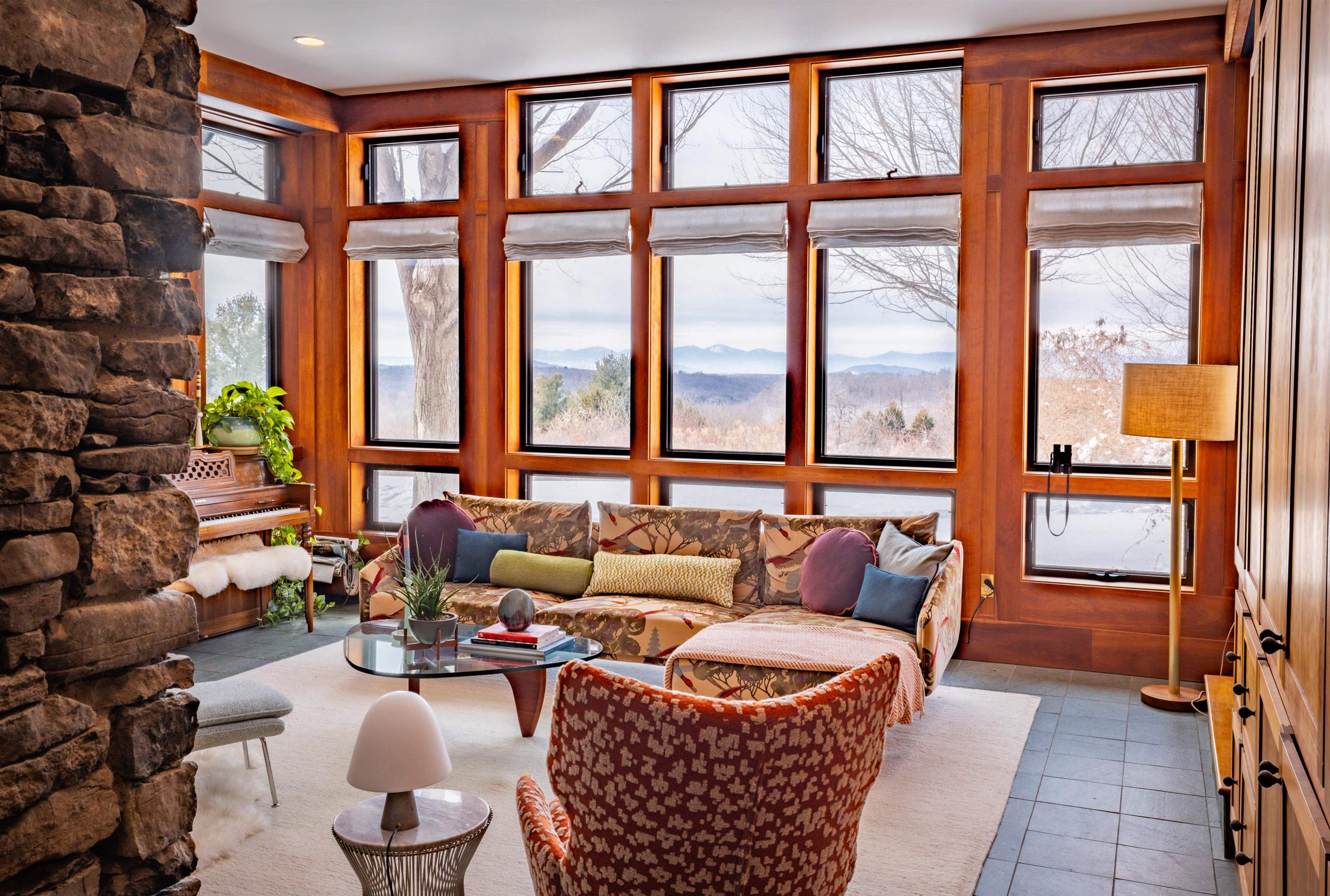 Panoramic western views of the Adirondack Mountains define this Adirondack-style residence on 8.5 private acres. Thoughtfully designed living spaces showcase natural, locally milled hardwood trim and custom-built cabinetry. Created with sustainability in mind, the home includes double insulation, triple-pane windows, solar panels, and a 5-Star Energy Star rating. Abutting walking trails connect to the village of Hinesburg, and a scenic 10-minute hike to High Rock has views of Lake Champlain. Lovingly maintained, the owners raised their family here, treasuring gatherings with wonderful neighbors to lively pizza parties around the new outdoor wood-fired oven. Extensively updated, the home features a refreshed kitchen and bathrooms, new lighting, and numerous thoughtful improvements throughout. From the inviting living room with its wall of windows to the views, custom Vermont Panton stone fireplace, to the cathedral-ceiling family room, the floor plan offers versatility and comfort. A first-floor bedroom suite is ideal for easy single-level living, while a private first-floor office enjoys peaceful views. The primary bedroom suite ensures privacy and a custom-appointed bath. The smartly designed kitchen showcases granite and marble countertops, custom shelving, a new pantry, and newer appliances. This central gathering space flows into the living, dining, and family rooms—ideal for hosting memorable celebrations. Above the garage, a finished bonus space functions as a studio or potential bedroom. Reproducing a home of this caliber at today’s construction costs would require a larger investment. Quality custom finishes and a high level of energy efficiency make this property a rare and valuable opportunity. Just five minutes to Hinesburg schools, a grocery store, and restaurants. Close to hiking the Green Mountains, sailing on Lake Champlain, and great skiing. Only 20 minutes to Burlington, this property offers the perfect blend of privacy, community, and recreation.
