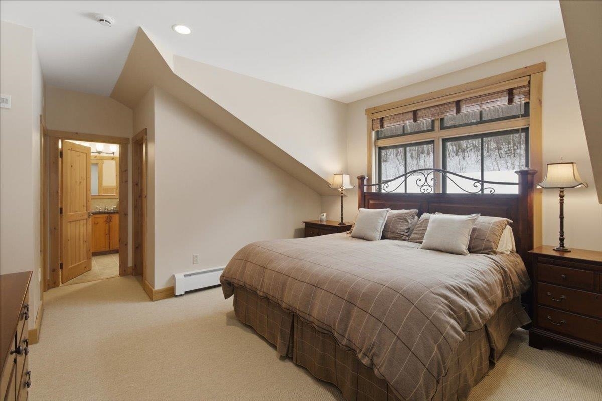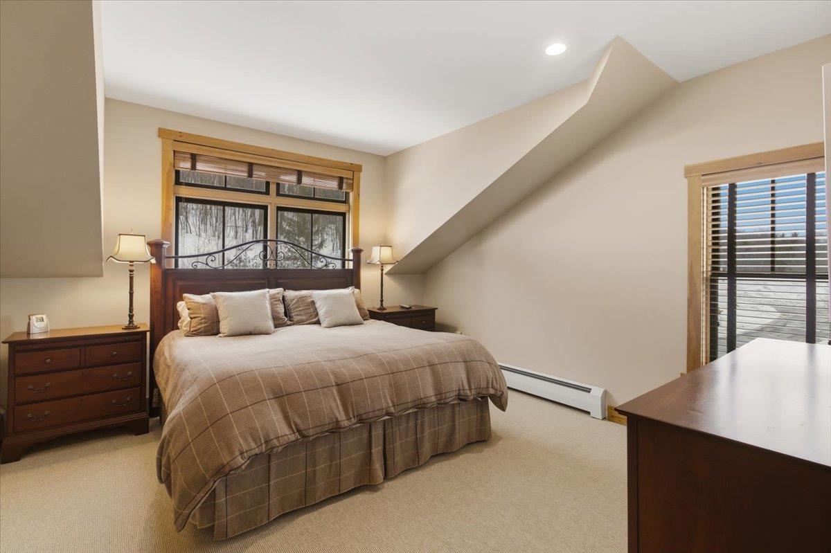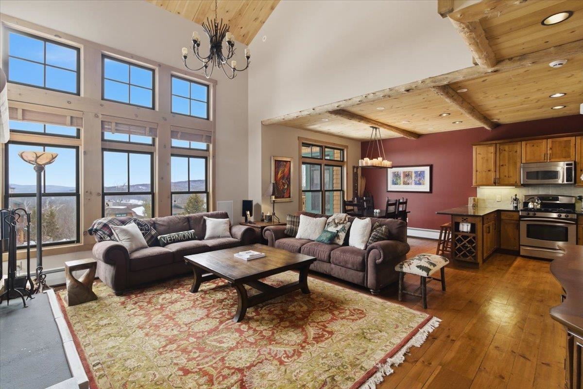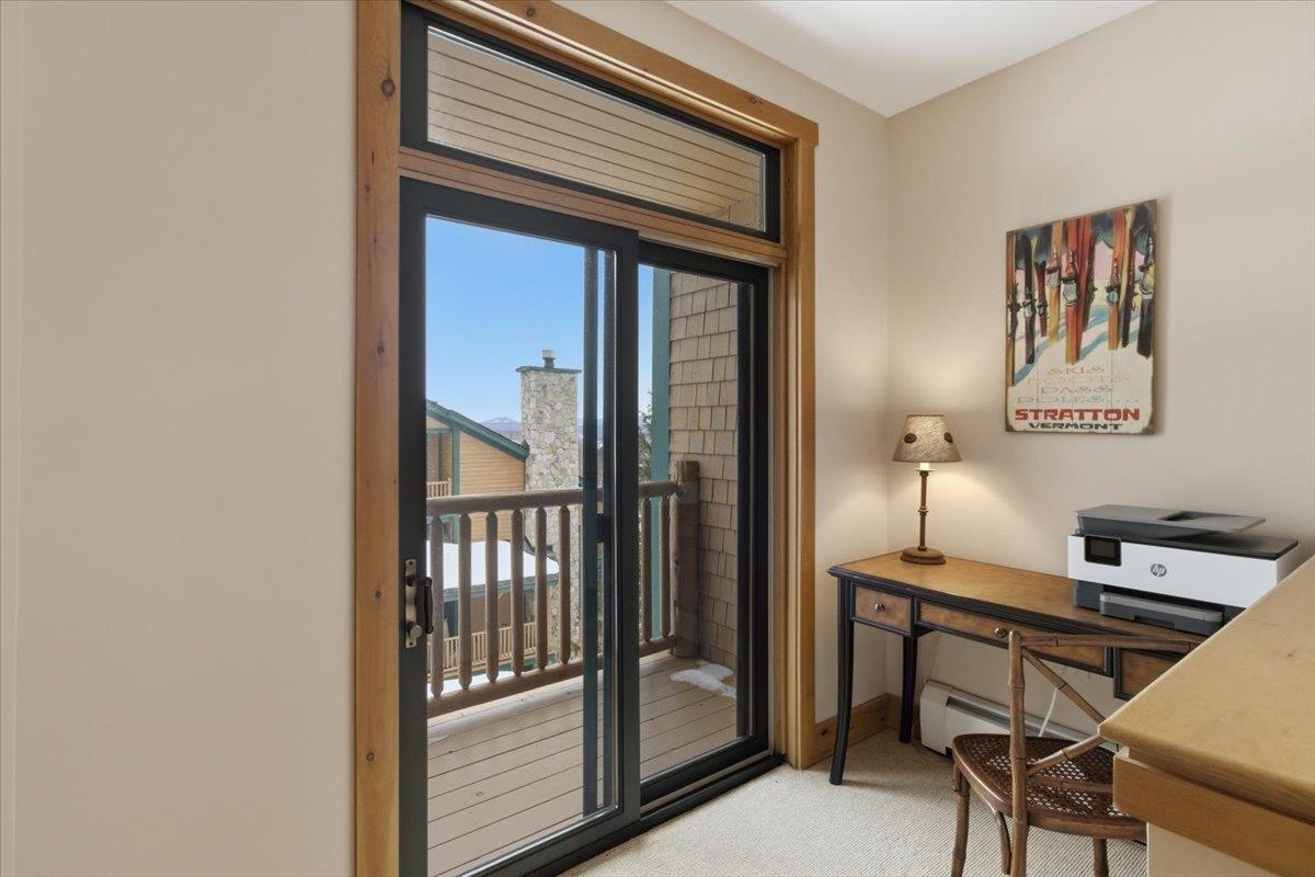 Enjoy true trailside living in this luxury four-bedroom, four-bathroom townhouse at the highly sought-after Treetop development at Stratton. With mountain views and ski-in/ski-out access, you'll spend more time skiing, less time with logistics! Inside, the open living, dining, and kitchen area reflects classic Adirondack style, creating a warm and inviting space for gathering after a day on the mountain. The kitchen island with bar seating is perfect for a quick breakfast and opens to the main living area. A covered side porch offers a quiet place to relax. The spacious primary suite features a private balcony and a small office just outside the bedroom. The thoughtful floor plan allows for private bedroom suites throughout the home. On the lower level, a generous family room opens onto a patio with a private hot tub, and the adjacent full bathroom makes this space easily function as a fourth bedroom if desired. Treetop residences feature a covered entry porch, a dedicated ski storage room, and a detached garage. Air conditioning, shuttle service, and an on-site caretaker make ownership effortless. Offered furnished. The Sports Center bond is current and transferable to the new owner (transfer fee applies). Stratton Mountain Club membership is available.