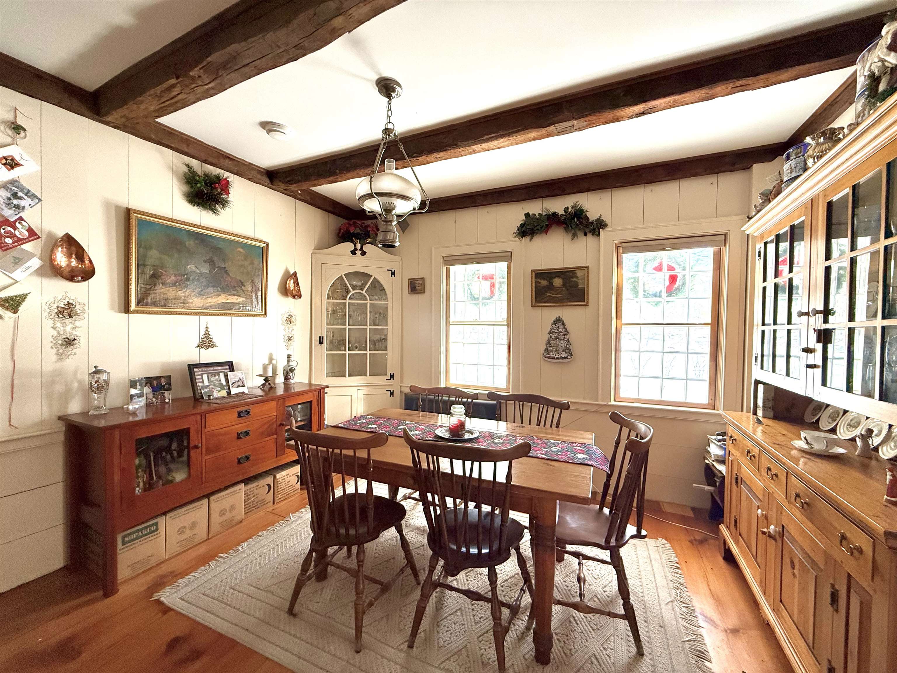 Step into timeless New England charm with this historic circa-1760s expanded Cape, offering a wonderful blend of early craftsmanship, character, and modern-day livability. The home showcases classic timber frame construction with hand hewn beams, beautiful wide plank floors, and preserved period details that create warmth and authenticity throughout every room. With three bedrooms and two full bathrooms, the layout includes a highly desirable first floor primary bedroom and bath, allowing for convenient single level living while still providing flexible space for family, guests, or a home office. Set on an expansive 15.55 acre parcel, the property captures scenic mountain views, open space, and a peaceful rural setting. The land features 47 established blueberry bushes and offers endless possibilities for gardening, agricultural pursuits, equestrian use, or simply enjoying the privacy and natural beauty of the countryside. A fantastic paved driveway provides easy year round access and leads to an oversized four car garage with abundant space for vehicles, tools, and storage. In addition, a separate three and a half car garage and a large barn greatly enhance the property's versatility, making it ideal for car collectors, hobbyists, workshops, creative studios, or expanded storage needs. One of the most captivating features is the large scenic pond, complete with a charming, renovated boathouse perfect for peaceful mornings with coffee, quiet afternoons by the water, or memorable outdoor gatherings with friends and family. Ideally located just 10 minutes from the base of Mount Ascutney for hiking and year-round outdoor adventure, and within 25 minutes of Okemo Mountain and other ski destinations, this unique property offers the perfect balance of historic character, natural beauty, and recreation.